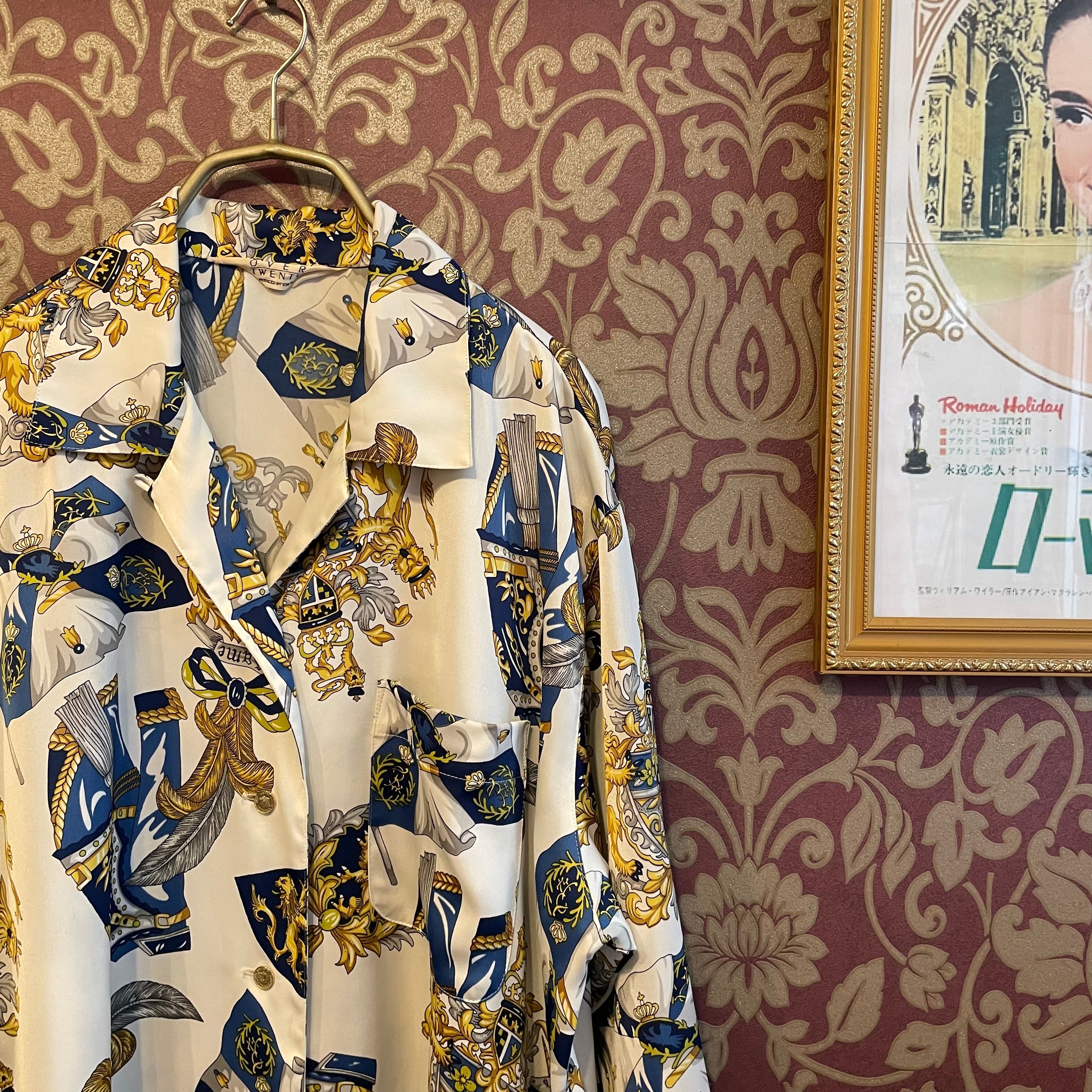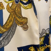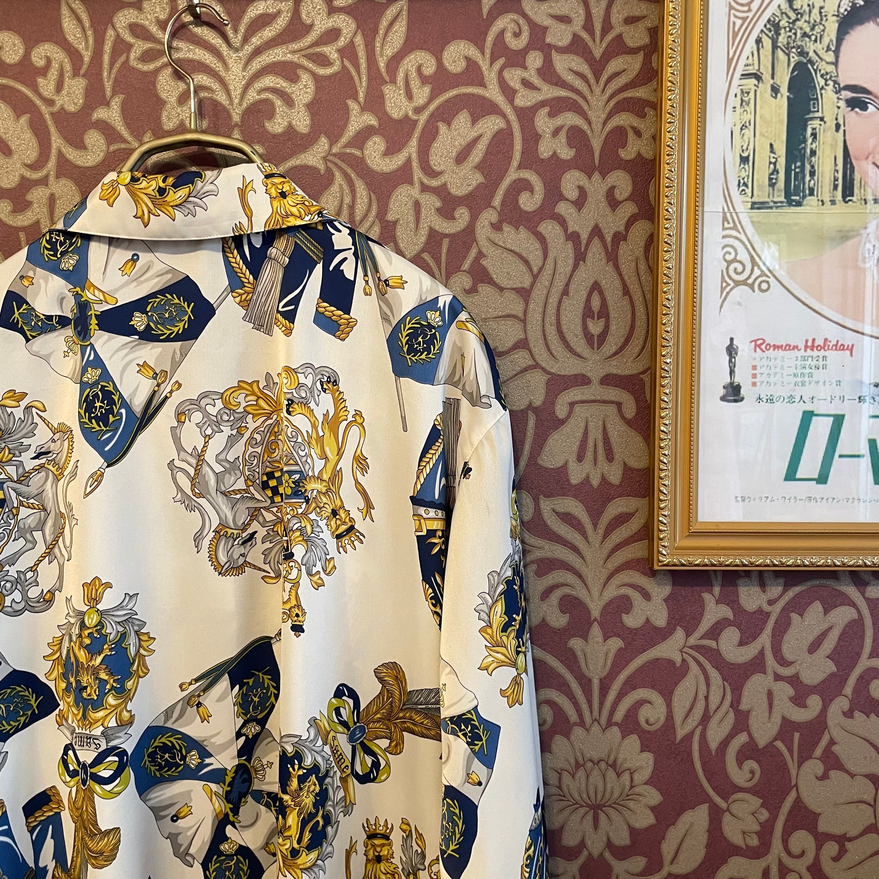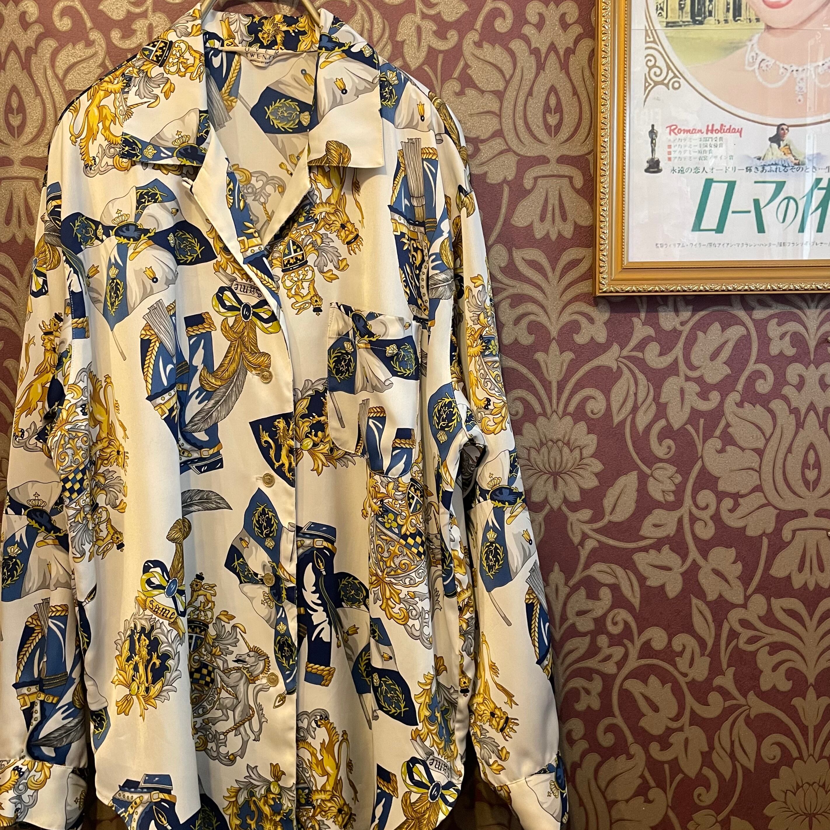 白地に青とゴールド、シルバーの旗や紋章などの豪華な柄のブラウスです。