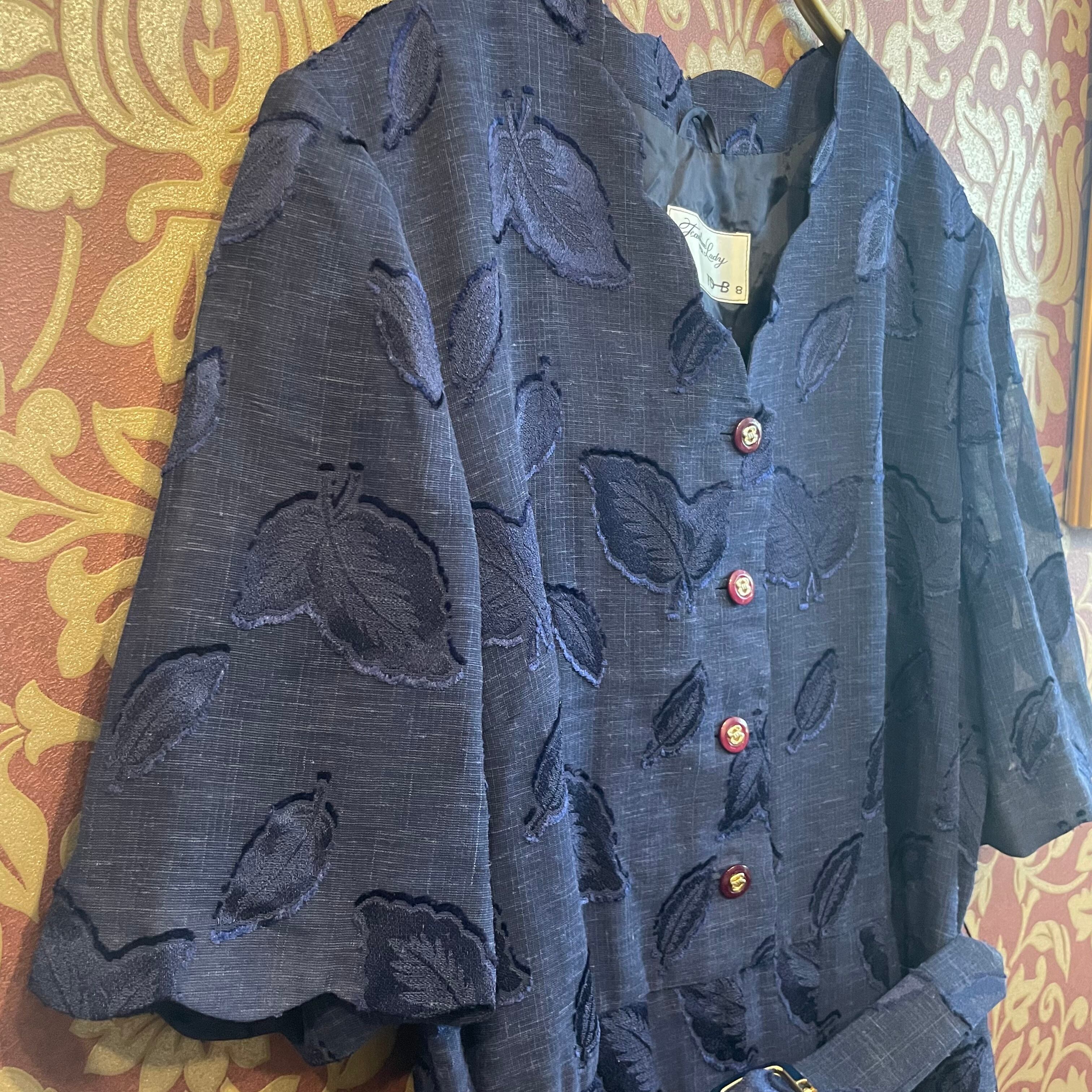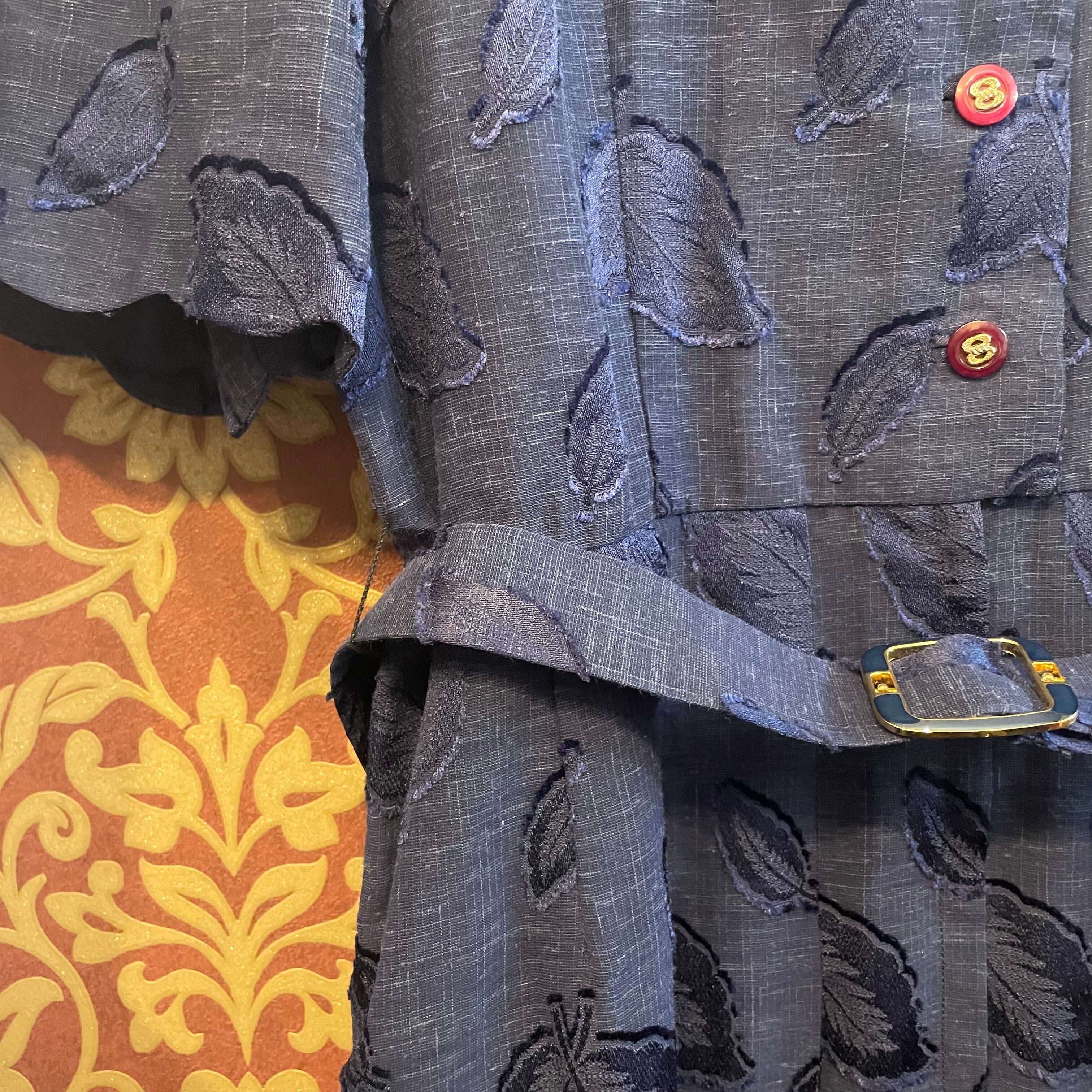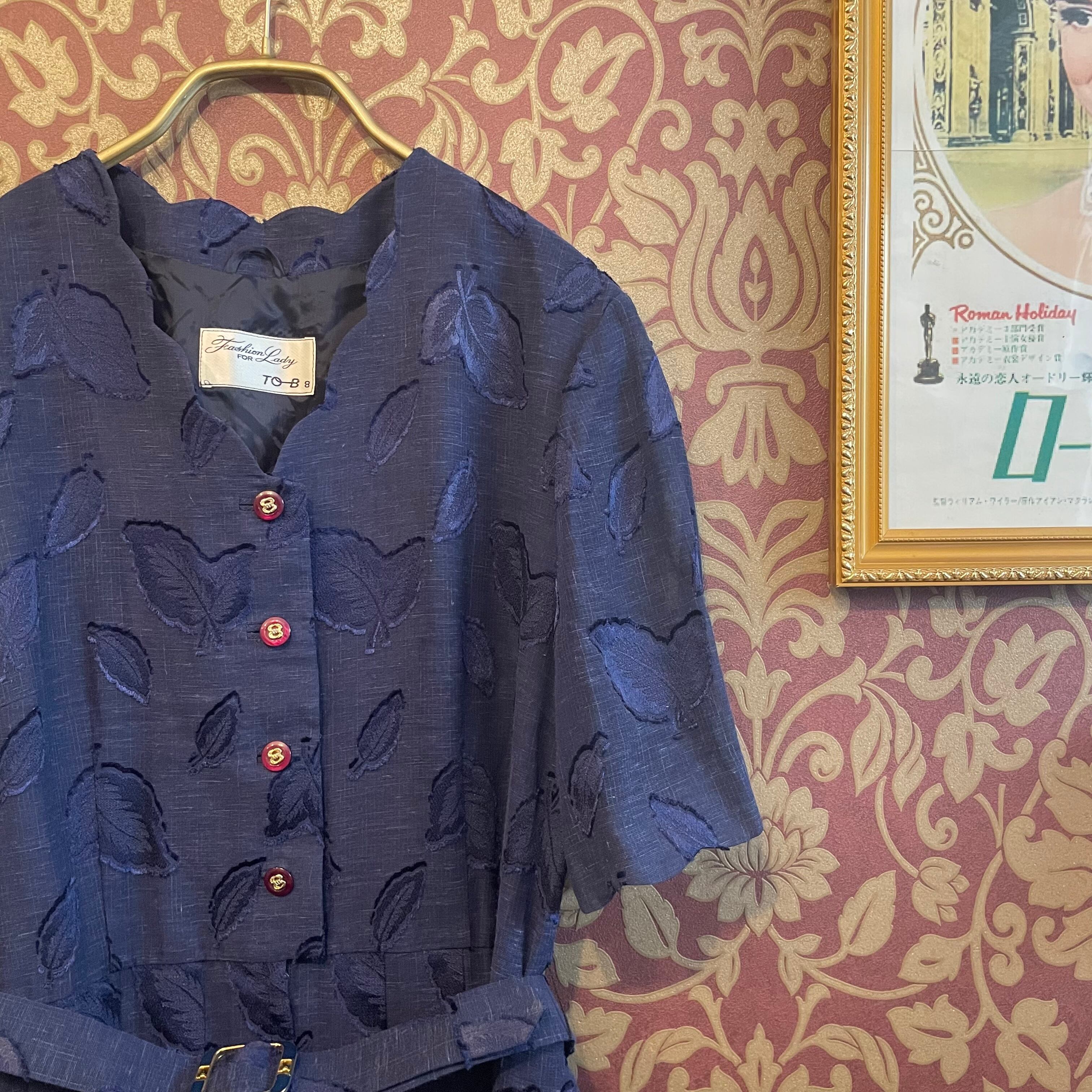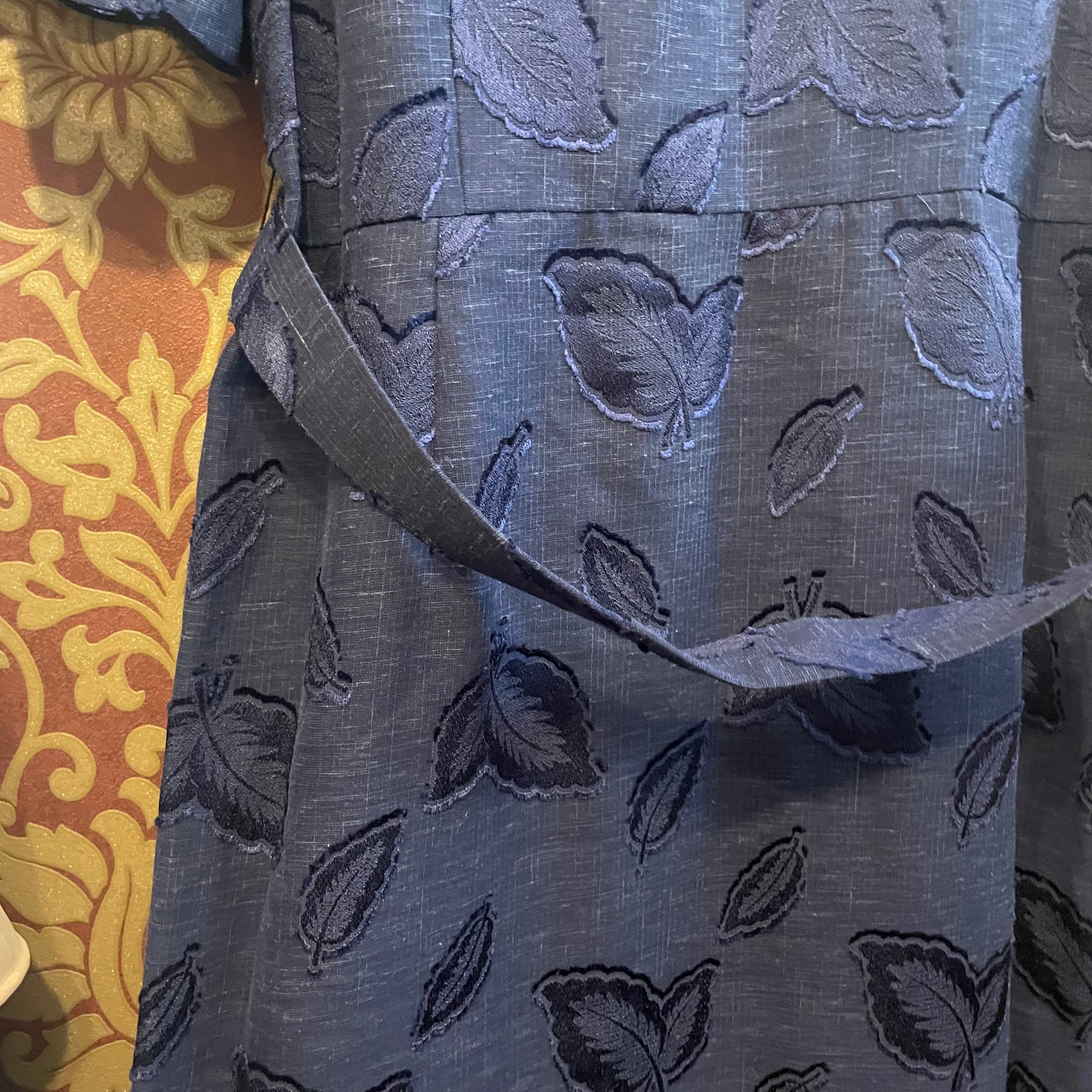 紺地に大きな葉っぱが織り込まれたジャガードのワンピースです。