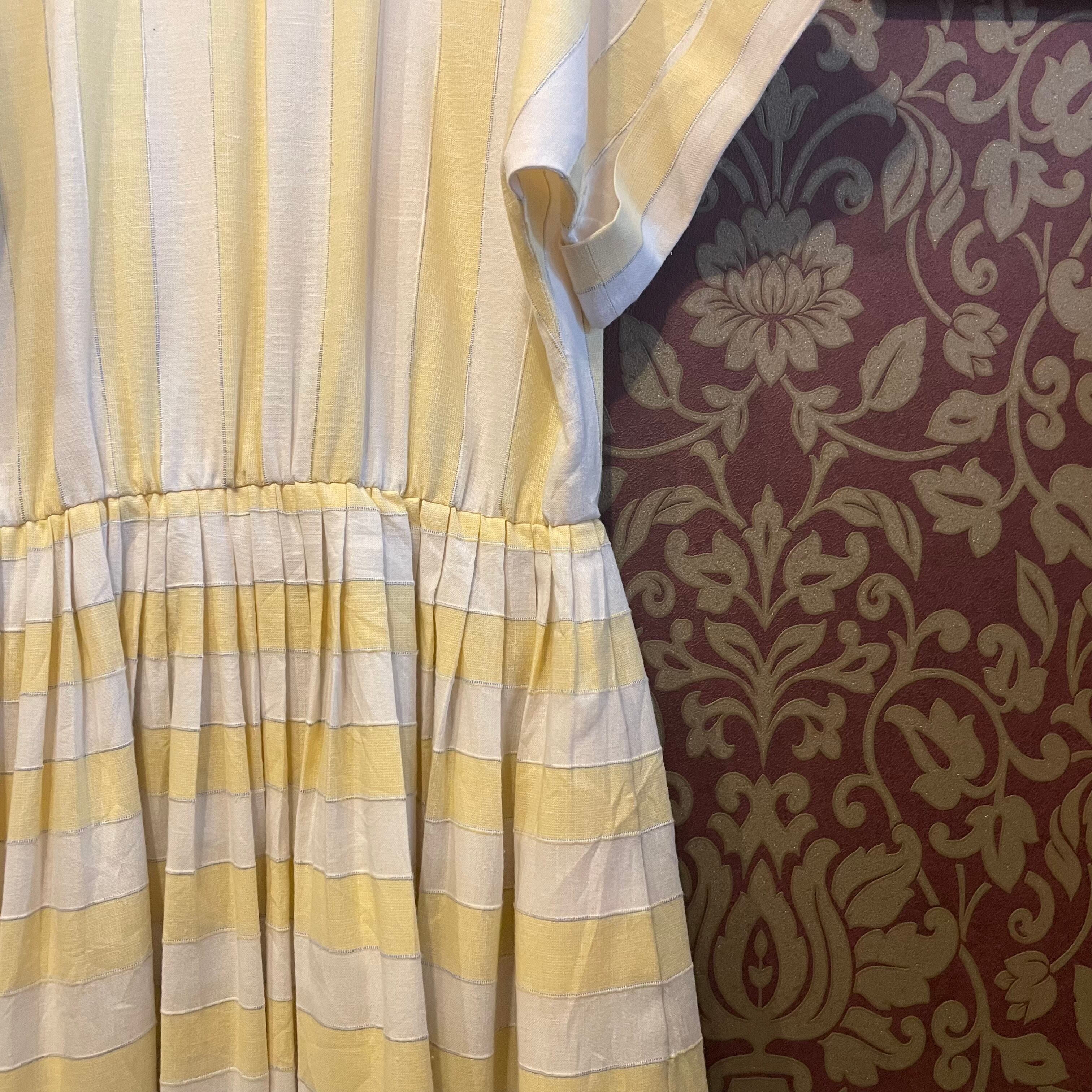 アメリカより輸入したヴィンテージの淡い黄色と白、水色のマルチストライプ柄ワンピースです。