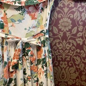 全体がピンクベージュのバラ柄で、ウエストはV字の切り替え、ウエストにはリボンが付いていてとにかくロマンチックなデザインです。
