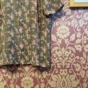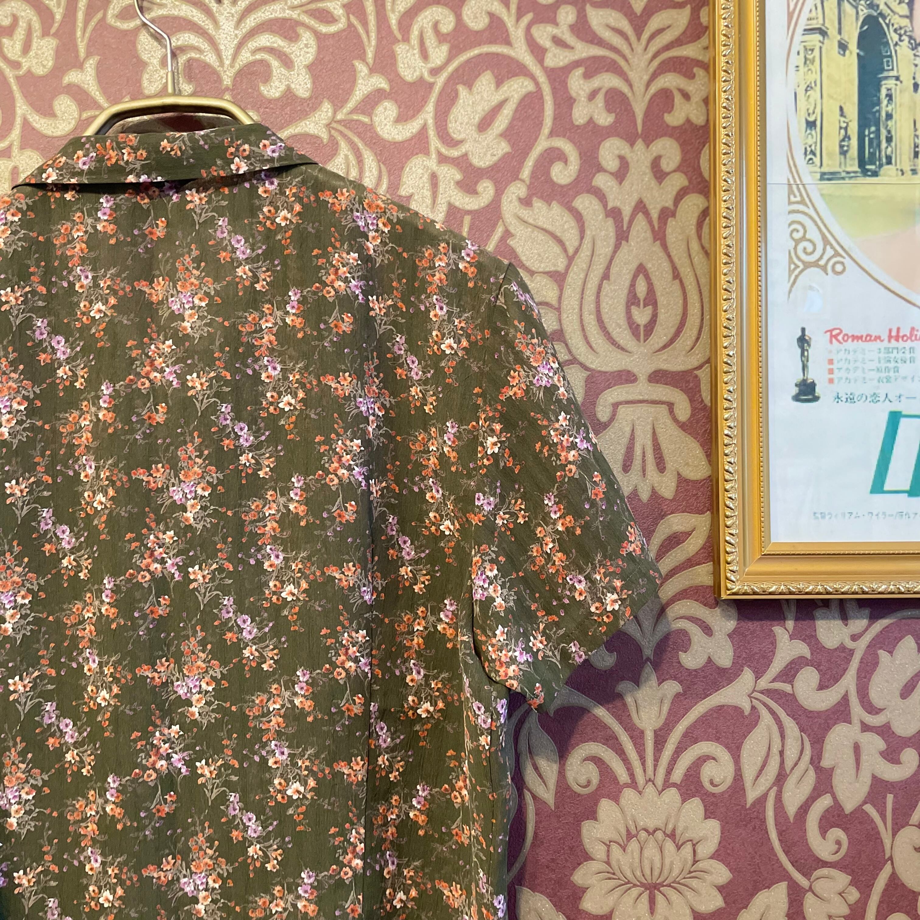 モスグリーン地にオレンジと紫の小花柄のセットアップです。