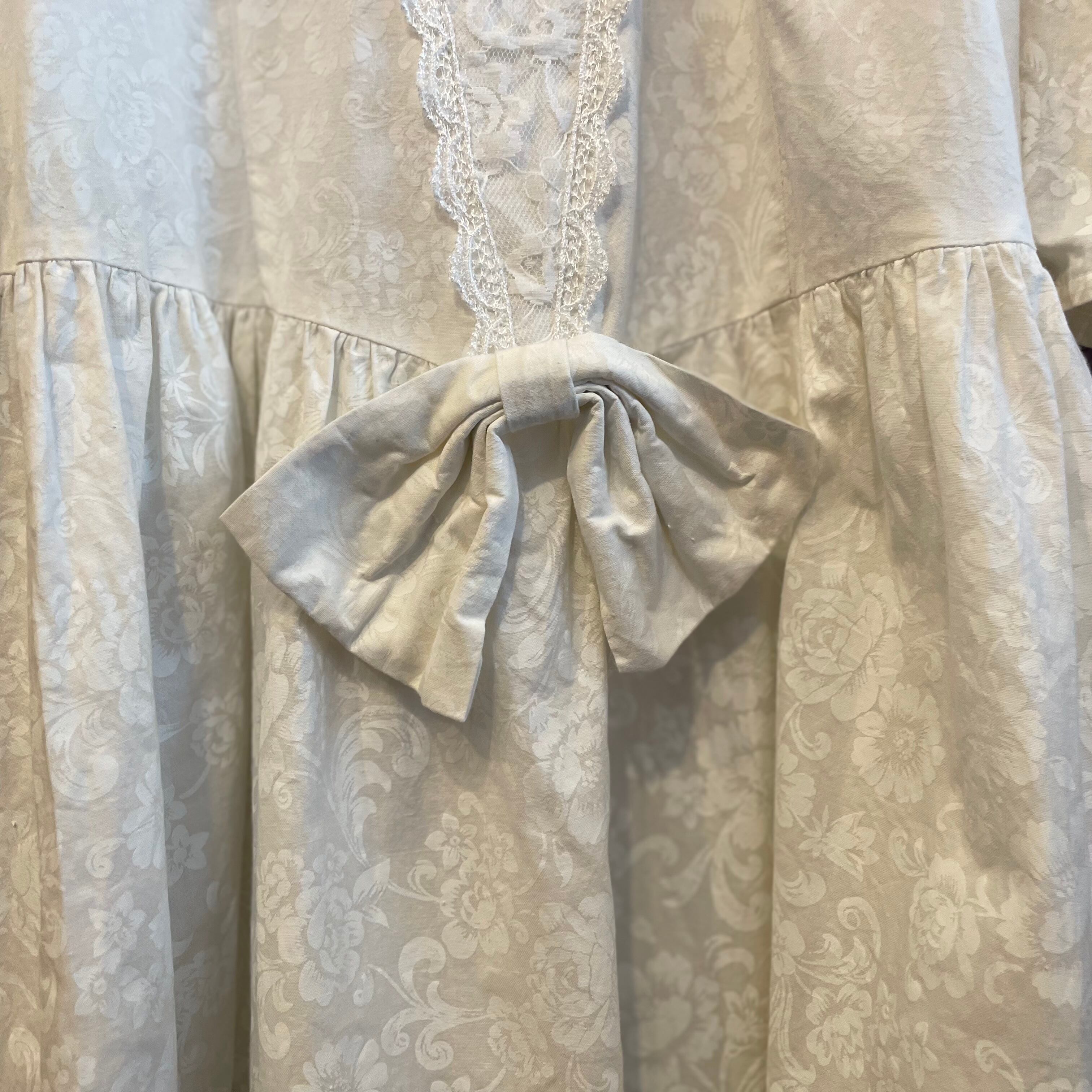 袖はパフスリーブで上身頃はヴィンテージらしい細かな作り、ウエストにはリボンが付いていてとても可愛らしいデザインです。