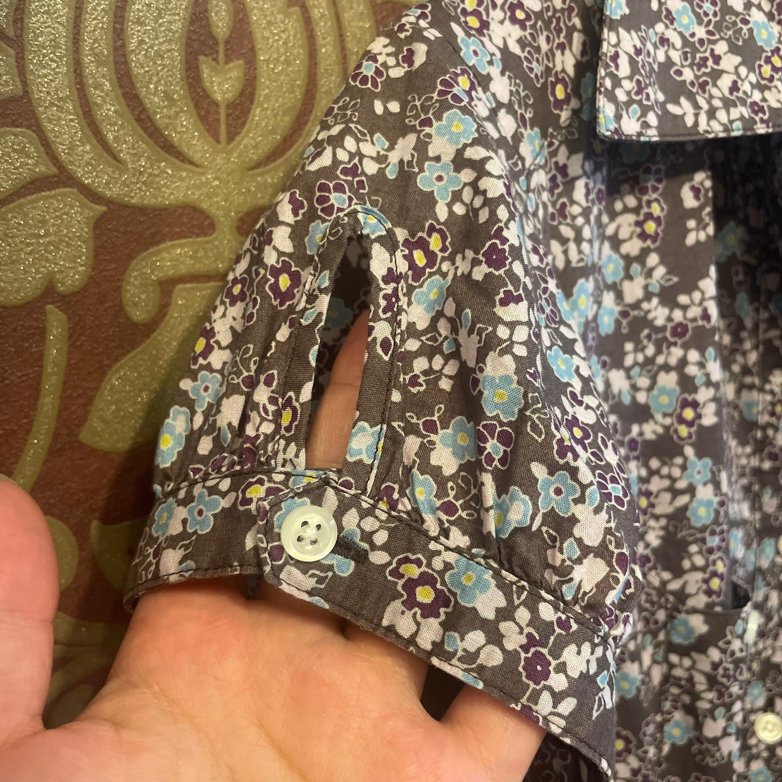 紫がかったグレーをベースにピンク、紫、青の花柄の生地が使われています。