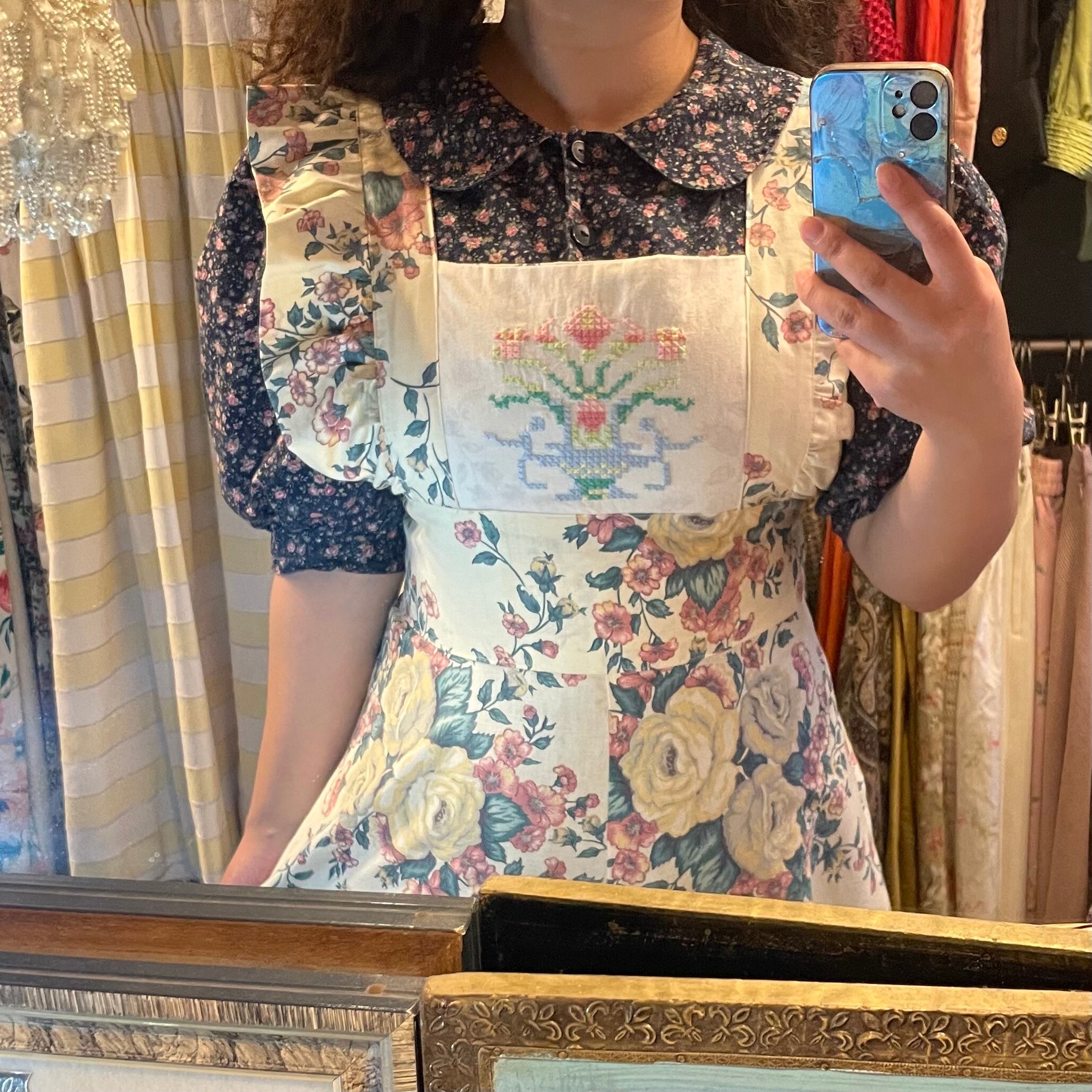 70年代らしいハイウエストのマキシ丈にし、胸にはヴィンテージワンピースのクロスステッチ部分を切り取り使いました。