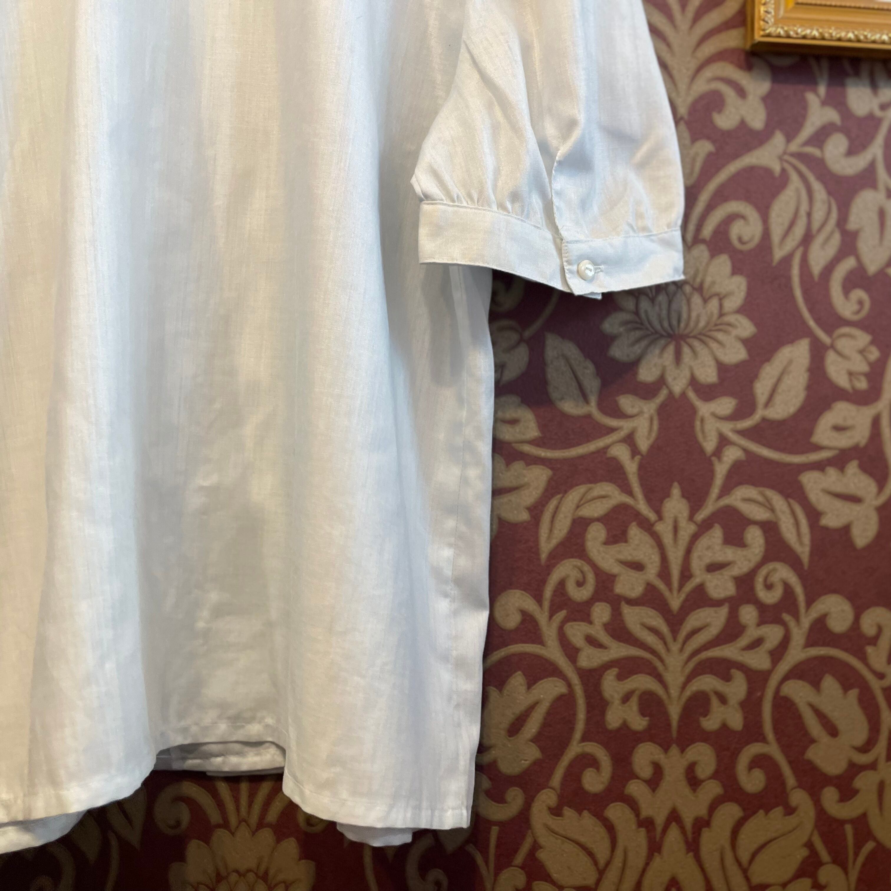 落ち着きのあるカラーに花の刺繍が施された丸襟と、丁寧に寄せられたギャザーが美しいパフスリーブで繊細で可愛らしい一着です。