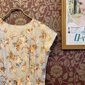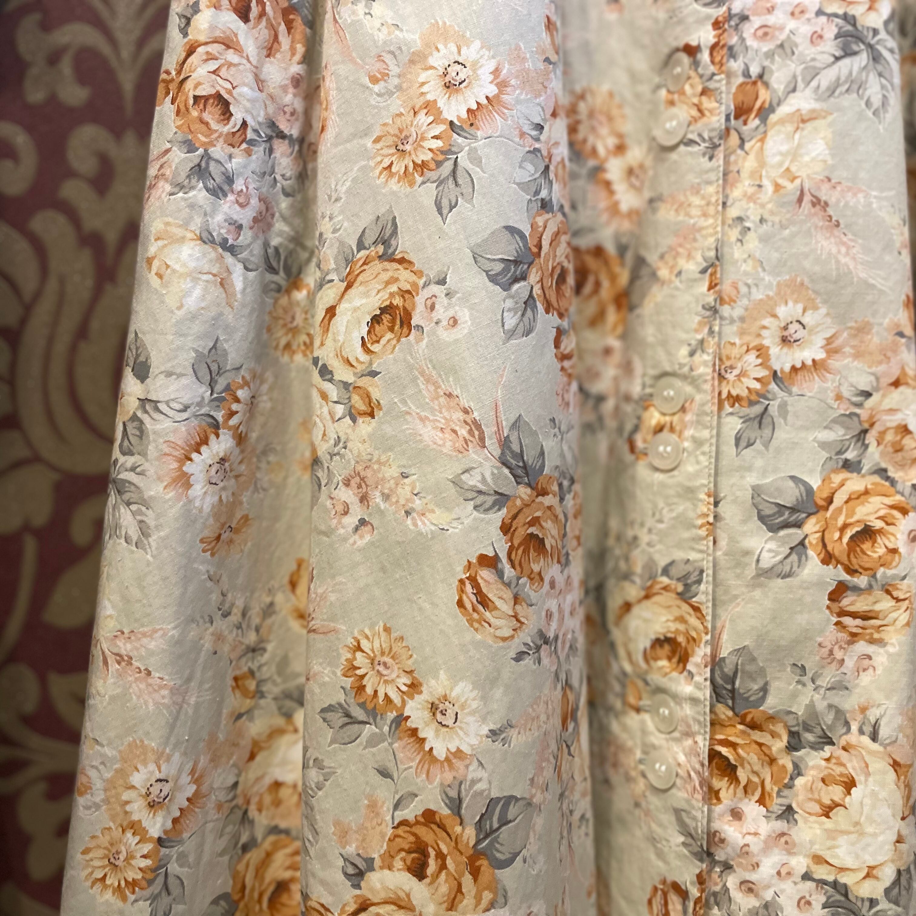 微かに緑がかったようなベージュにオレンジピンクのバラ柄のワンピースです。