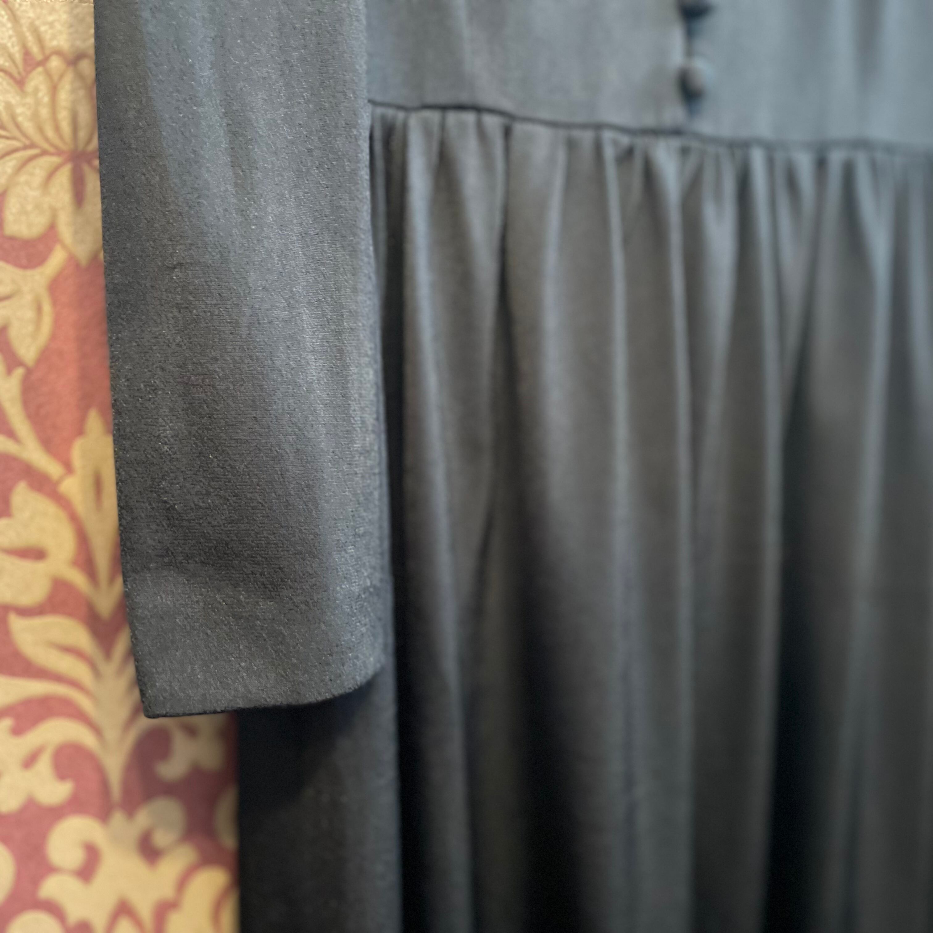 襟はラッフルカラーでフロントにはくるみボタン、袖口にもくるみボタンが付いていて細かなディテールが美しいです。