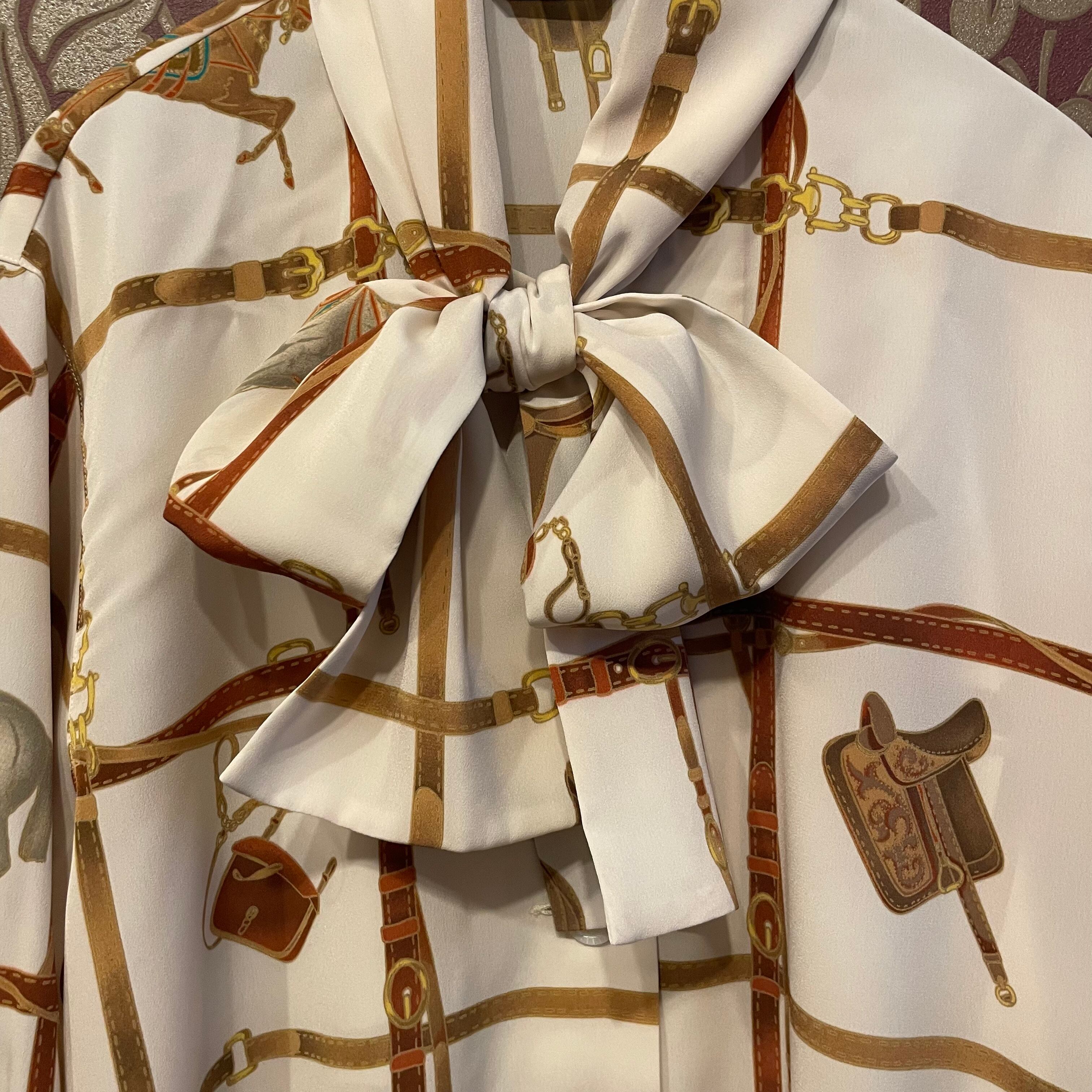 白地に茶色を基調とした柄のボウタイブラウスです。