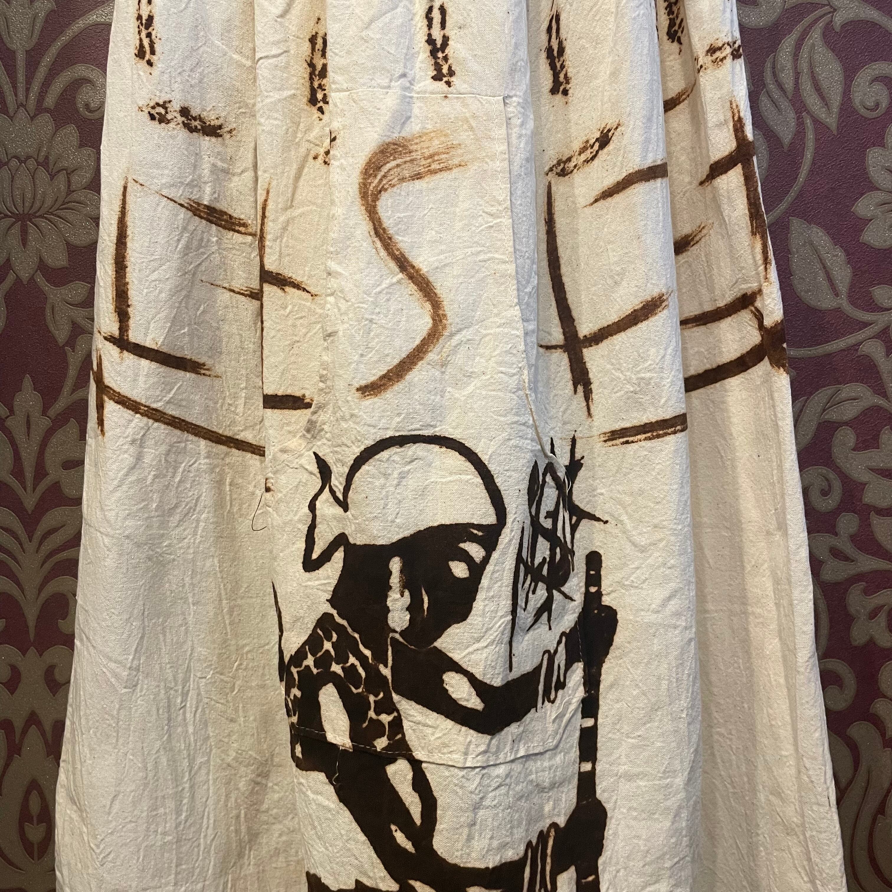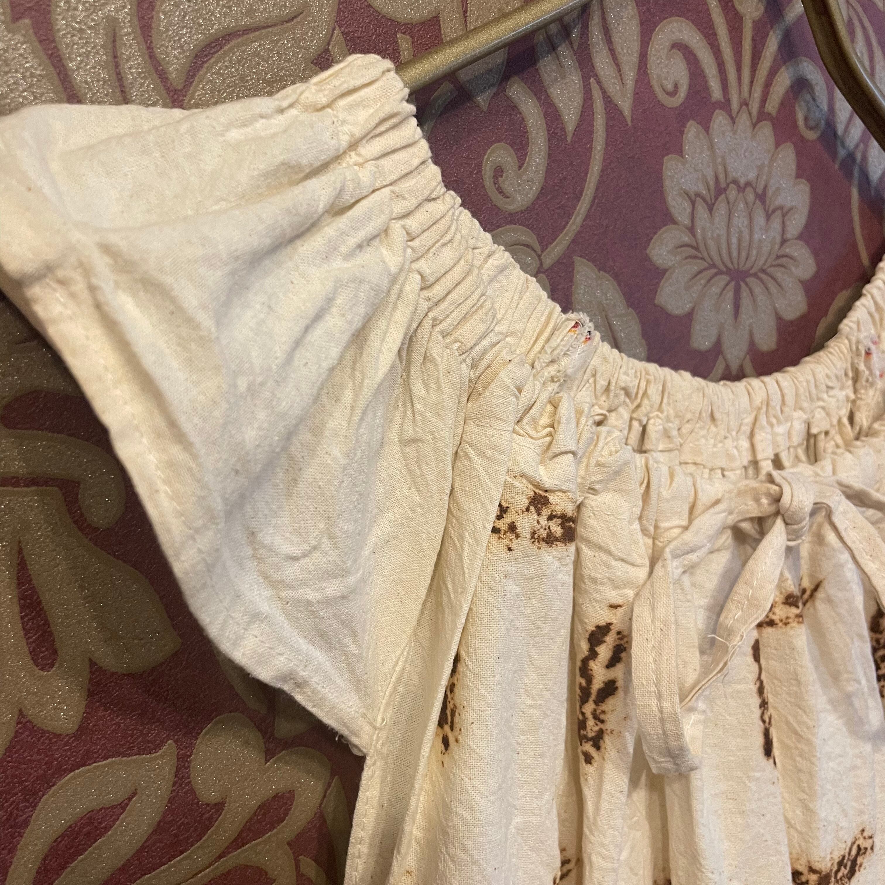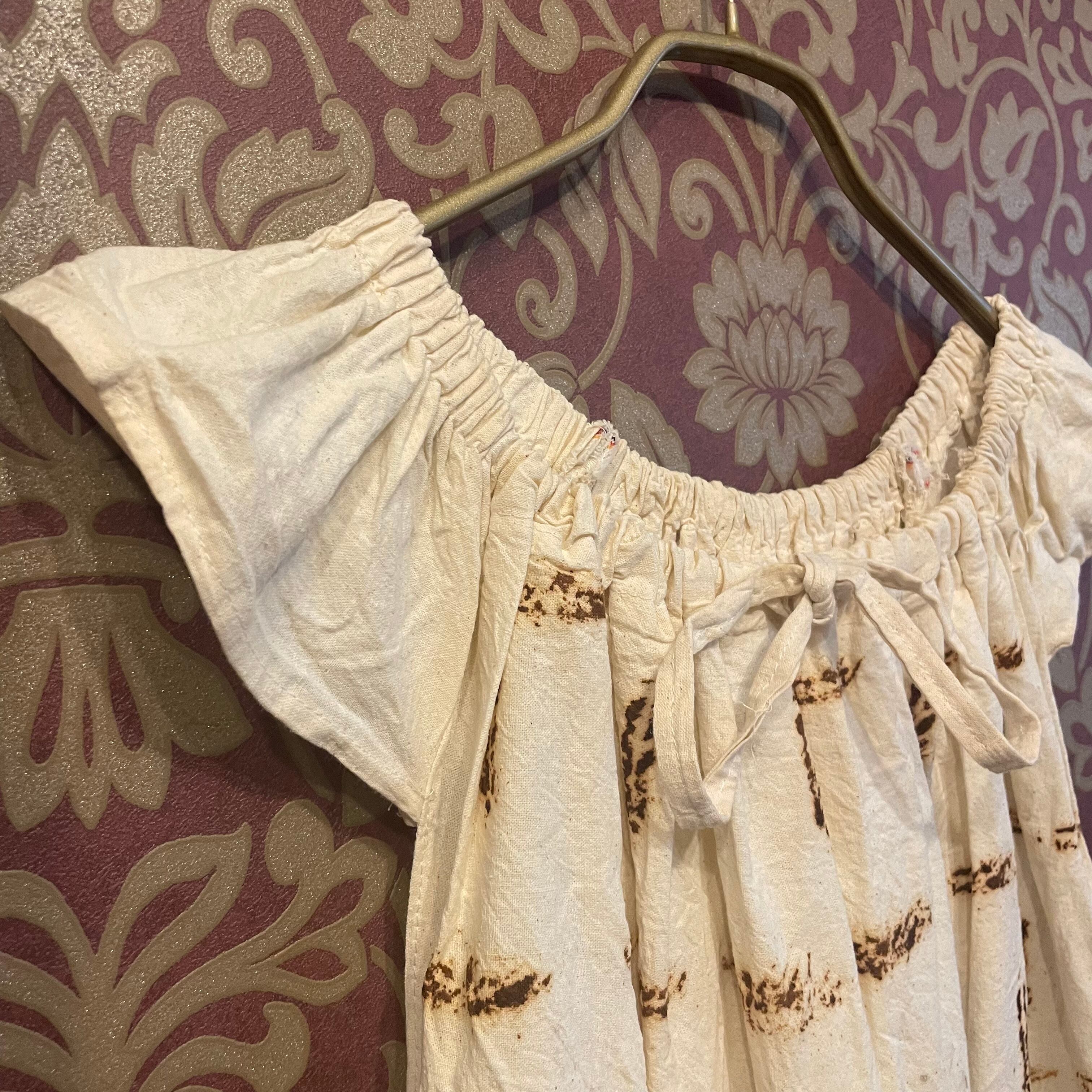 生成りに土のような茶色のペイントが施されたワンピースです。