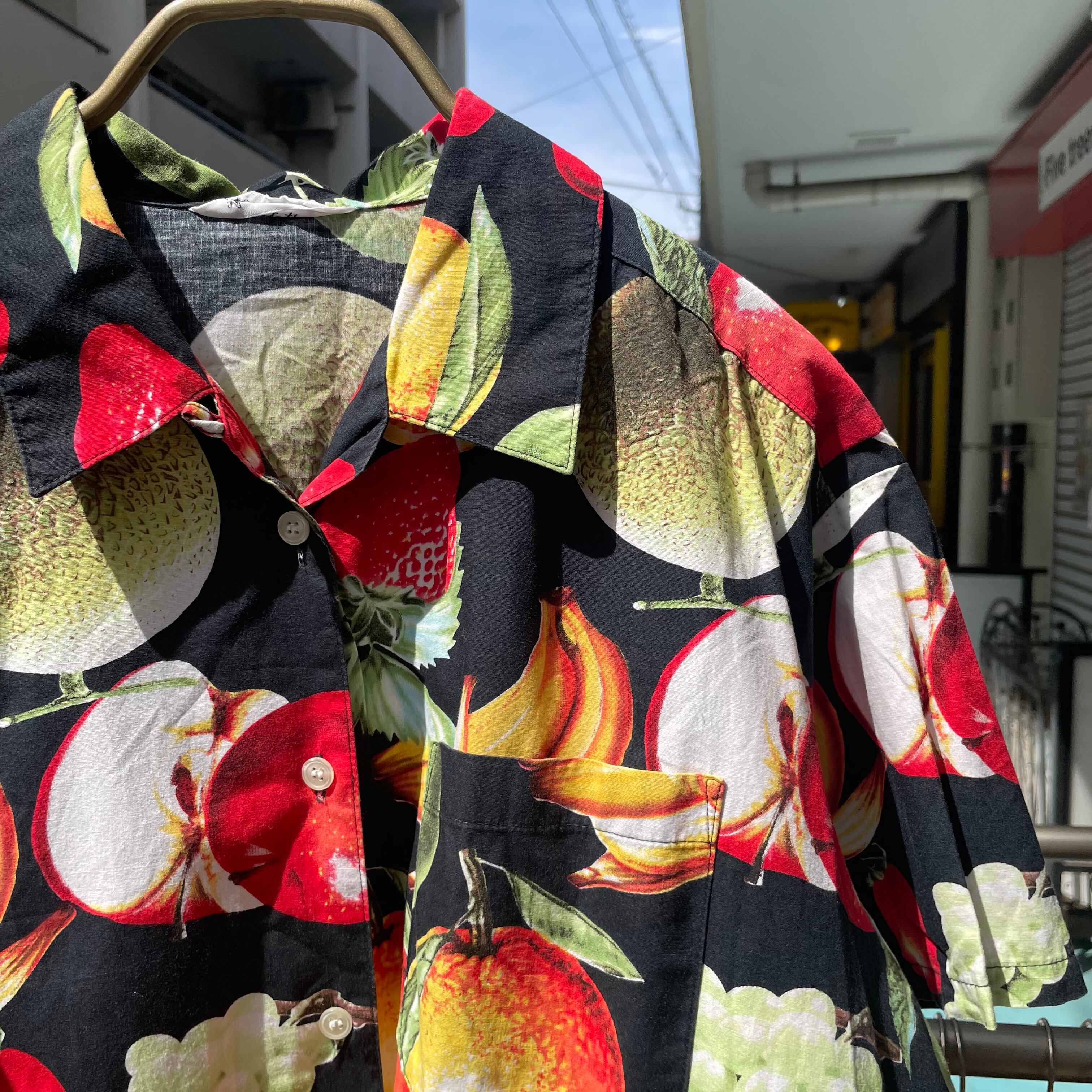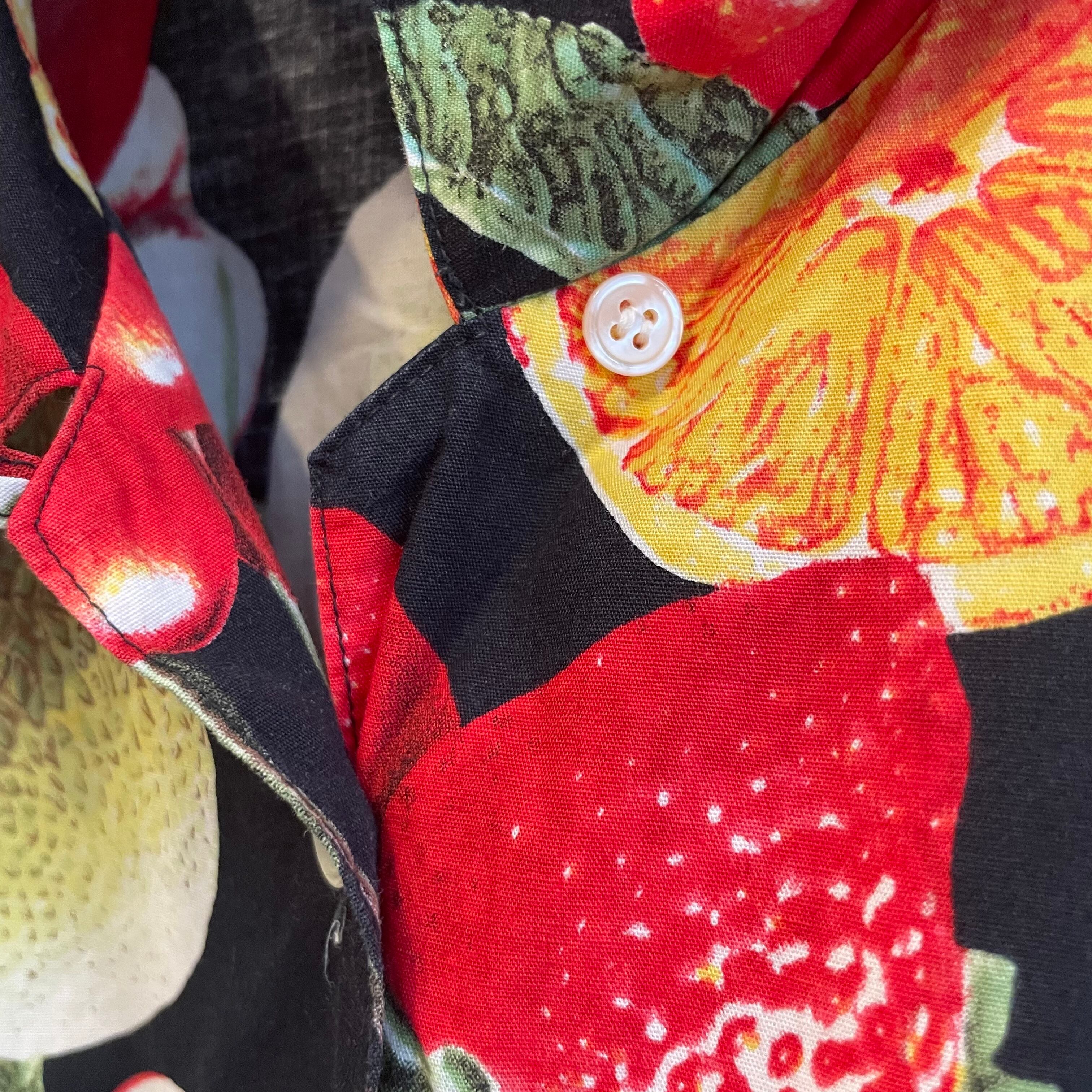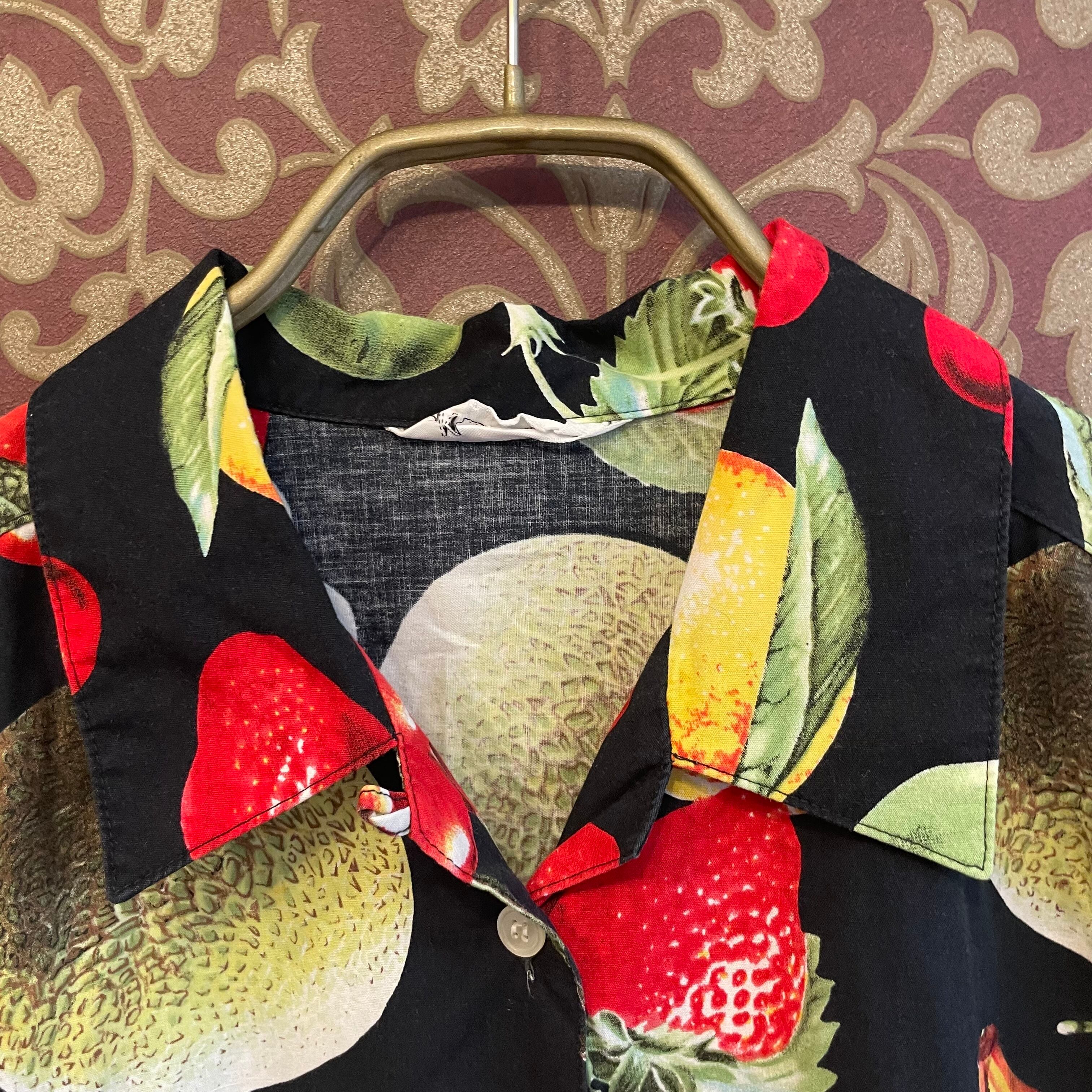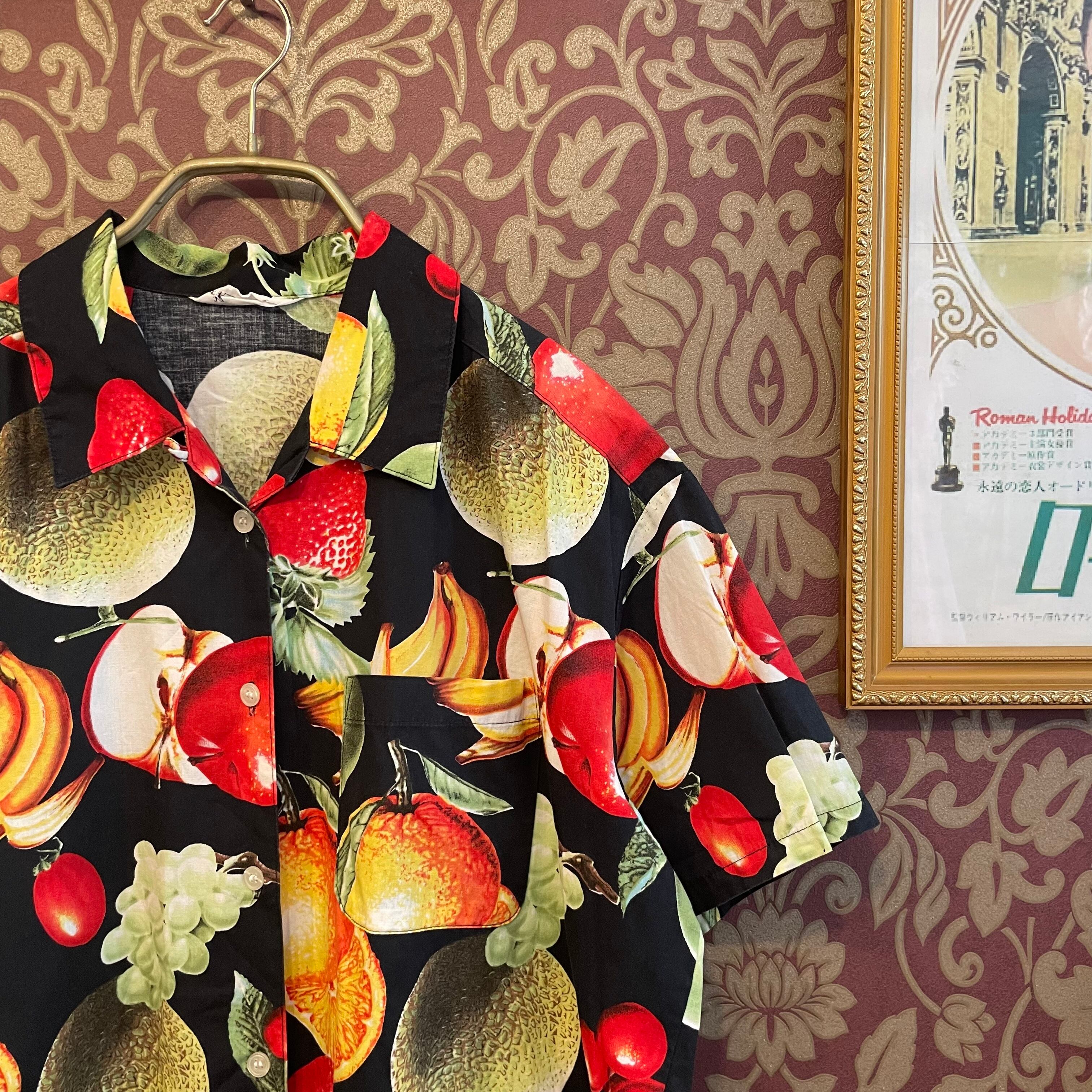 黒地にフレッシュなりんごやいちご、バナナ、メロン、マスカット、トマト、オレンジなどたくさんのフルーツと野菜で構成されています。