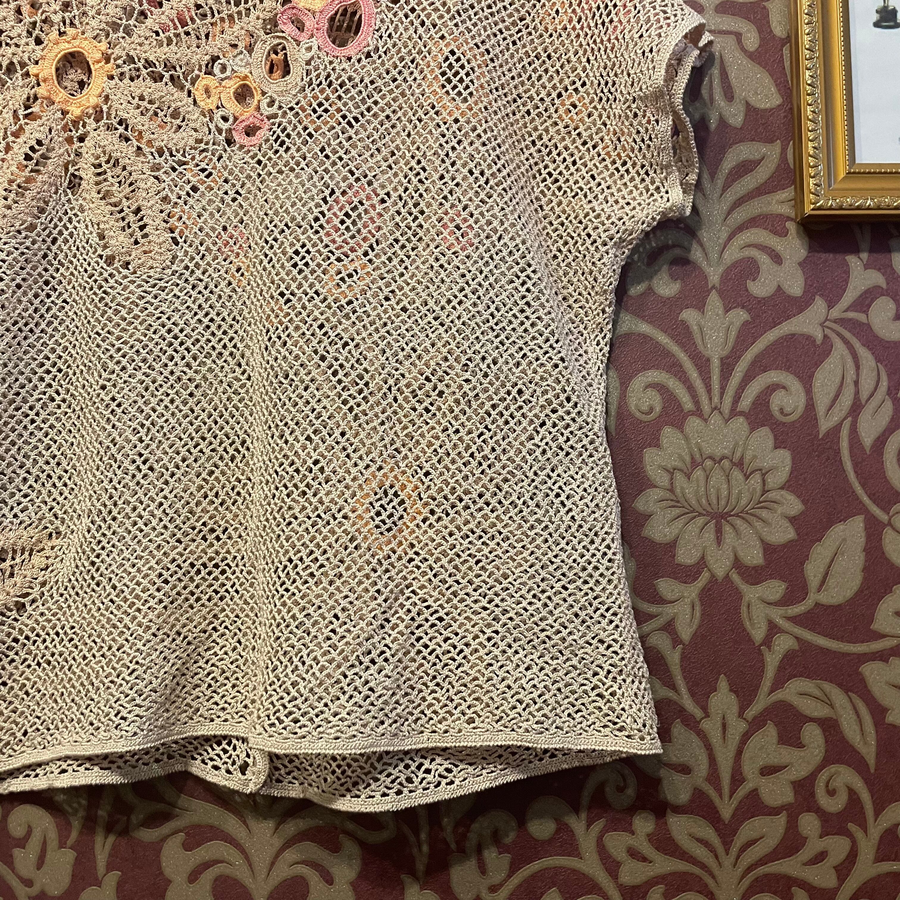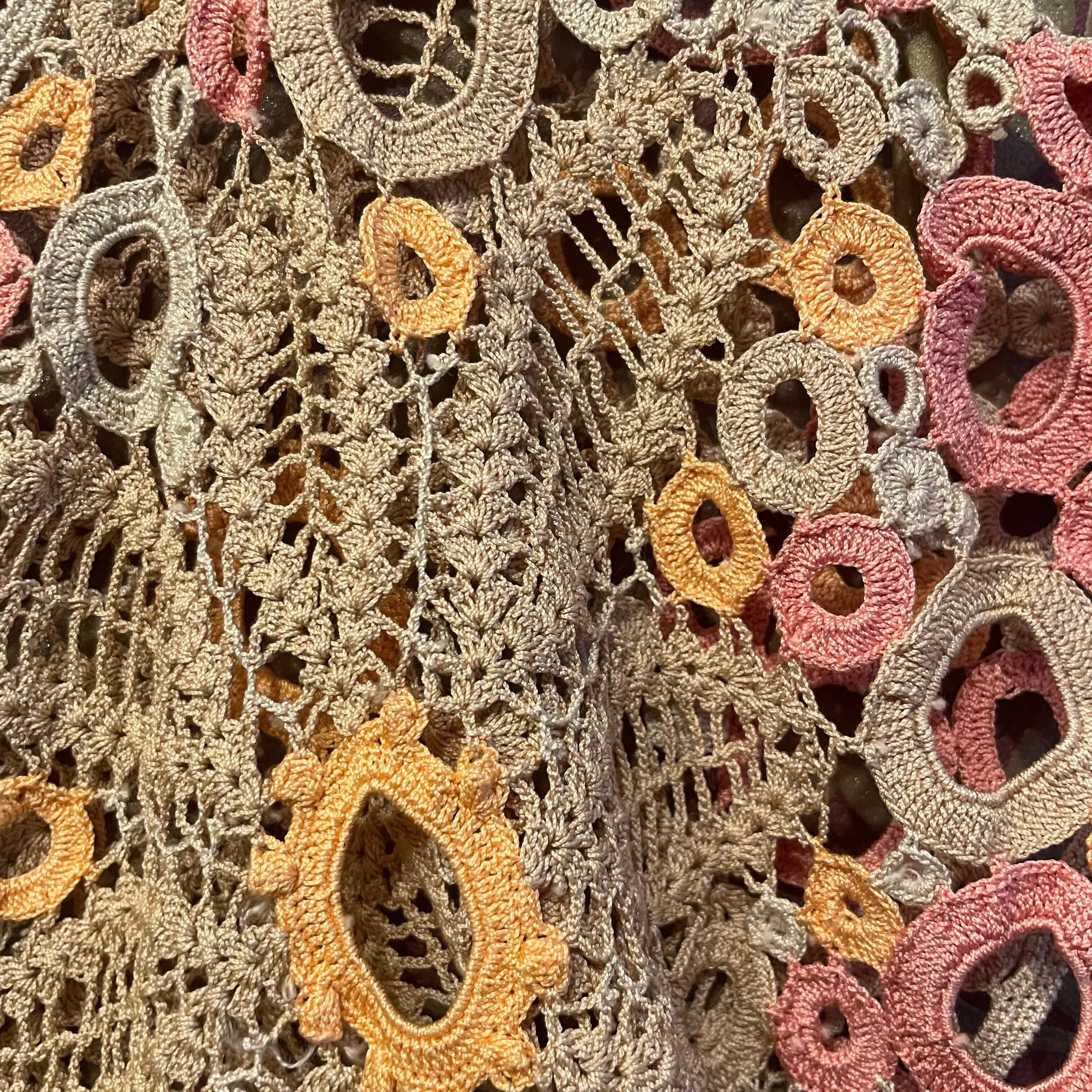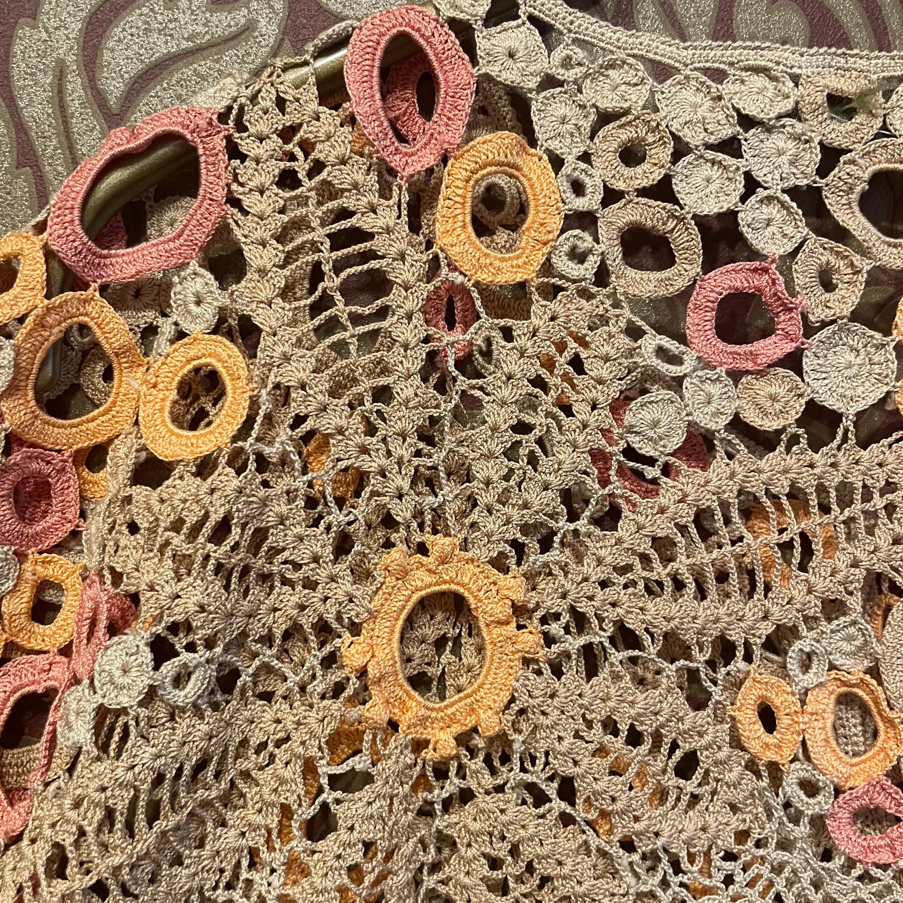 細くしっかりとしたアイボリーの糸で丁寧に編み上げられていて、大きな花モチーフと間を埋めるように敷き詰められたカラフルなサークルが美しい一着です。