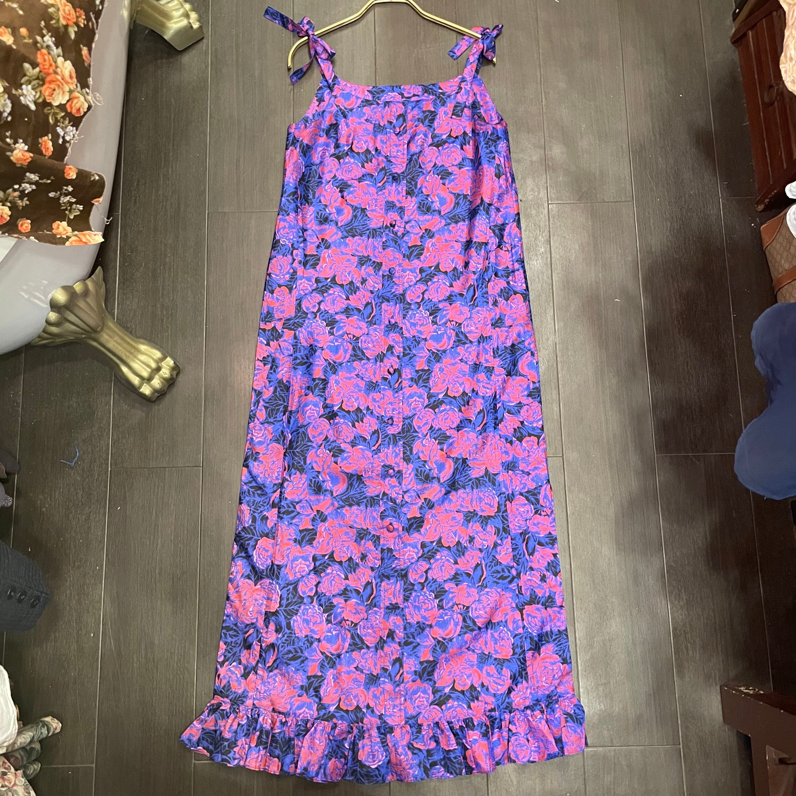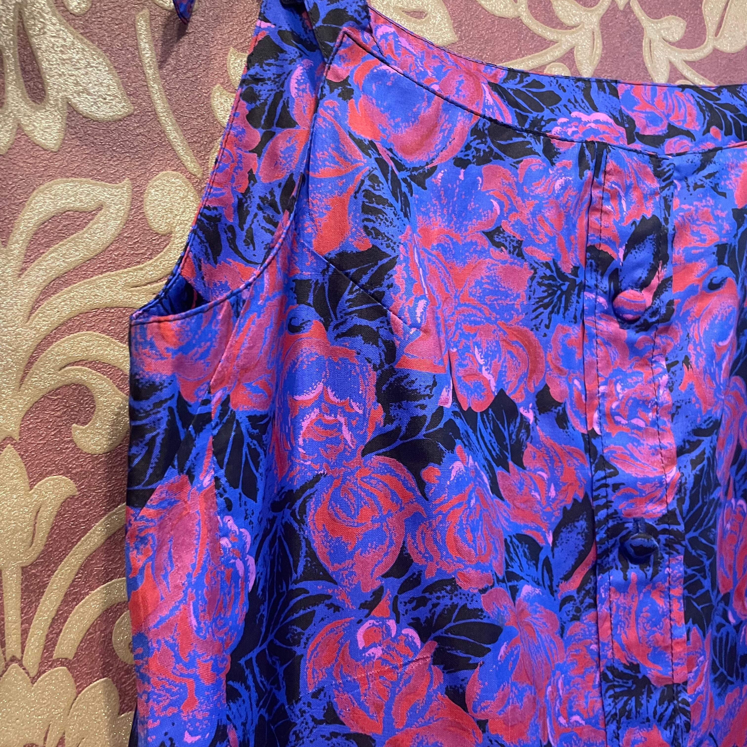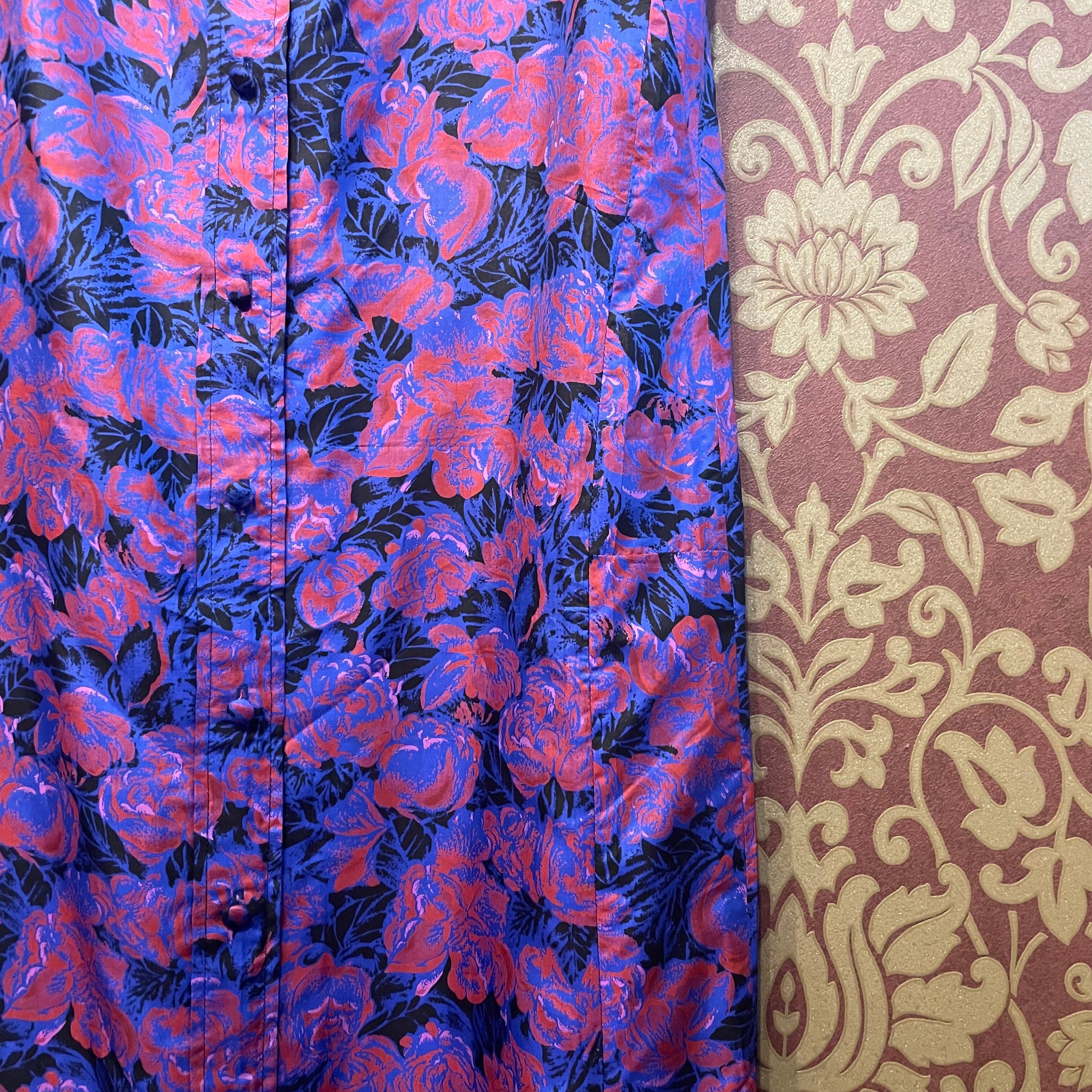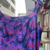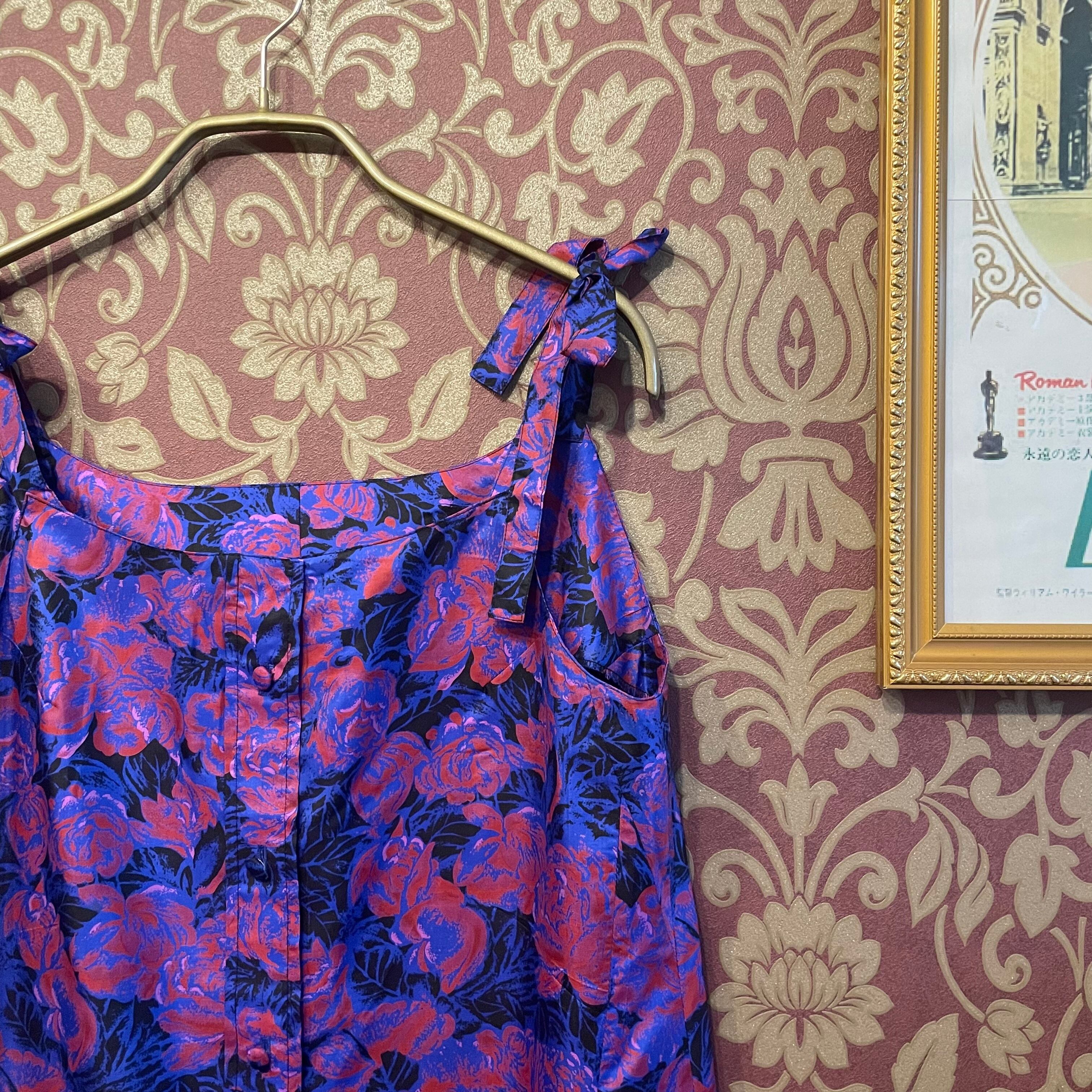 紺、紫、赤、黒で構成されたマーブル模様のようなバラ柄のワンピースです。