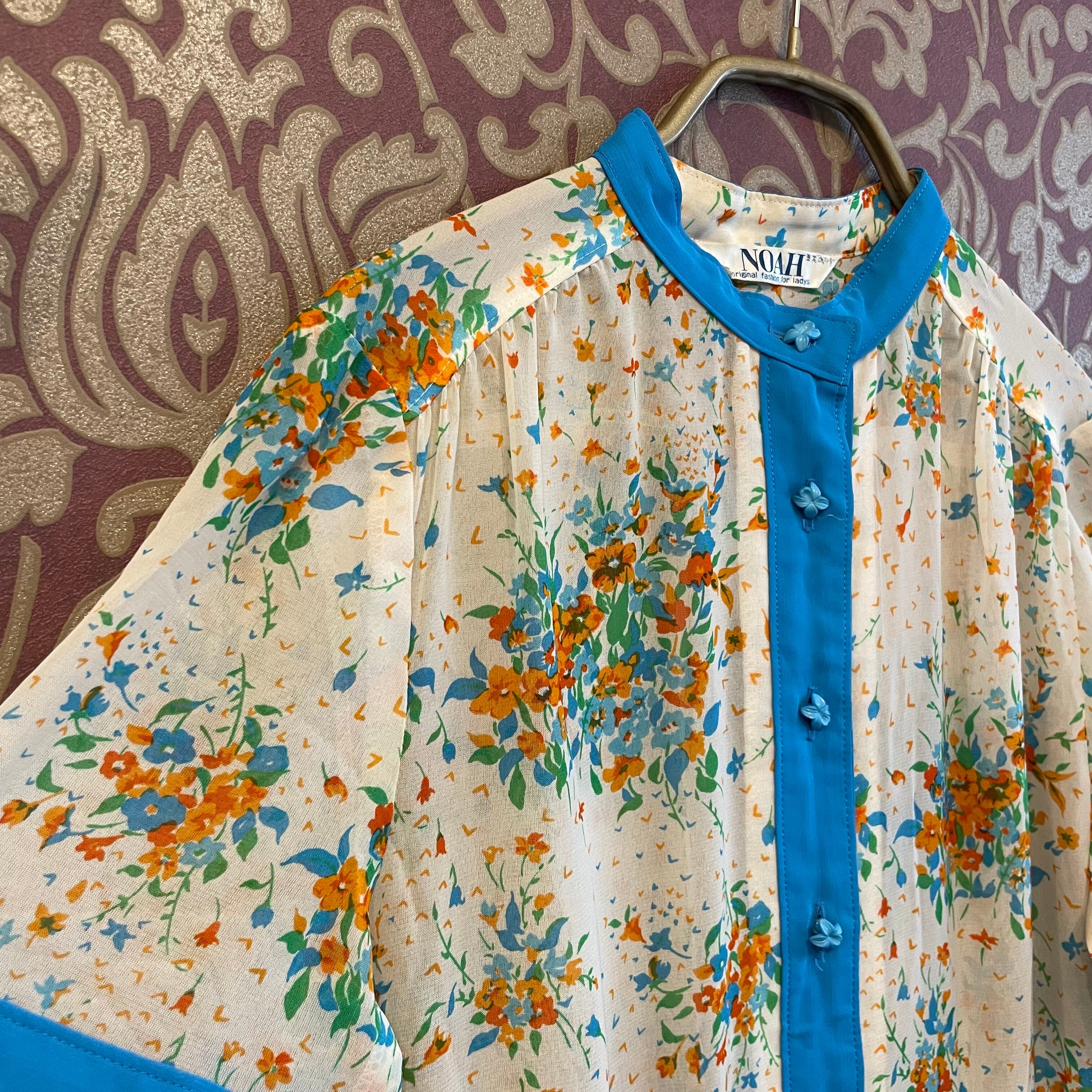 クリームに近い白地にオレンジや水色、緑のカラフルな花柄のワンピースです。