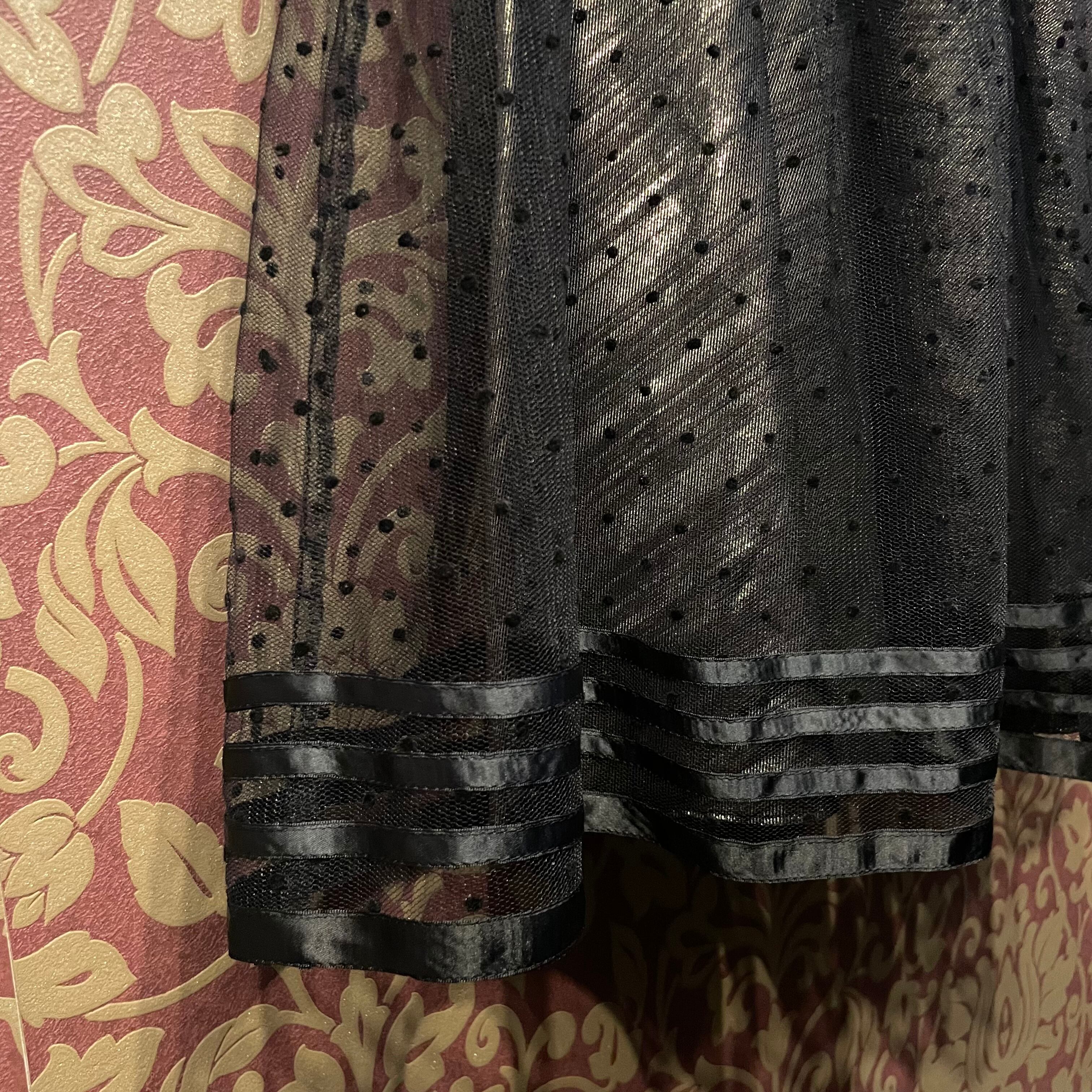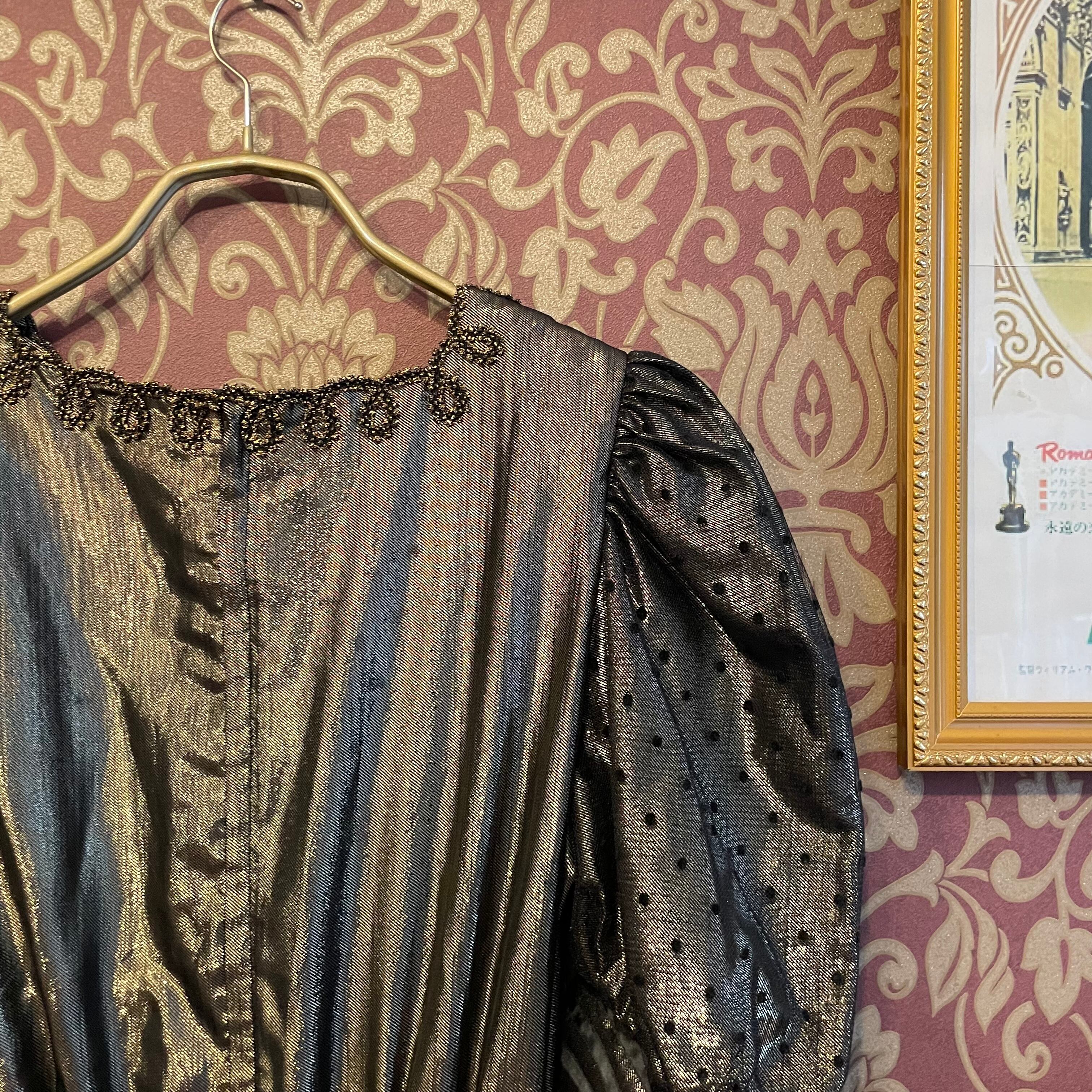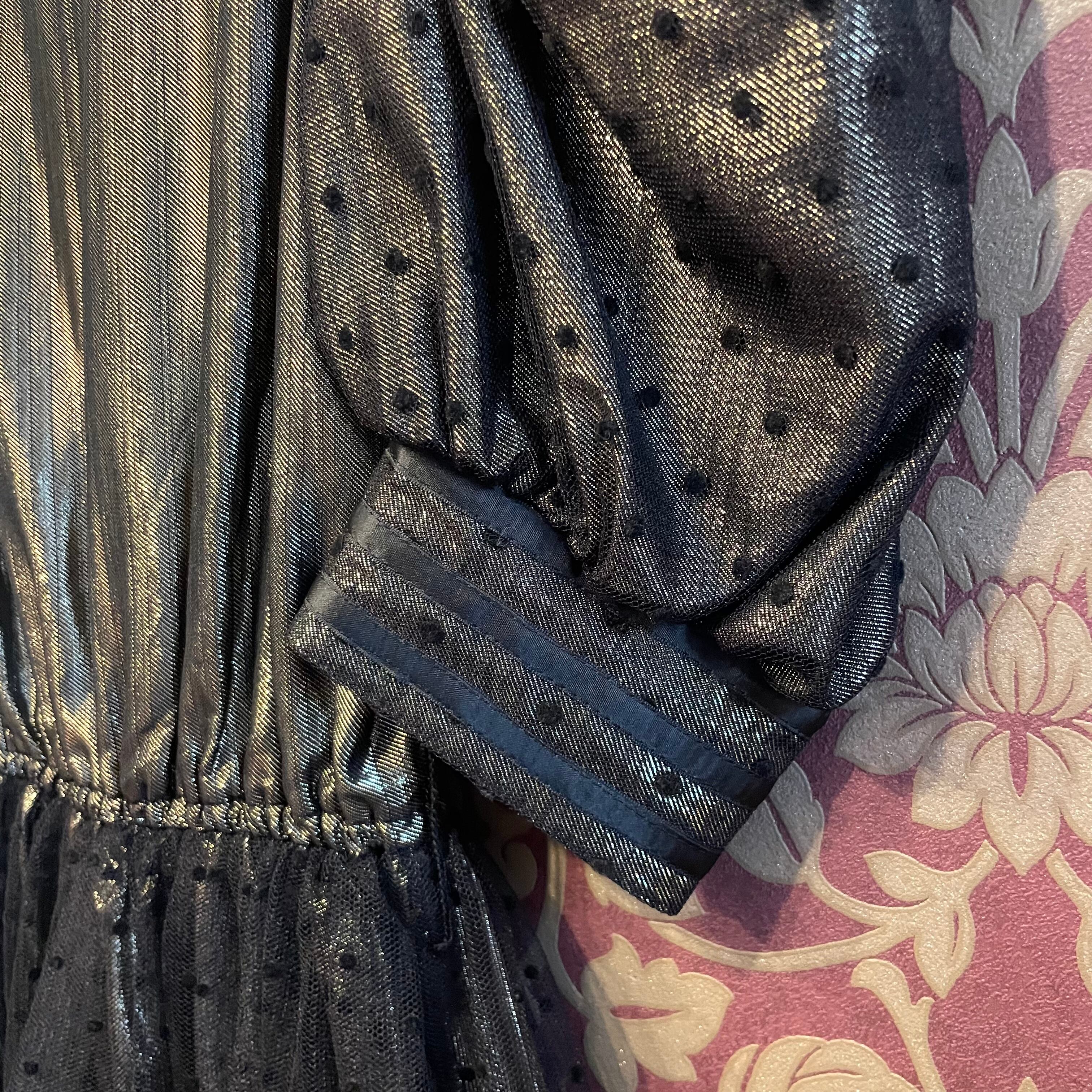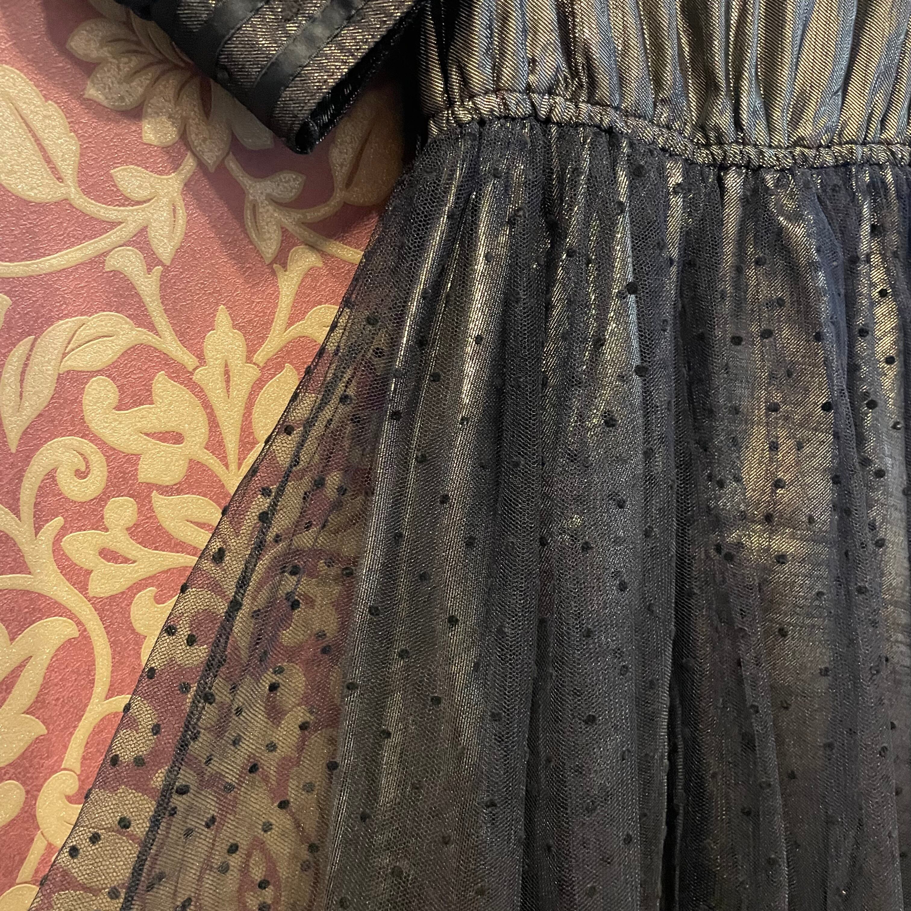 全体が暗いゴールドで、袖やスカートにはどっと柄のチュールが重ねられ、袖口や裾はバイアスで装飾が施されています。