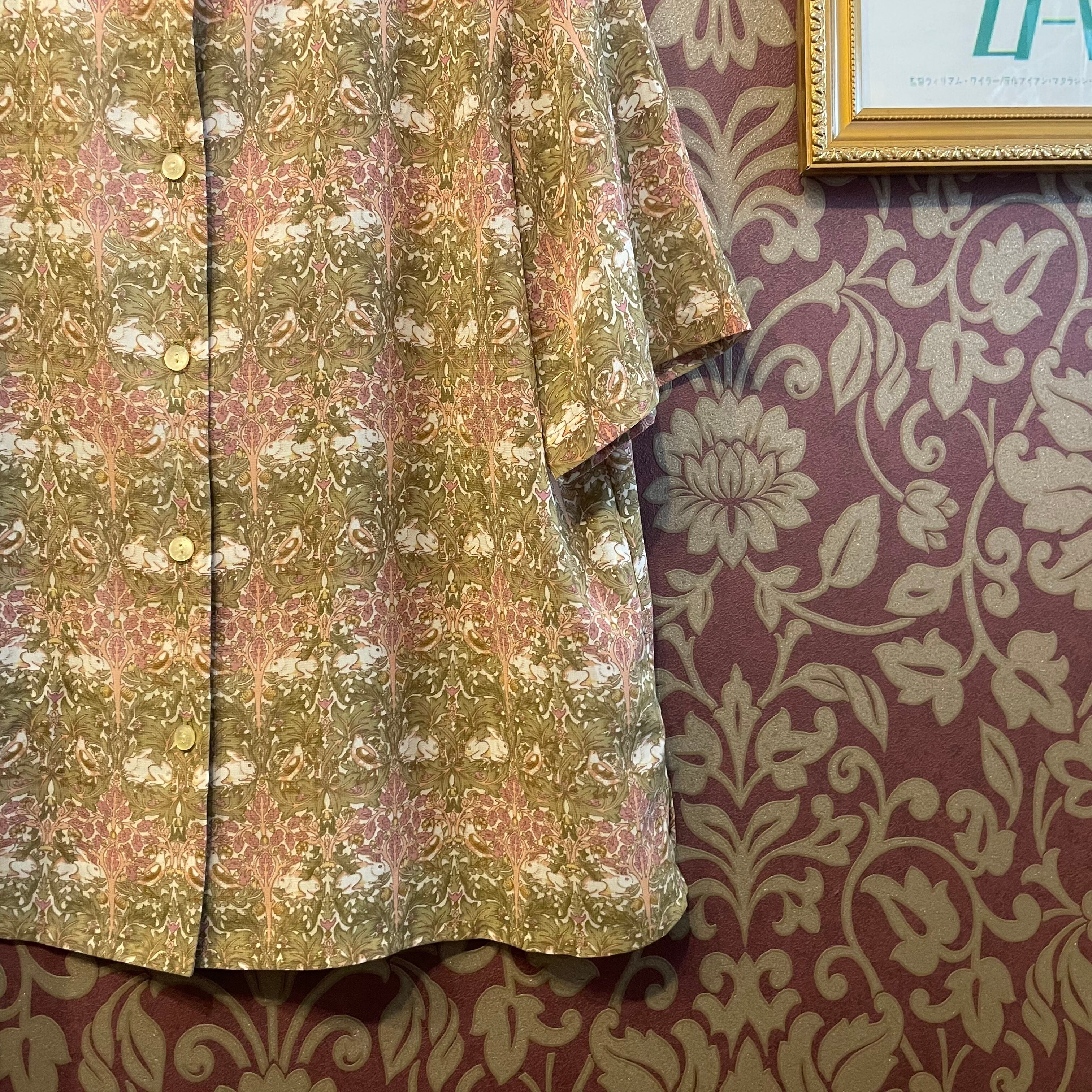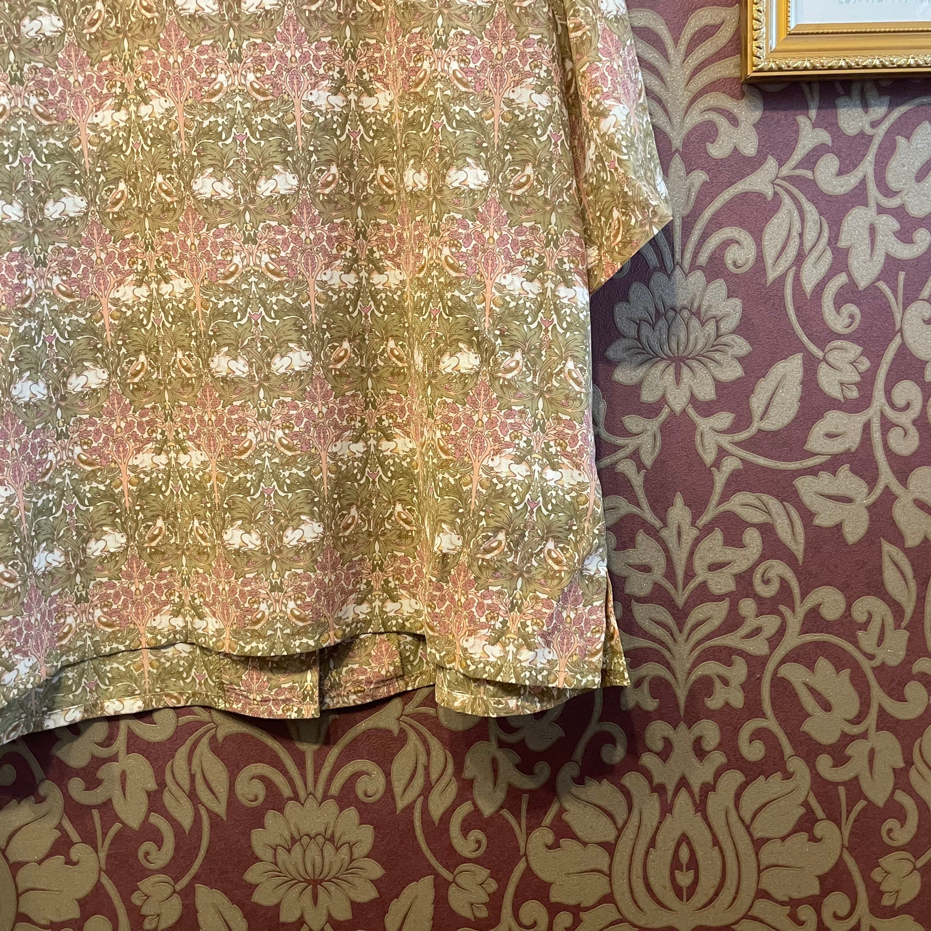 柄は「兄弟ウサギ」として知られるデザインで、17世紀のイタリアのシルクからインスピレーションを得て、ウィリアム・モリスが1882年に制作したものです。モリスが子供たちに読み聞かせていだ”レアムおじさん”の話に出てくる賢いウサギをモチーフにした、左右対称の鏡合せ模様です。