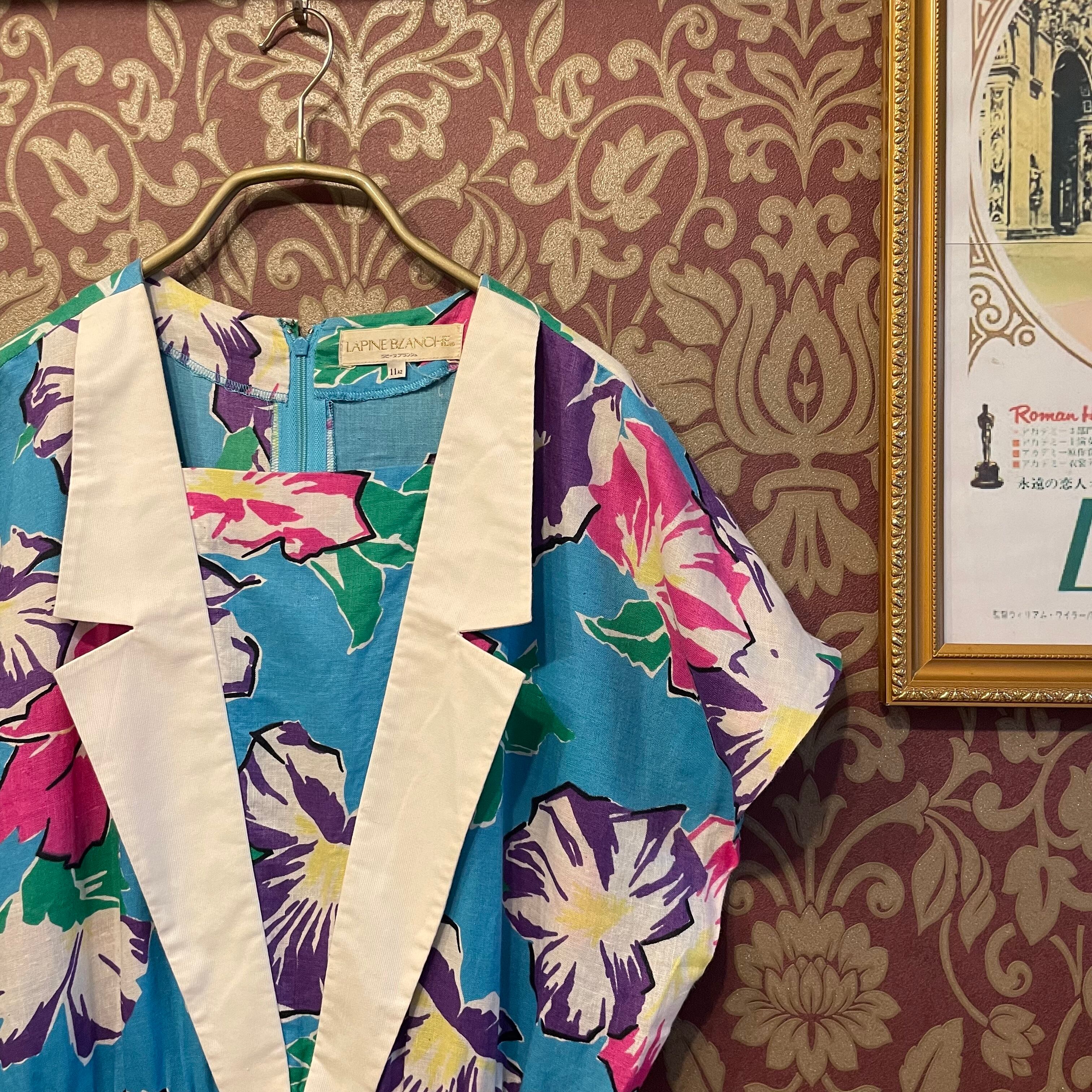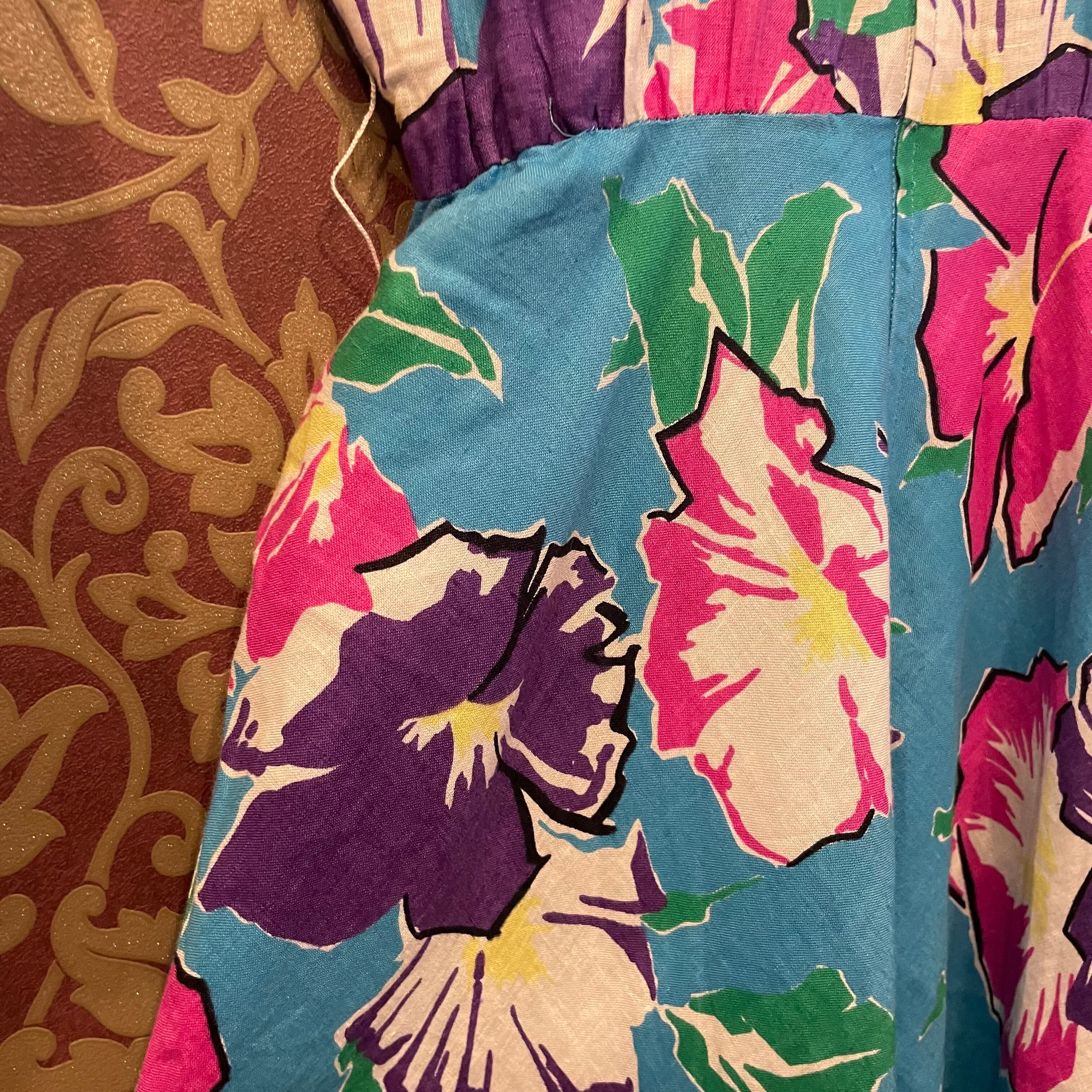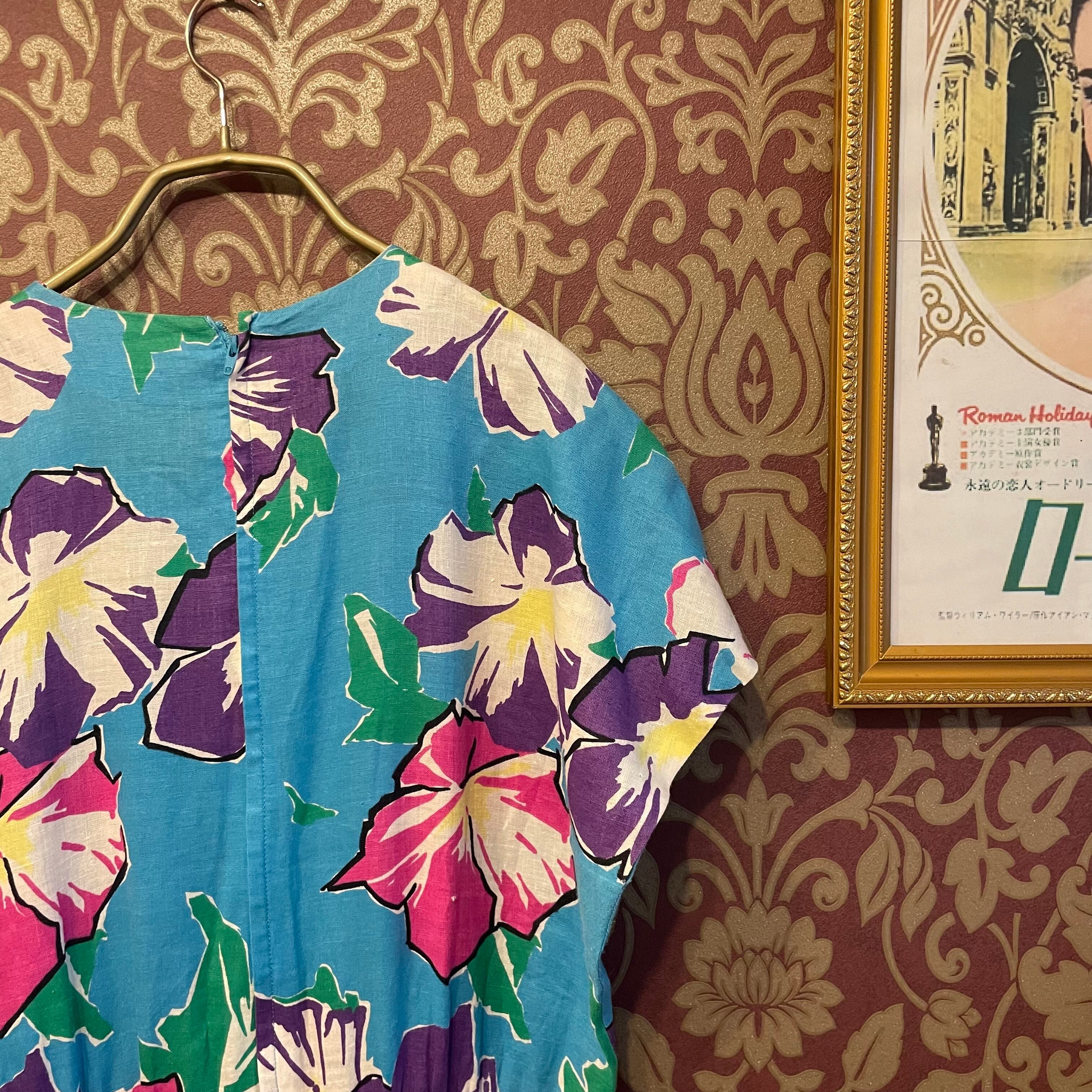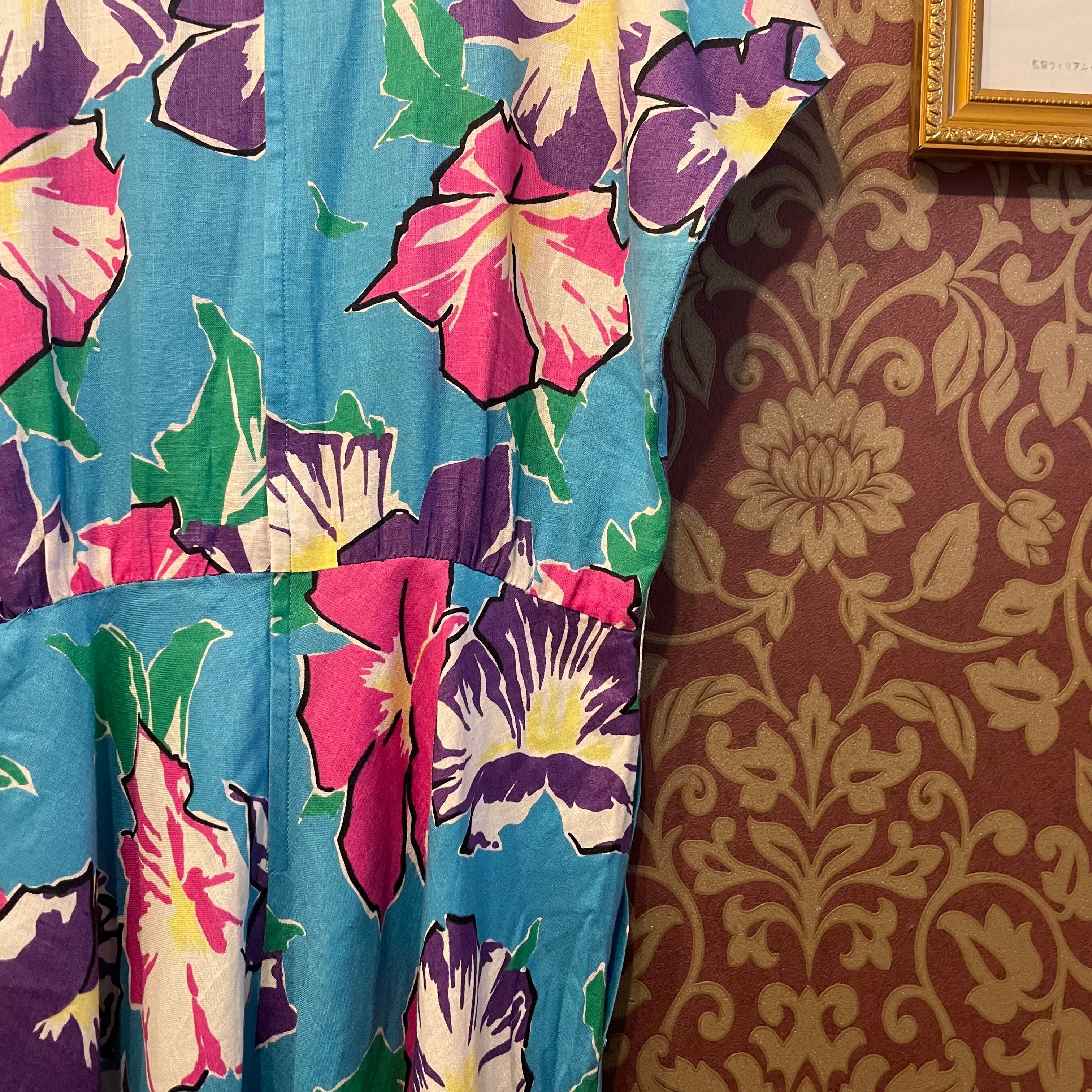 鮮やかな水色に紫とピンクの花柄ワンピースです。