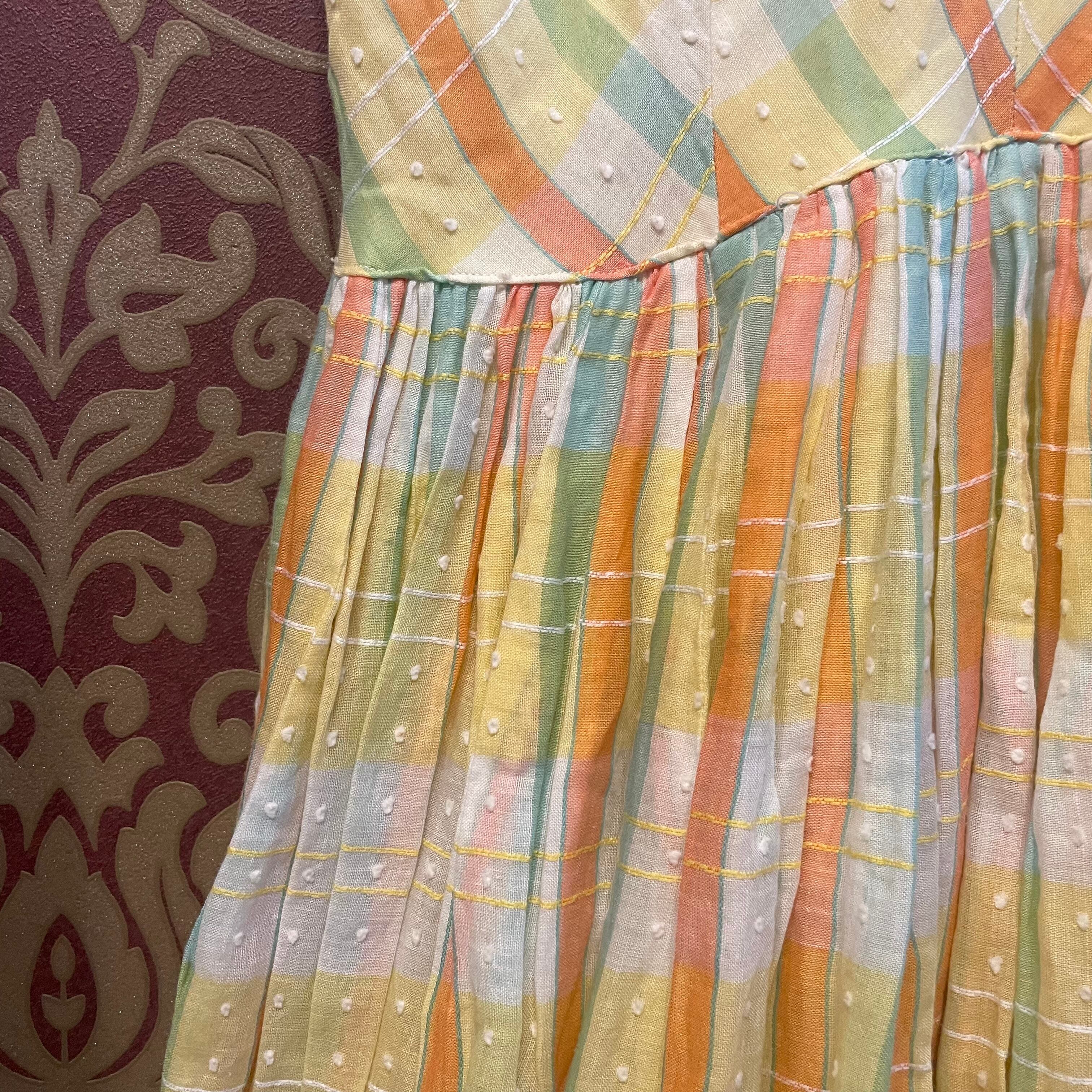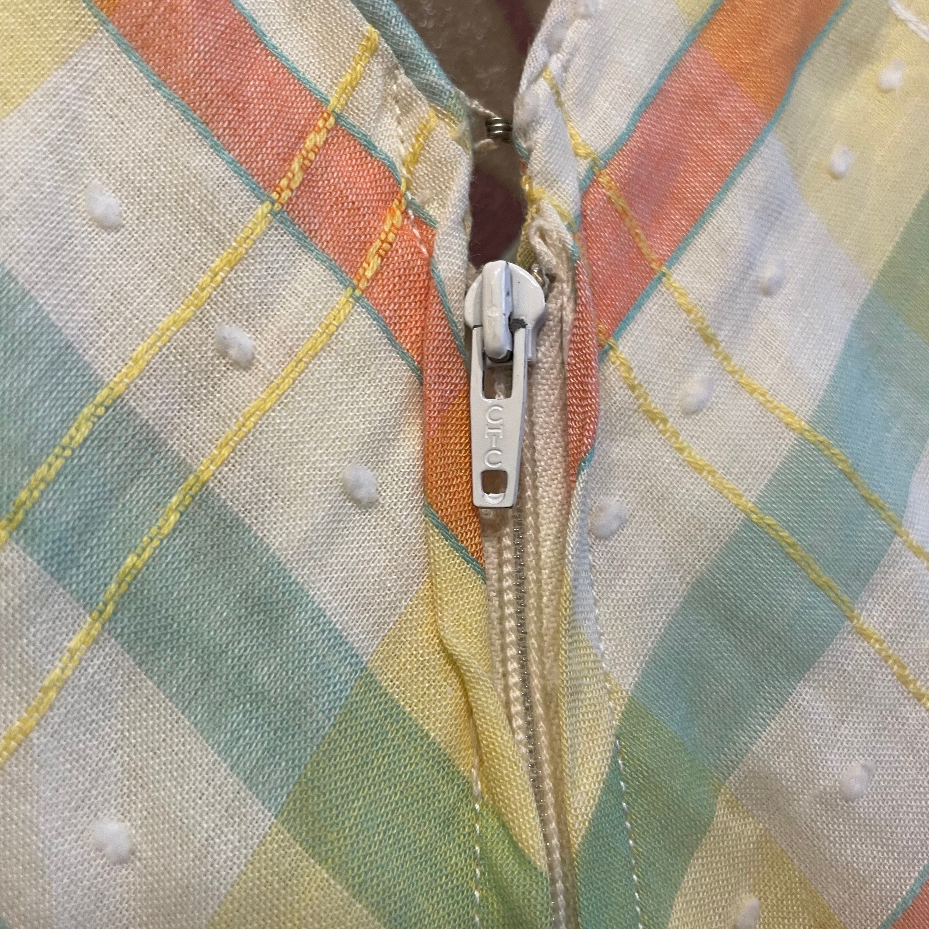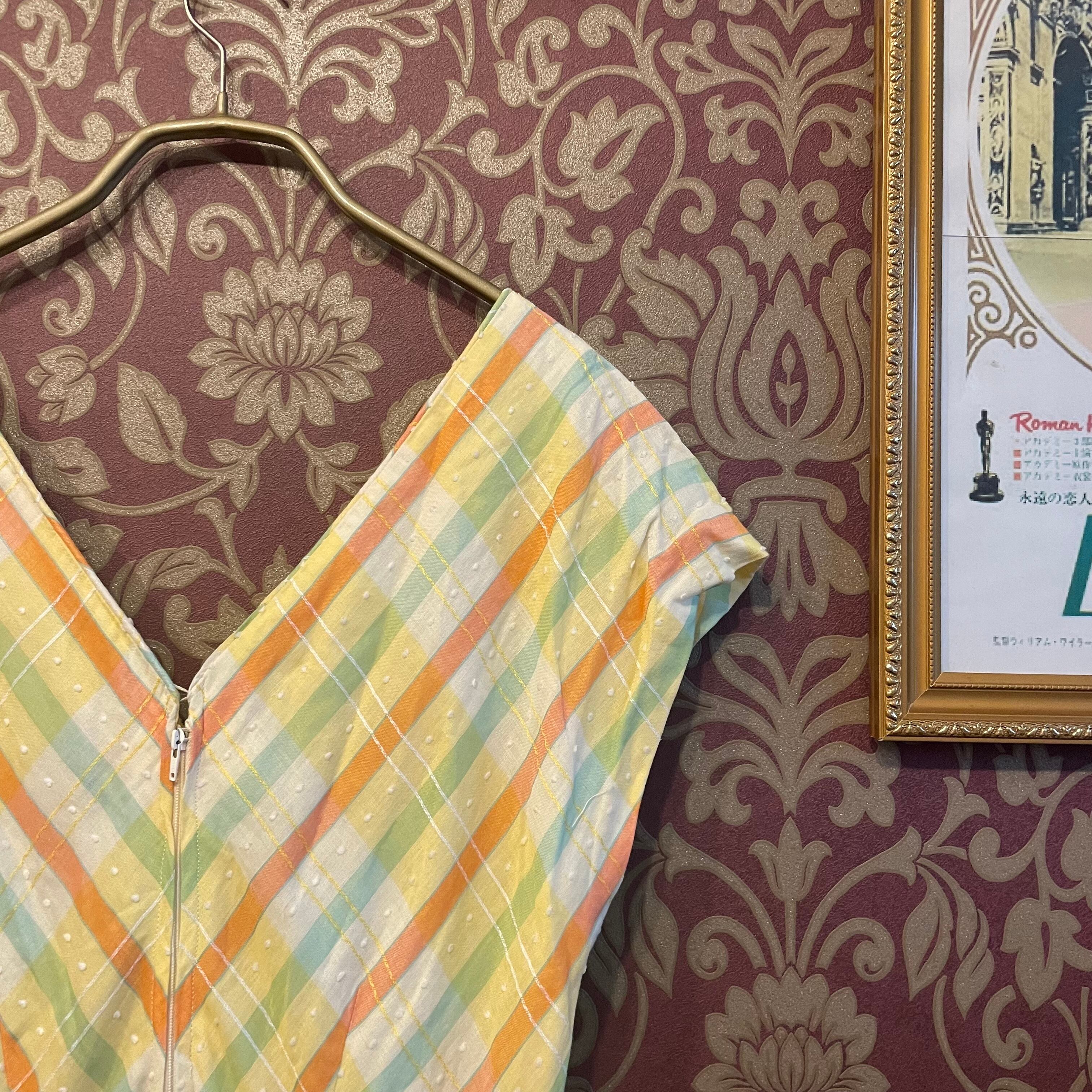黄色やオレンジ、白、緑などのチェック柄で、生地自体にはポコポコ・ふわふわとした立体的なドットが可愛らしいデザインです。