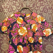 紺地に鮮やかなピンクオレンジのハワイアンな花柄です。