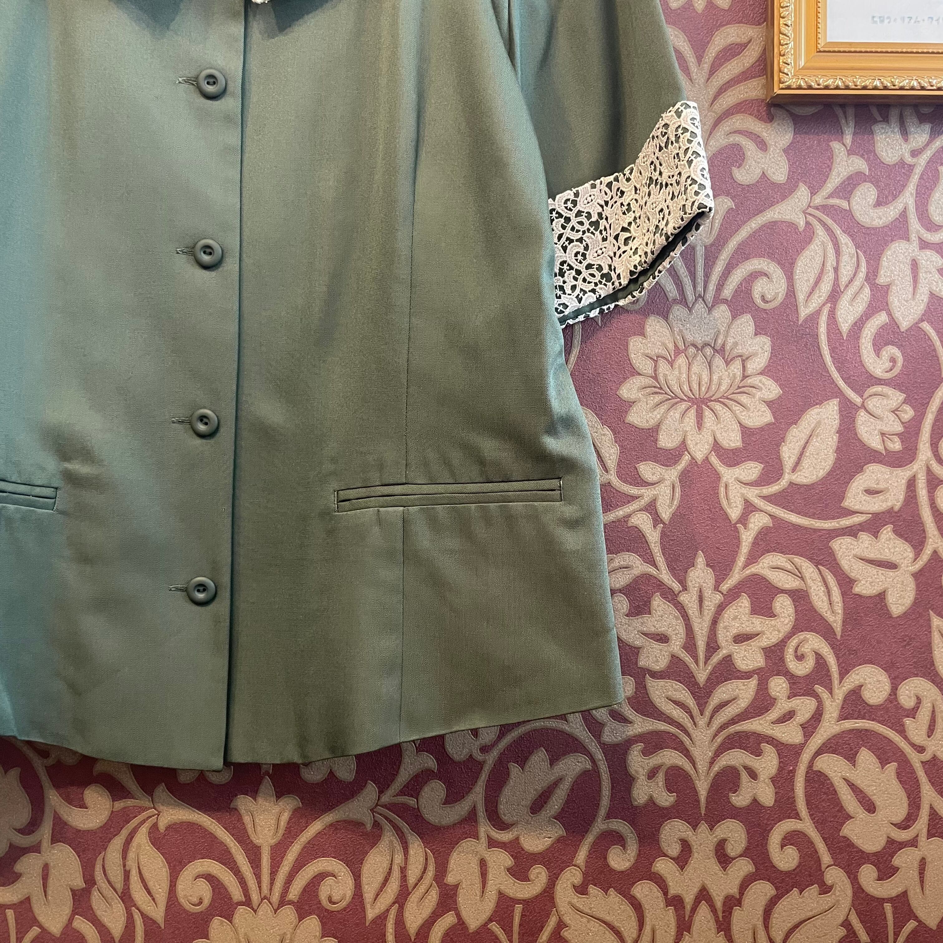 ジャケットはレースの襟と袖のおり返しが上品かつ清楚なデザインで、ポケットにはしつけ糸が付けられています。