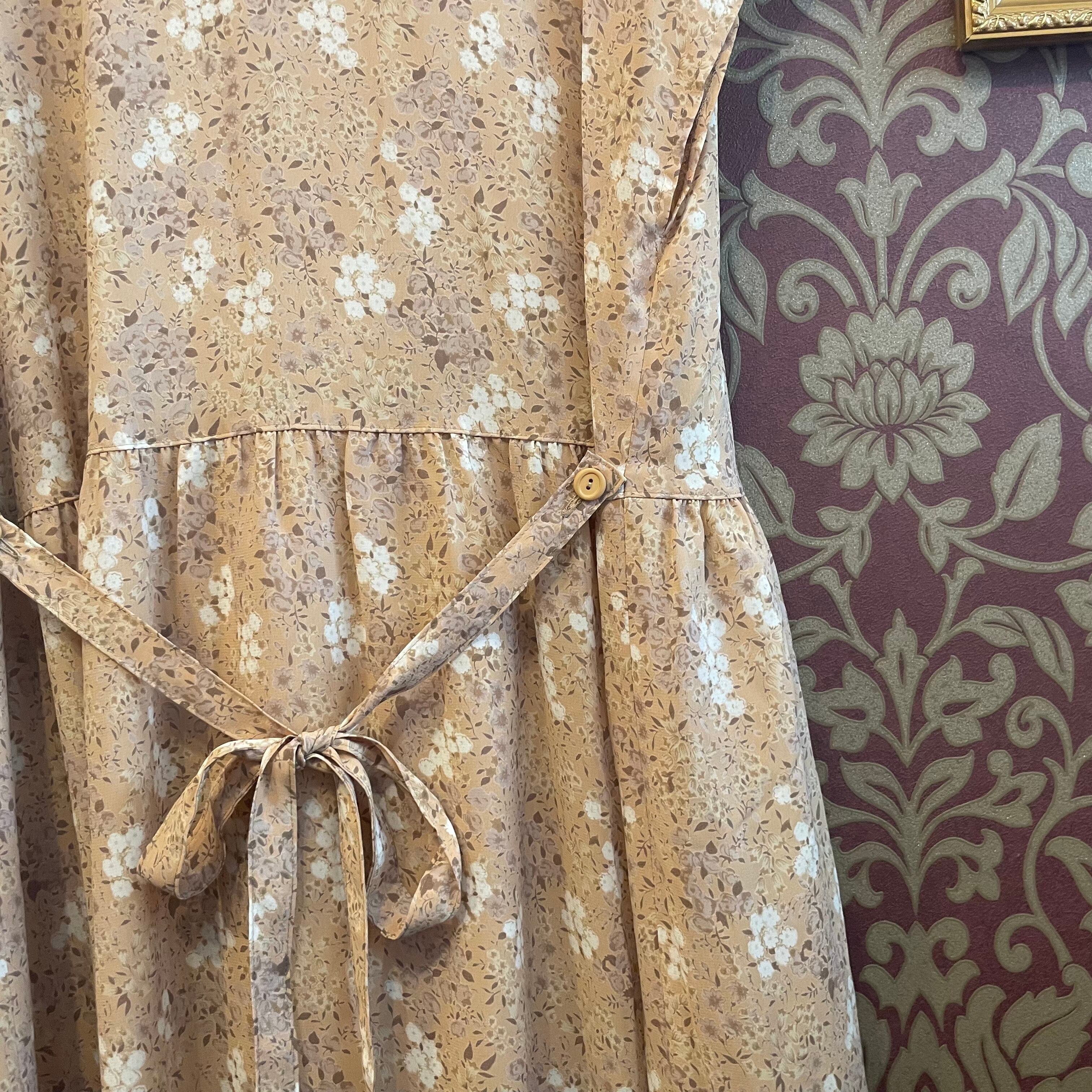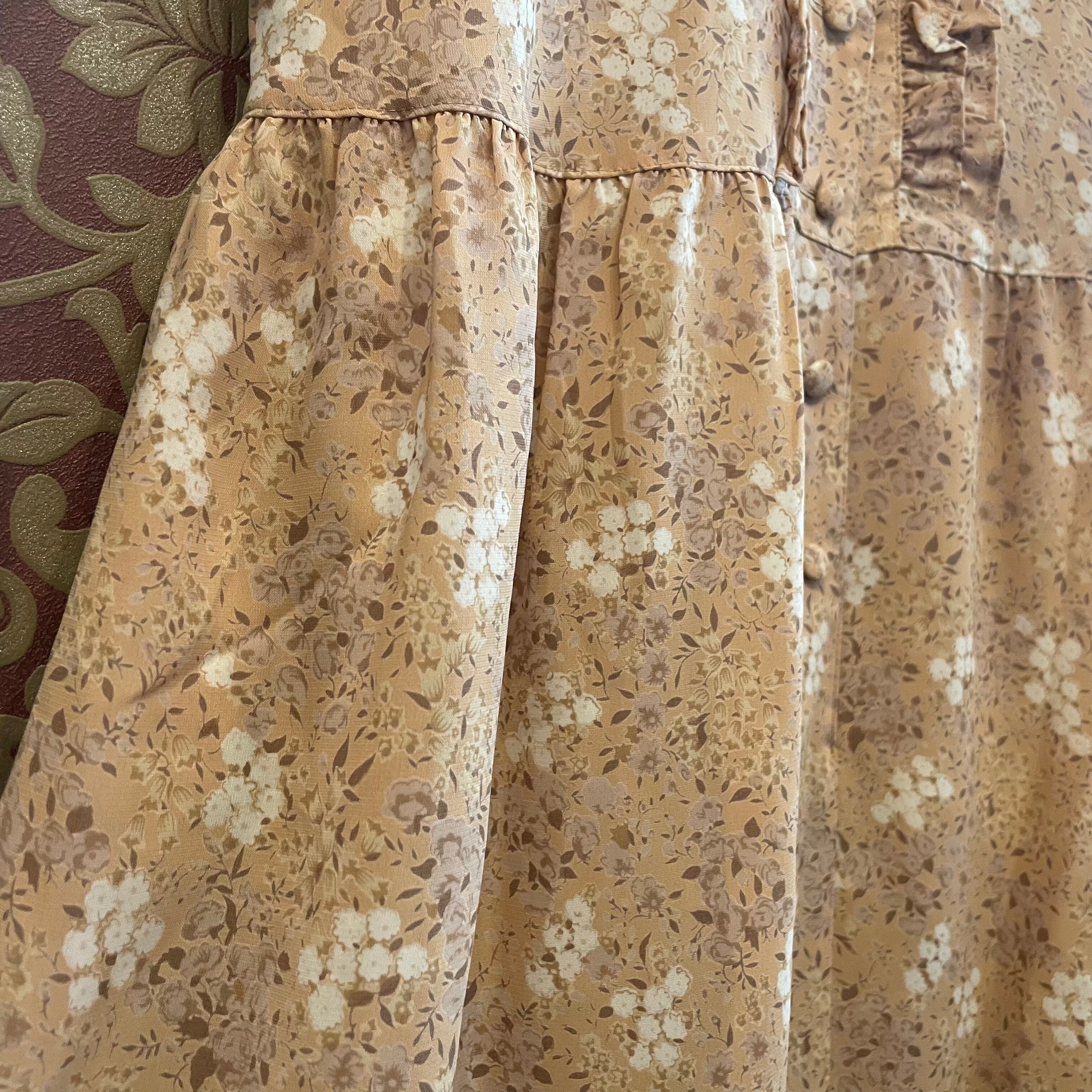 ピンクベージュをベースに淡いトーンの花柄のワンピースです。