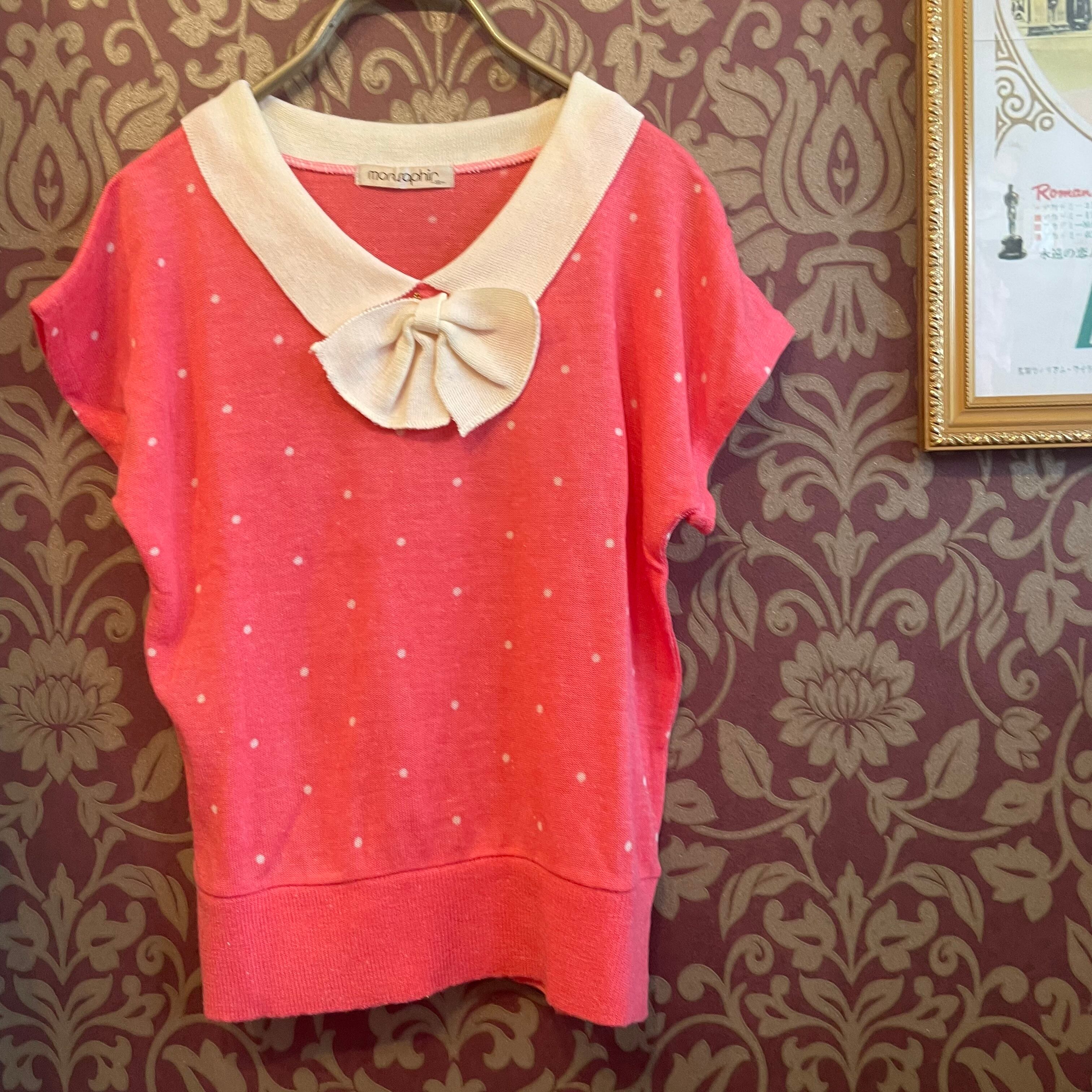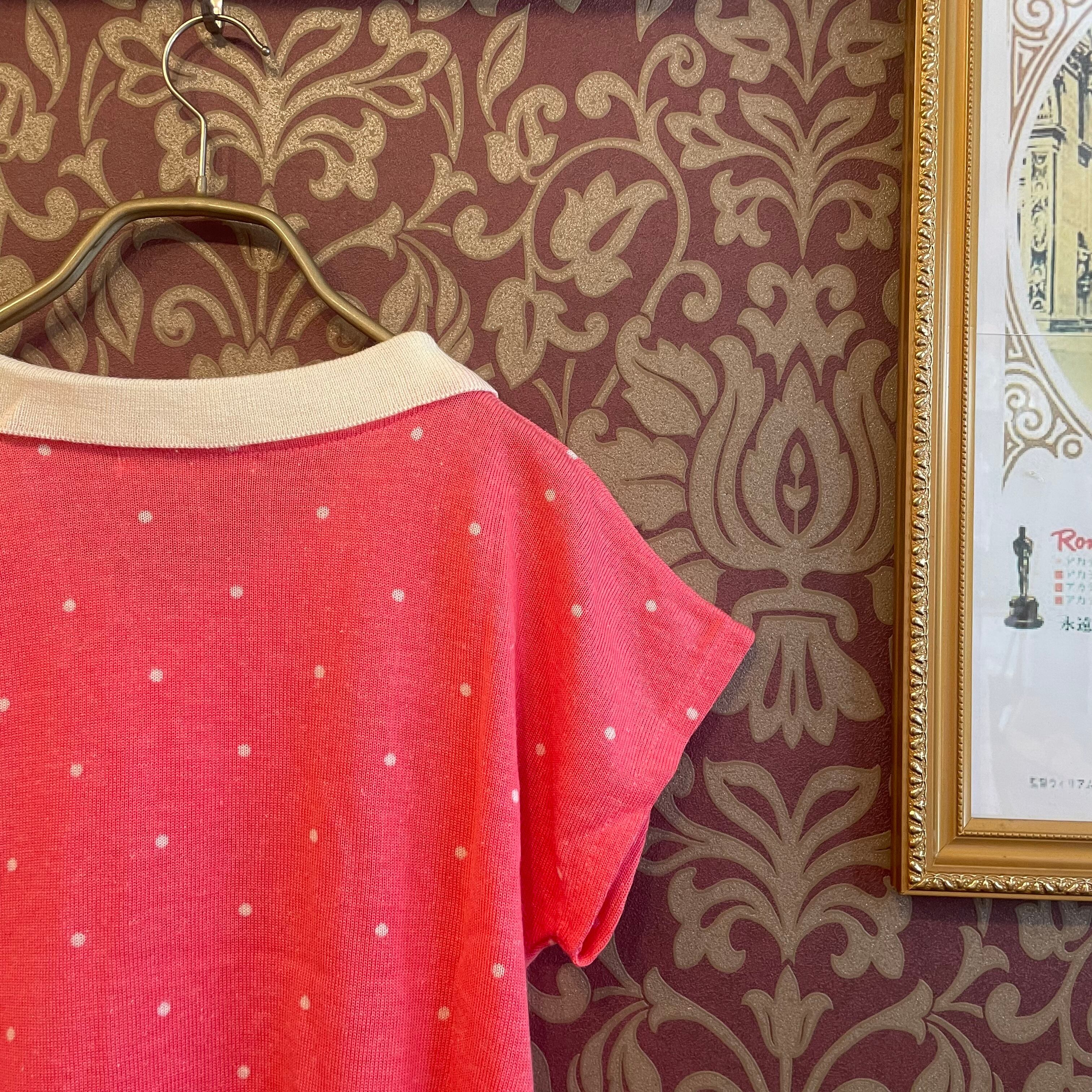 可愛らしいピンクに白のドット柄プリントで、白襟とリボンが印象的です。