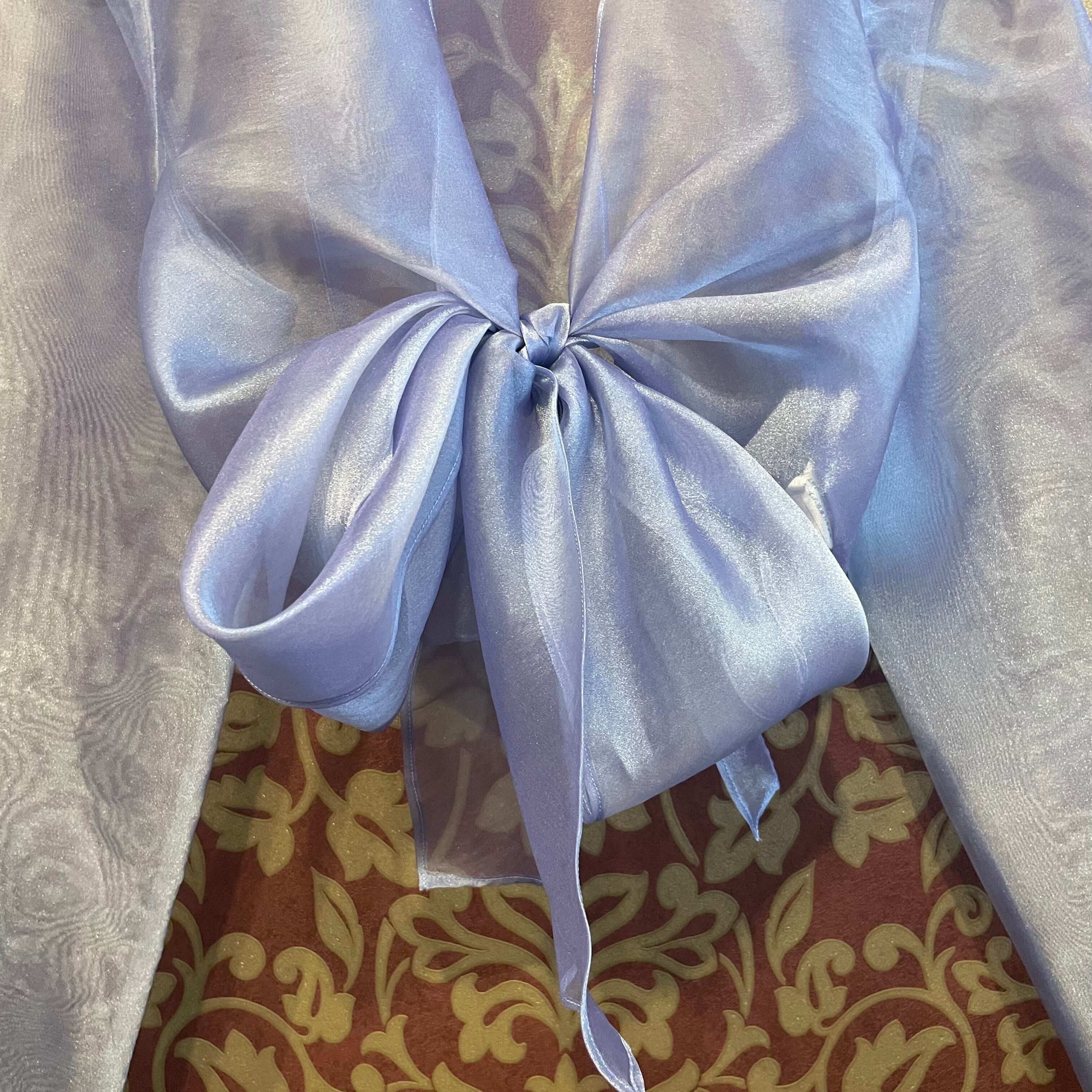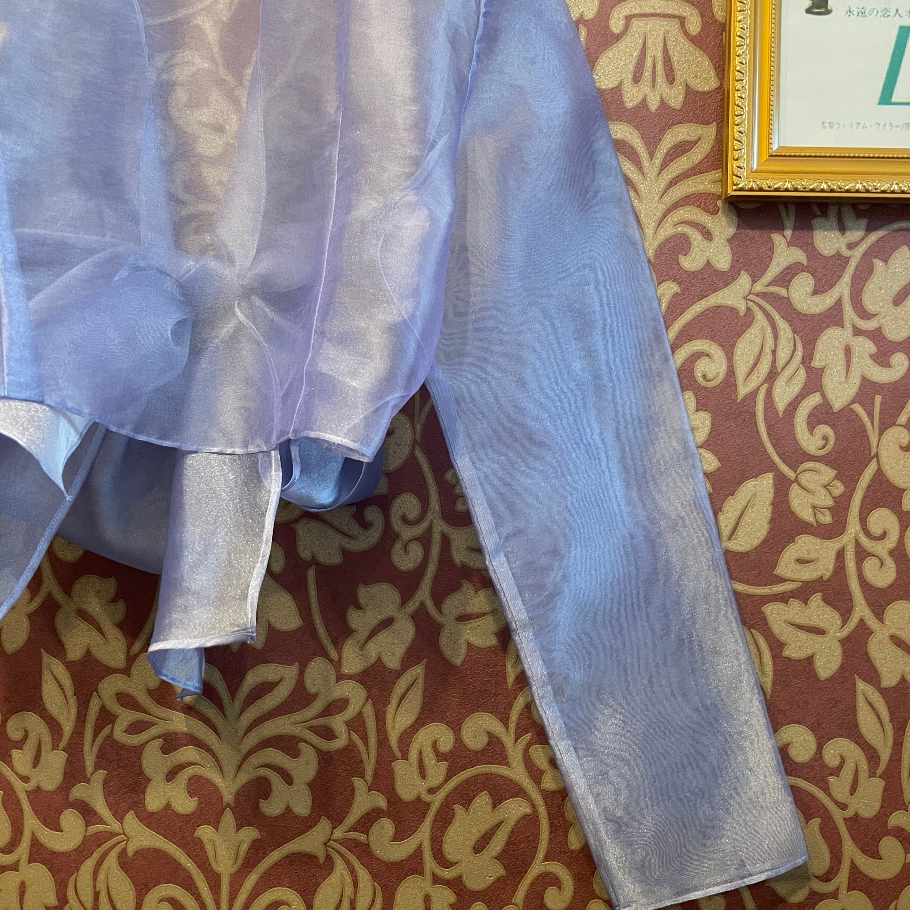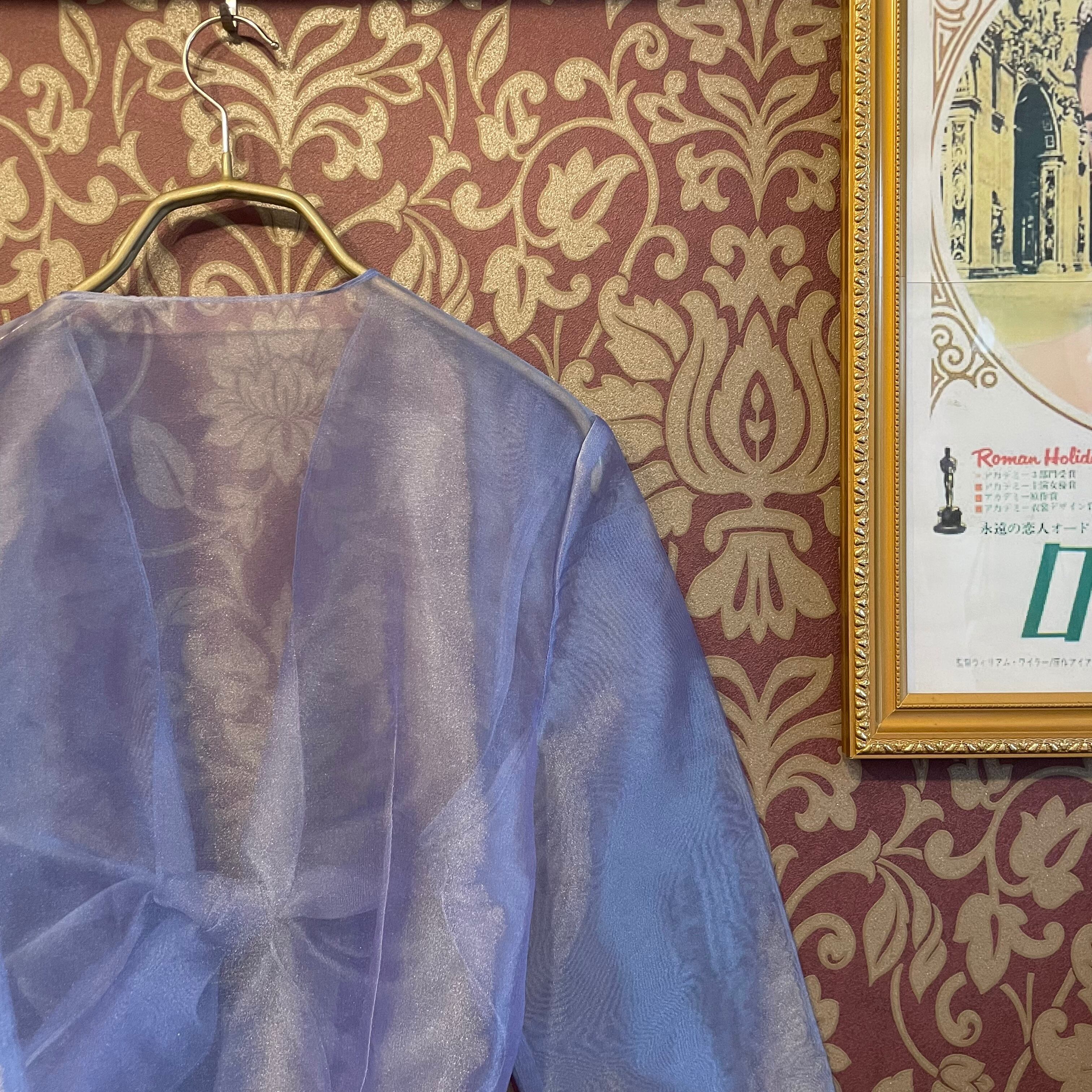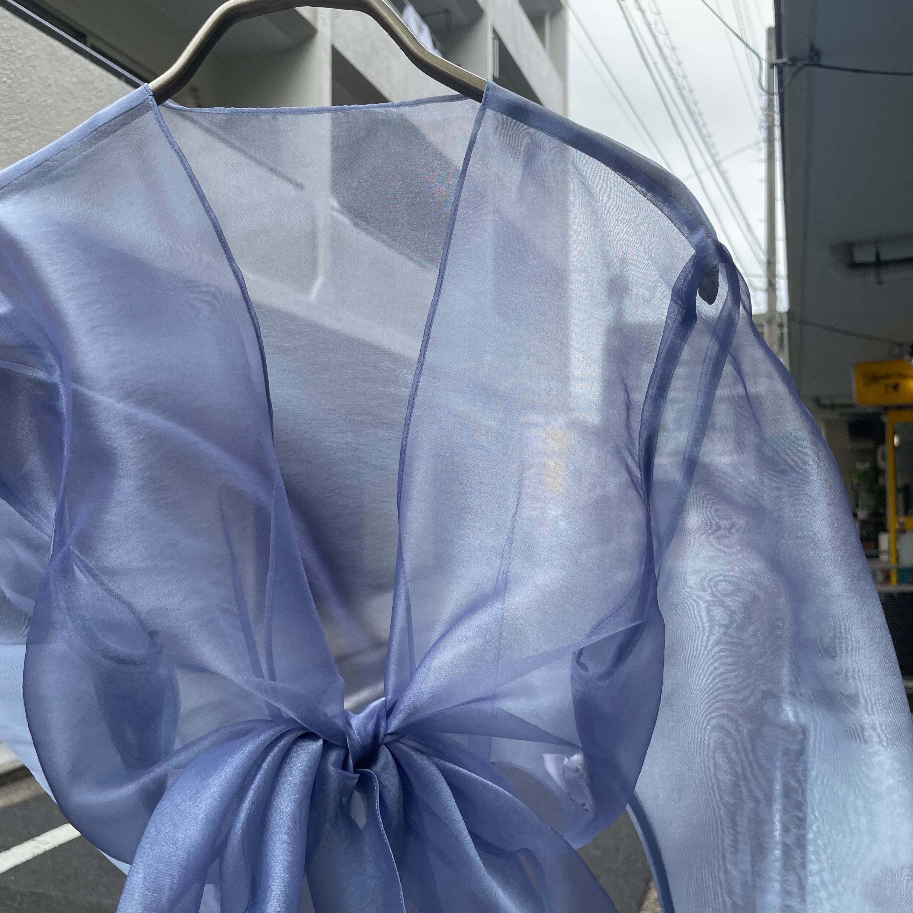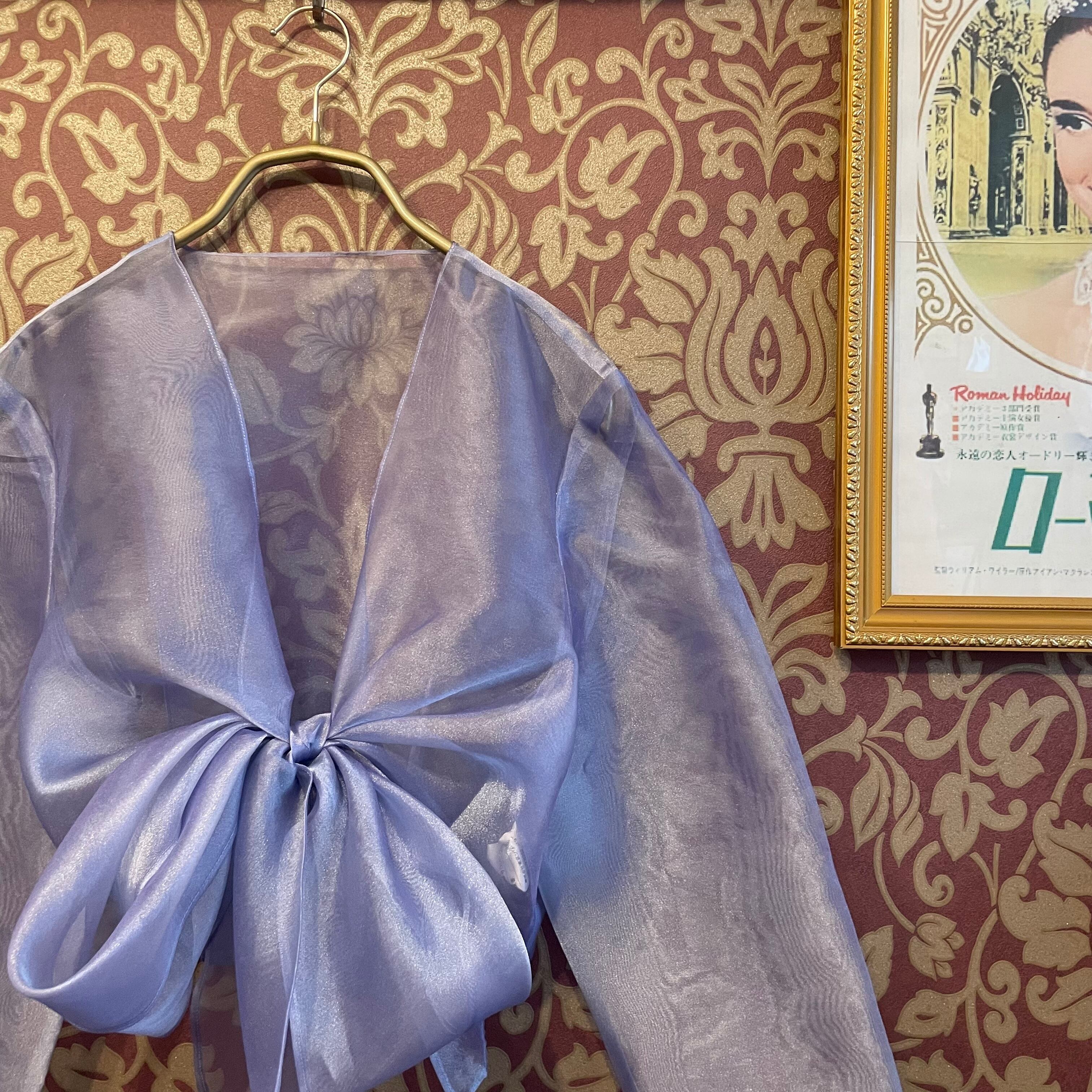 透明感のあるアイスパープルのオーガンジーで、フロントの太く大きなリボンがとってもガーリーなデザインです。