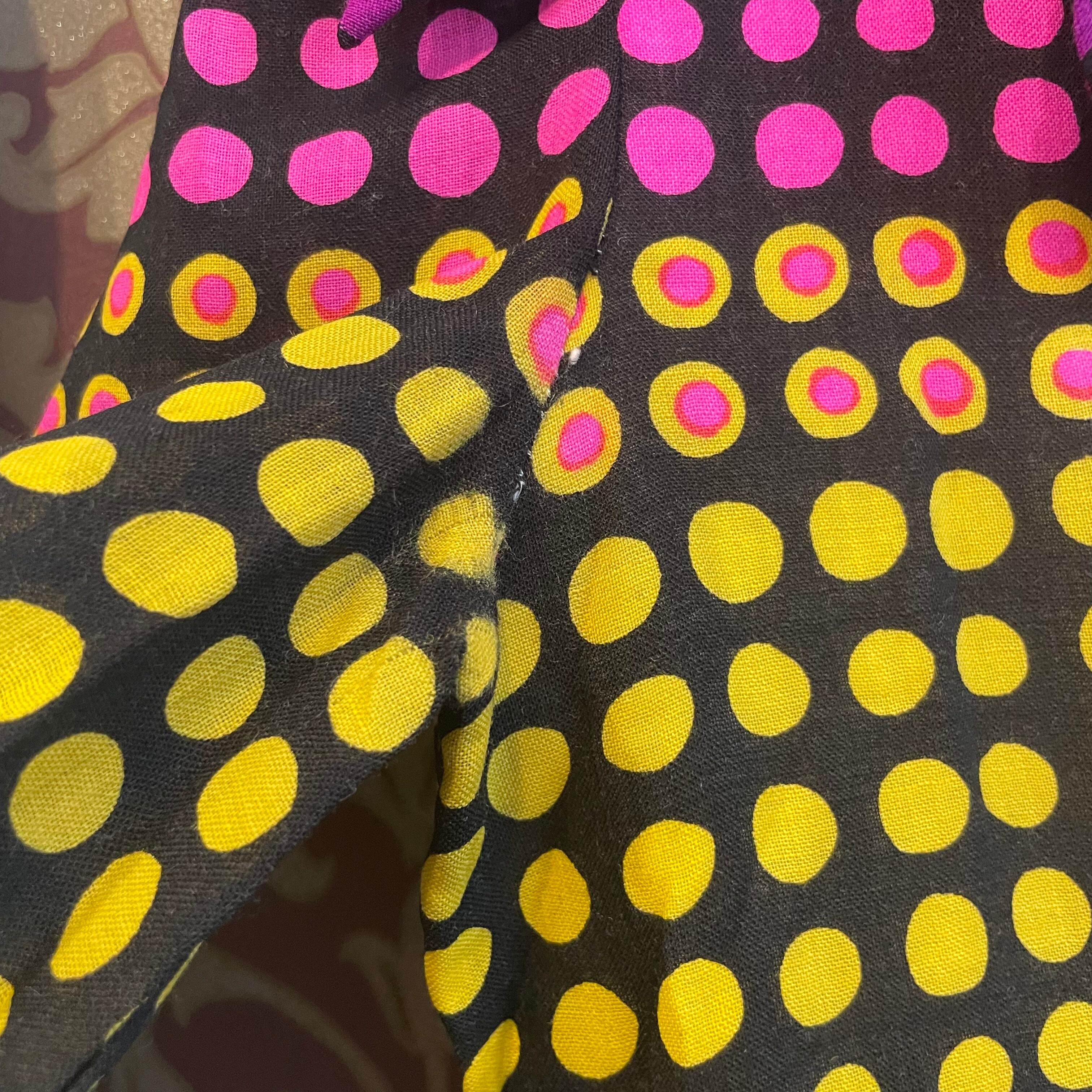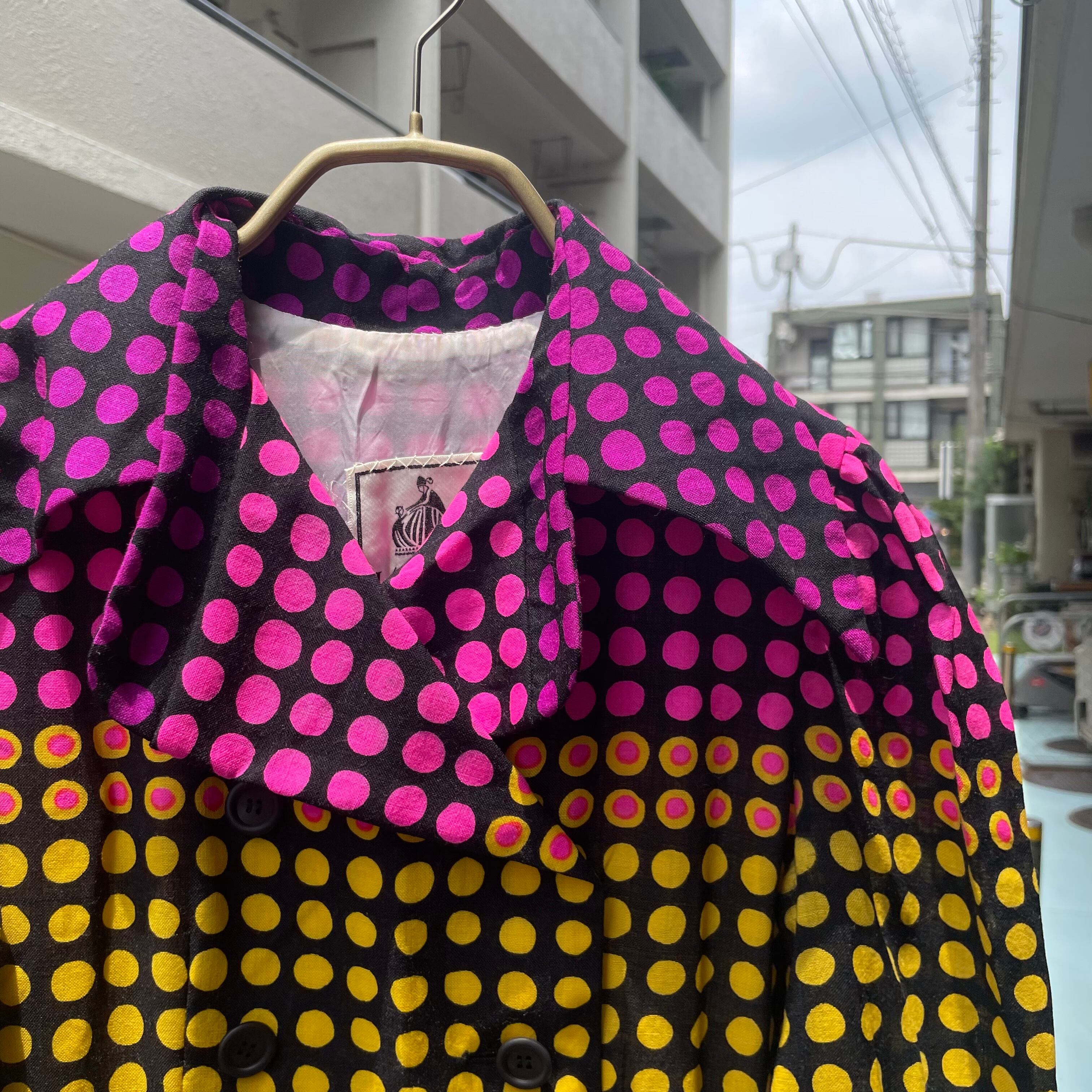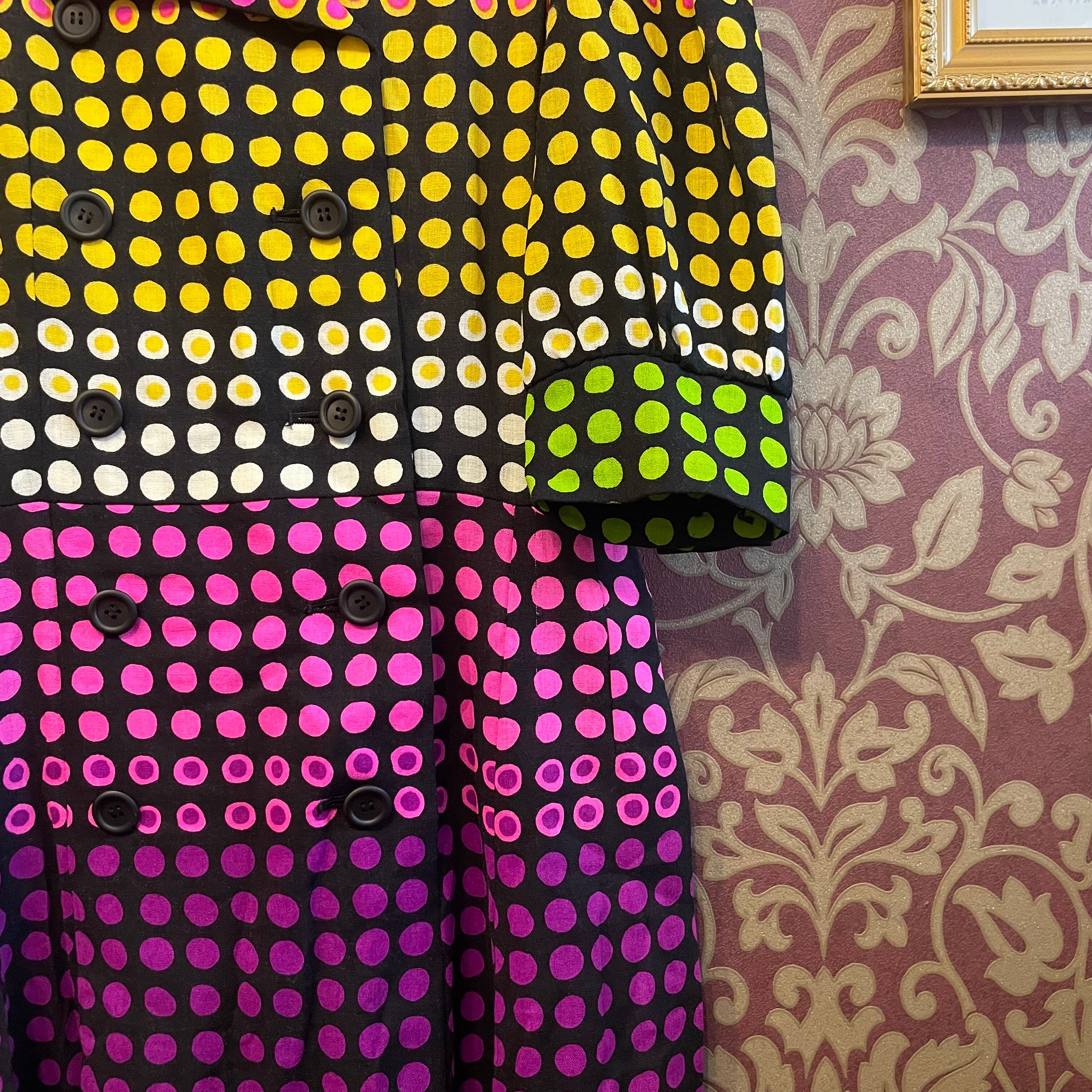 60年代らしい膝丈の上品なシルエットに、70年代らしいサイケデリックで目まぐるしい柄です。