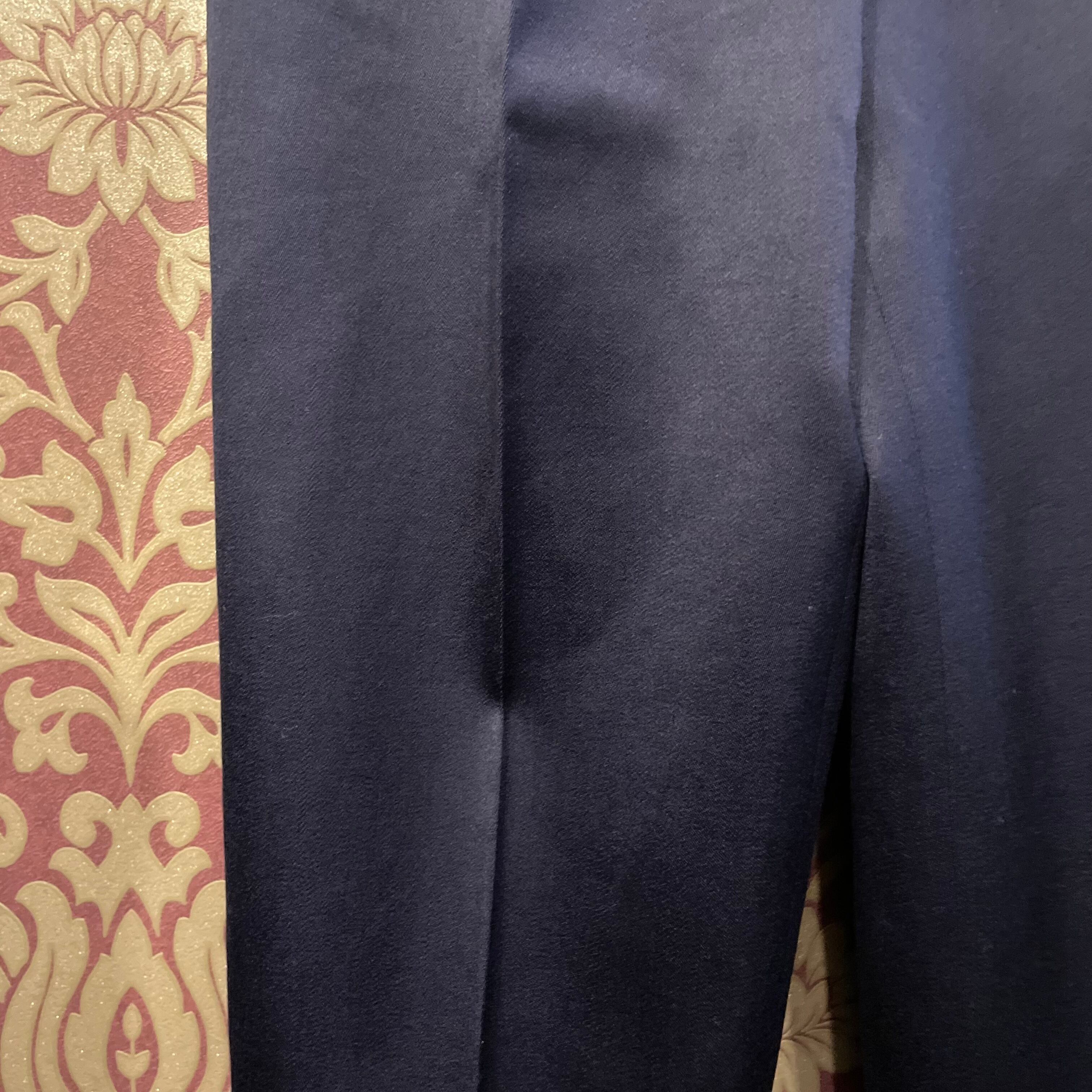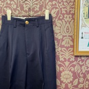 サイドにラインの入っていないタキシードパンツのようなデザインで、ハイウエストのツータック、センタープレスパンツです。