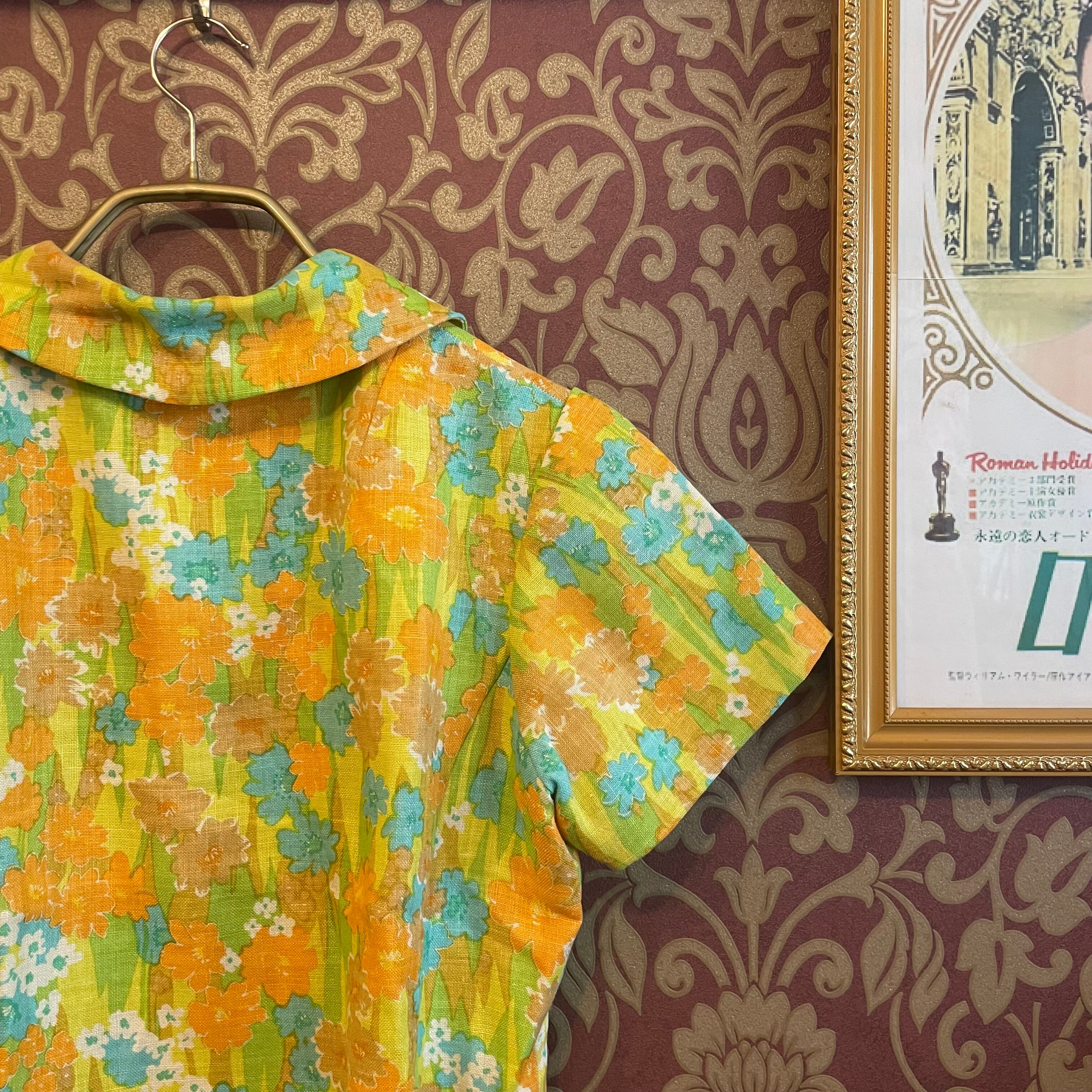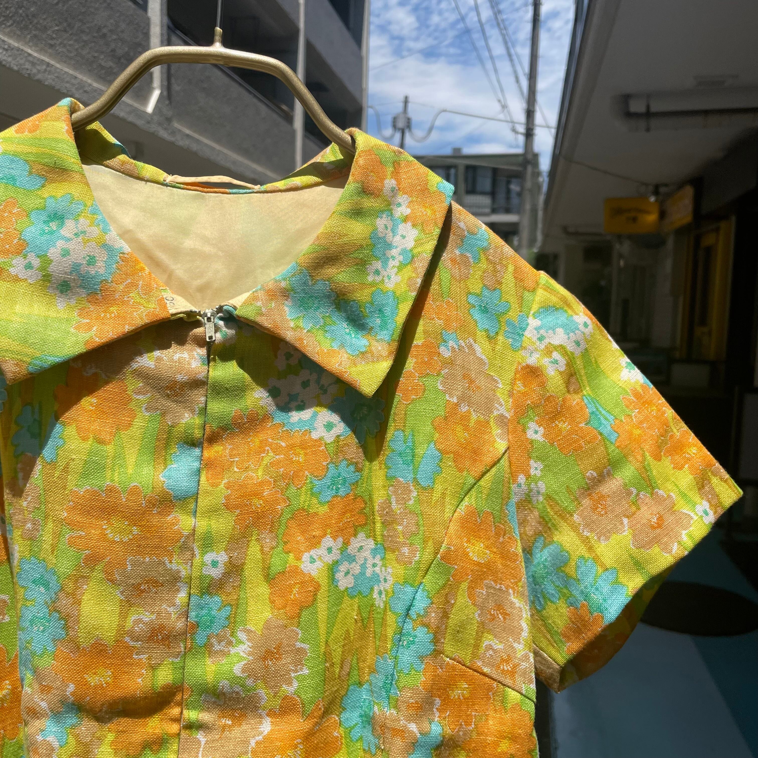 オレンジ、緑、水色、白の花柄でヴィンテージらしさを感じる柄です。