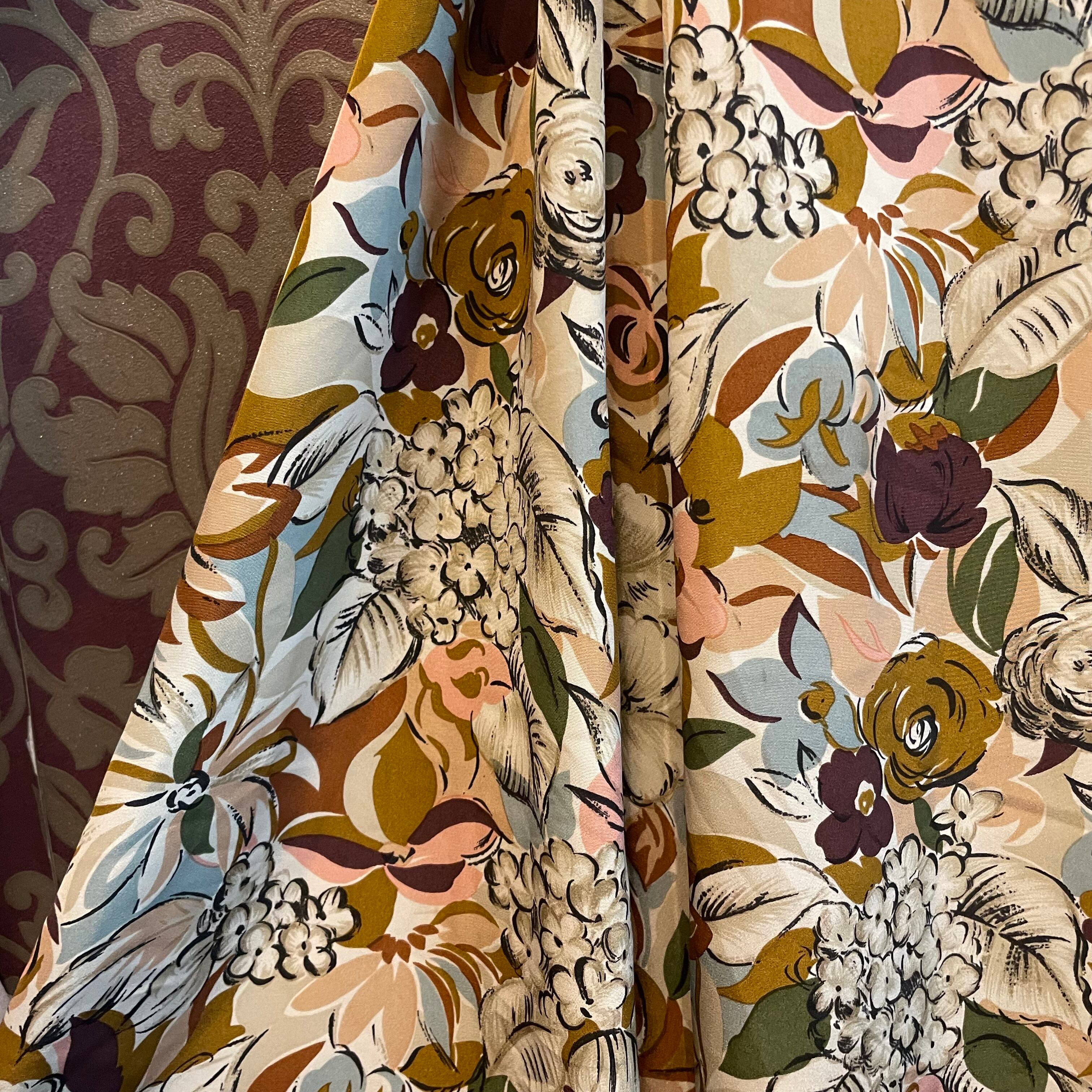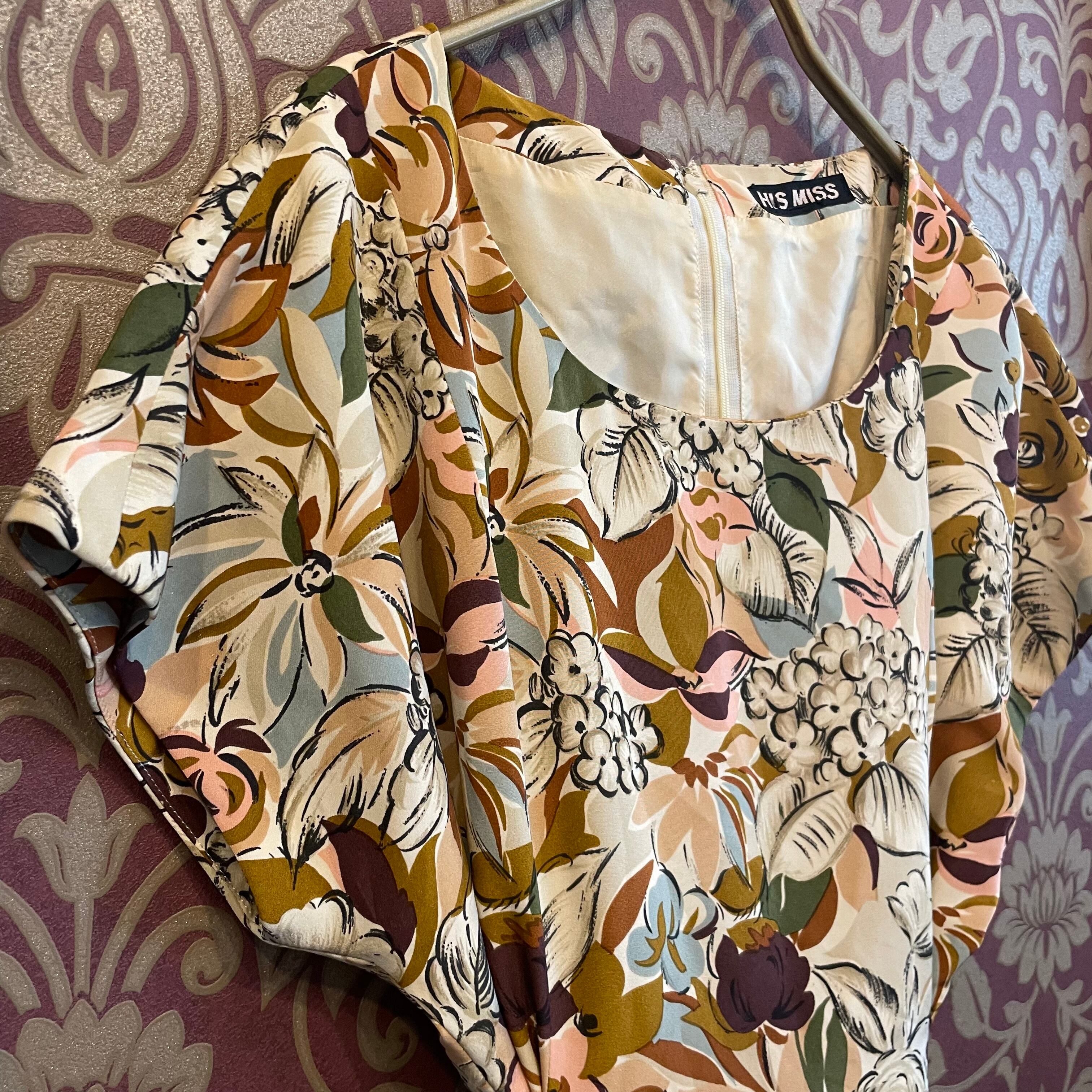 ベージュやカーキなどのアースカラーで構成されたナチュラルな花柄のワンピースです。