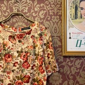 濃い目の生成りカラーをベースに、アンティーク風のバラ柄が美しいワンピースです。