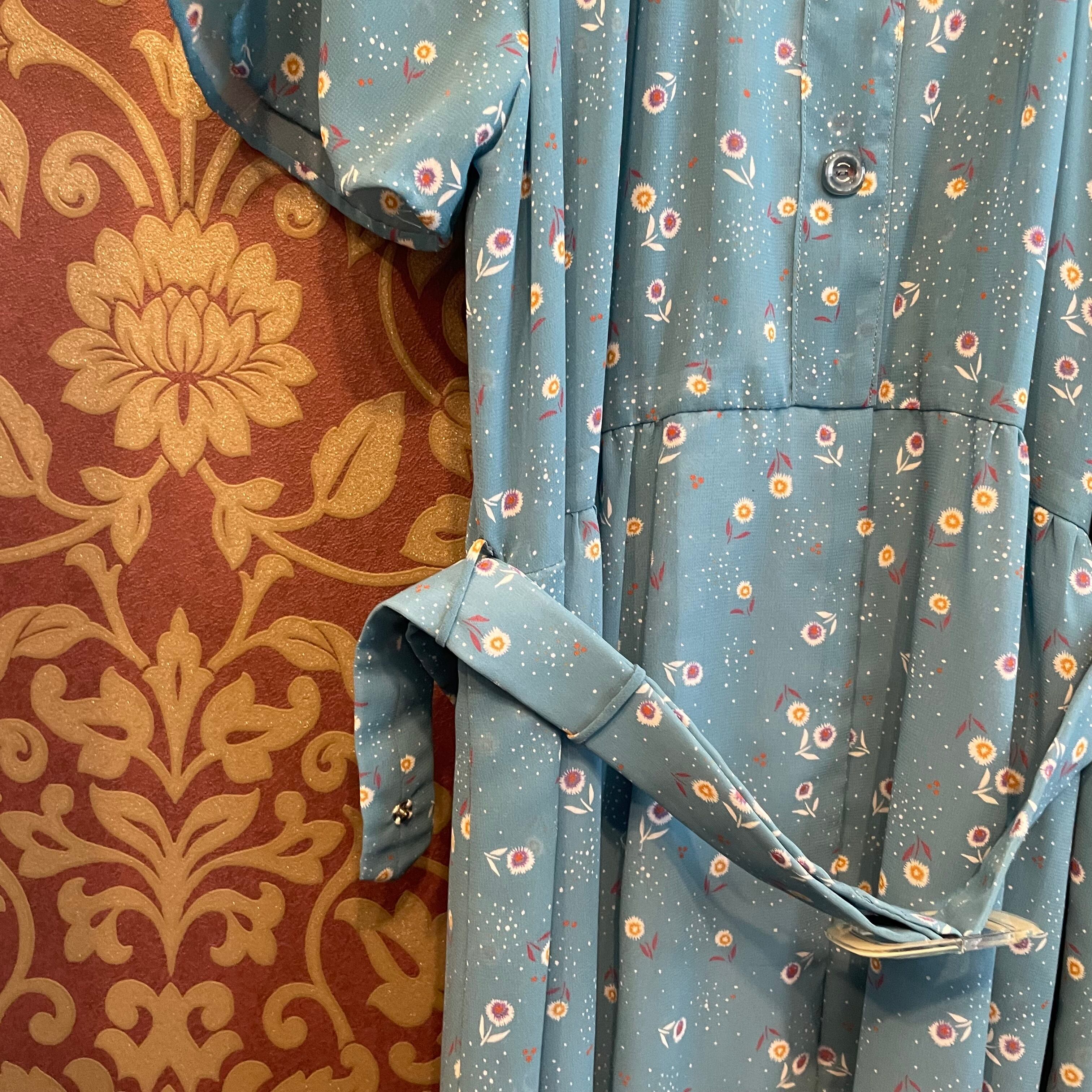 若干くすんだ水色に、綿毛のようなふわふわとした花柄のレトロなワンピースです。