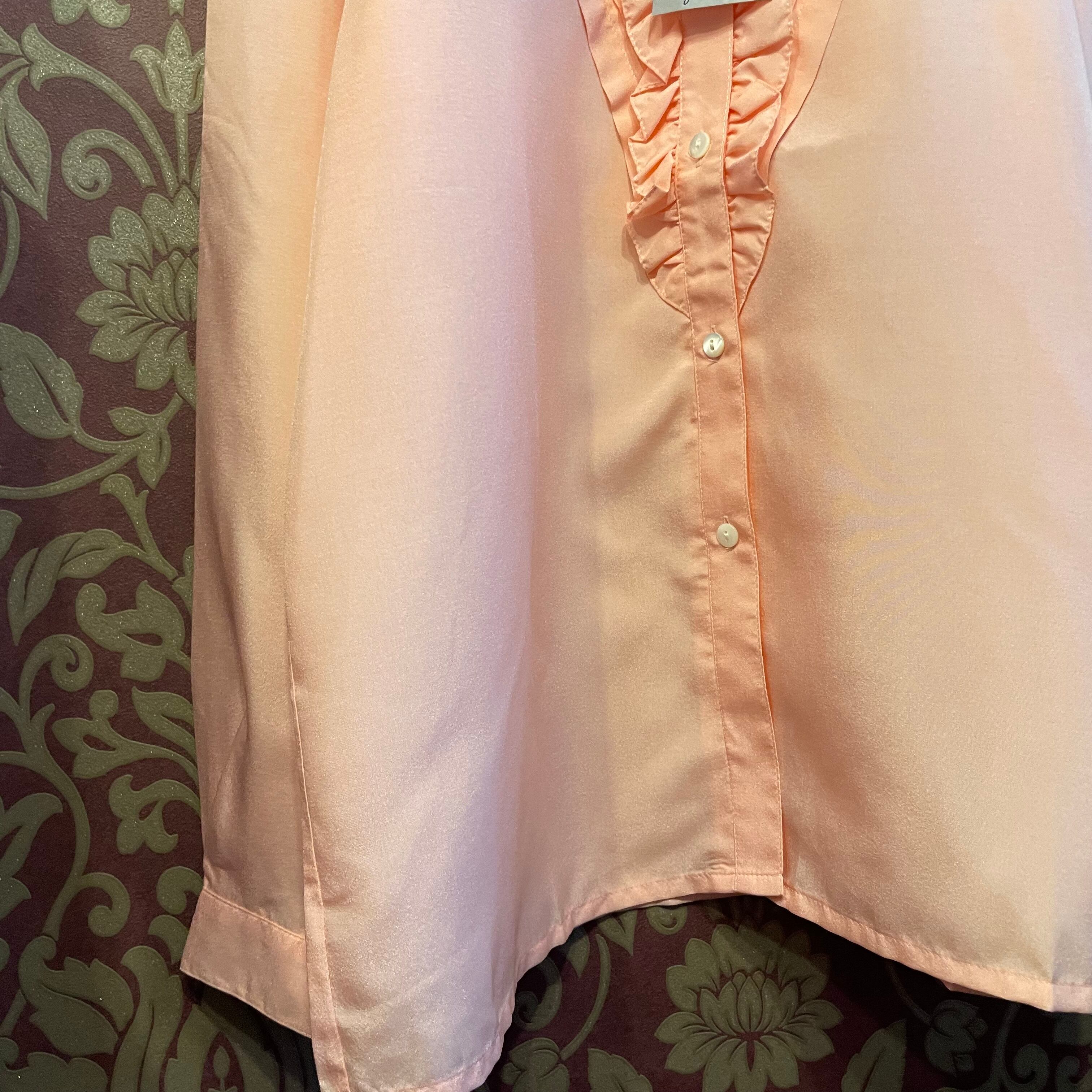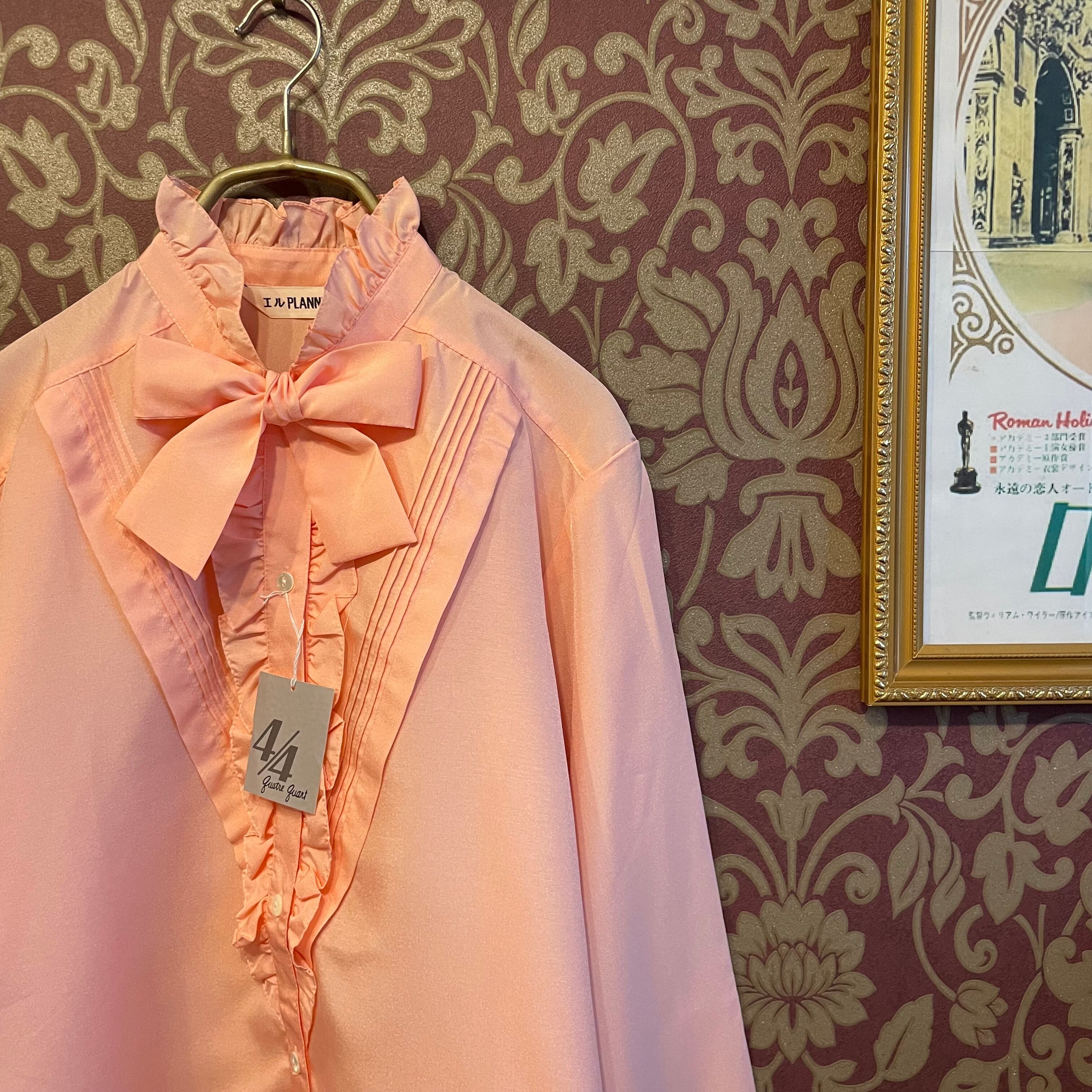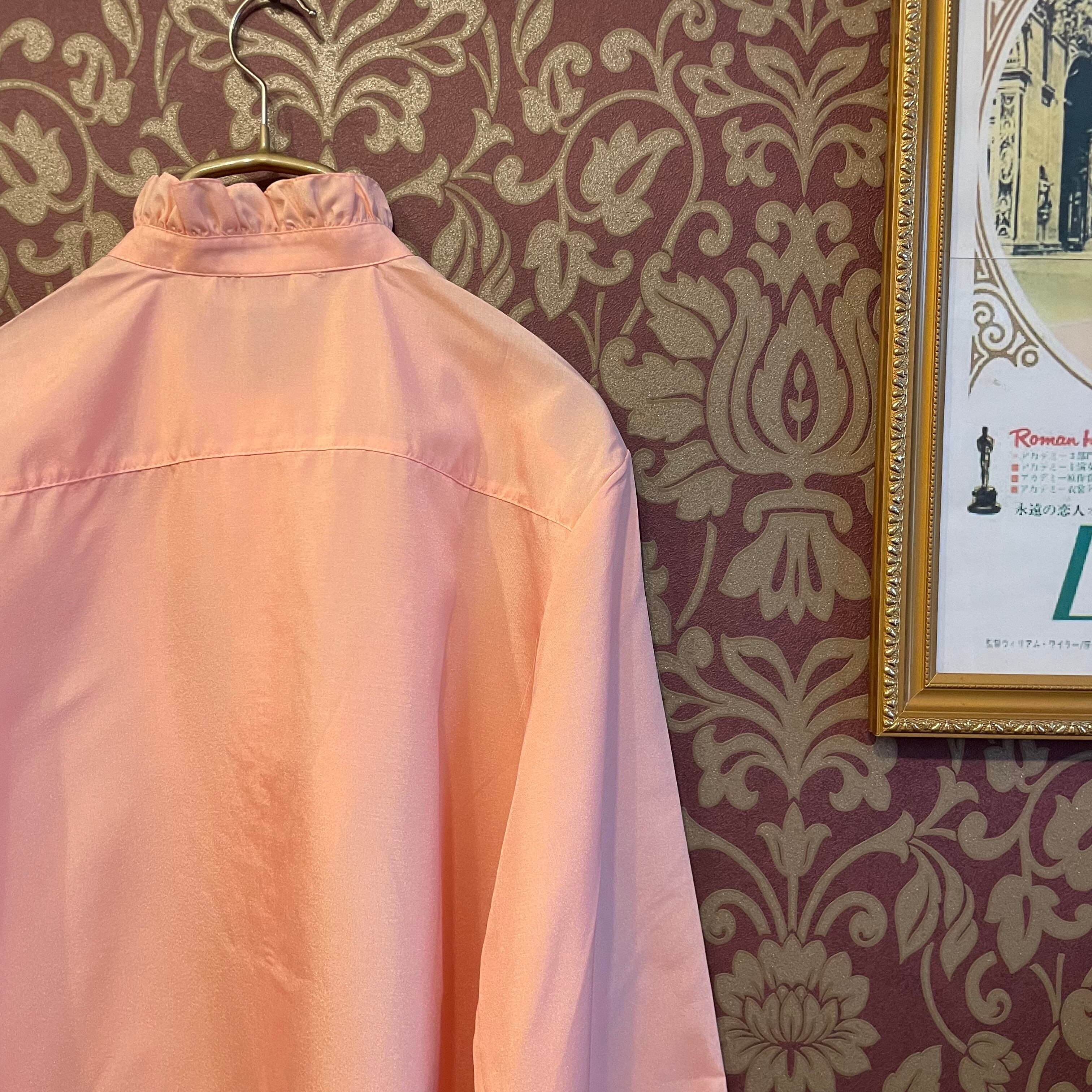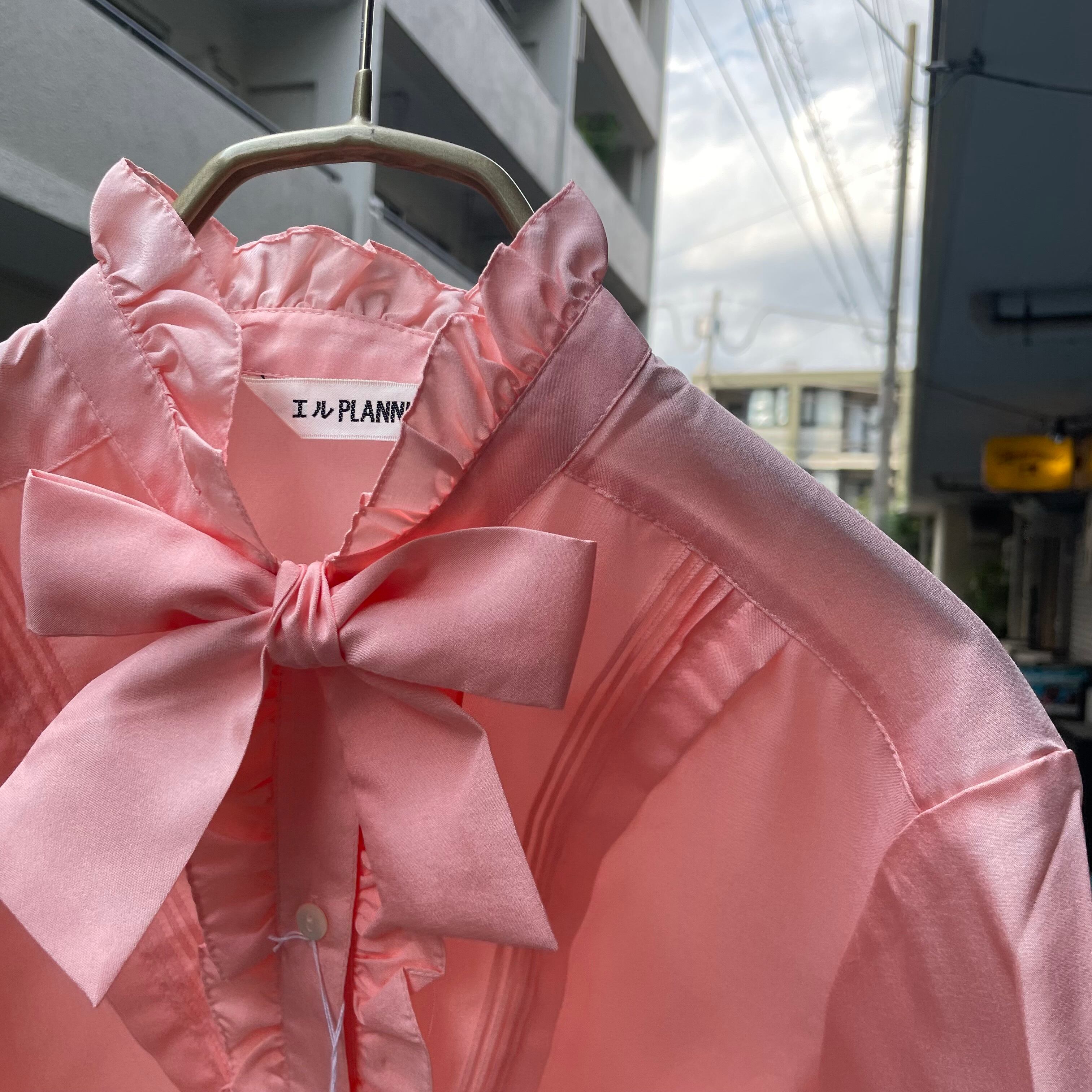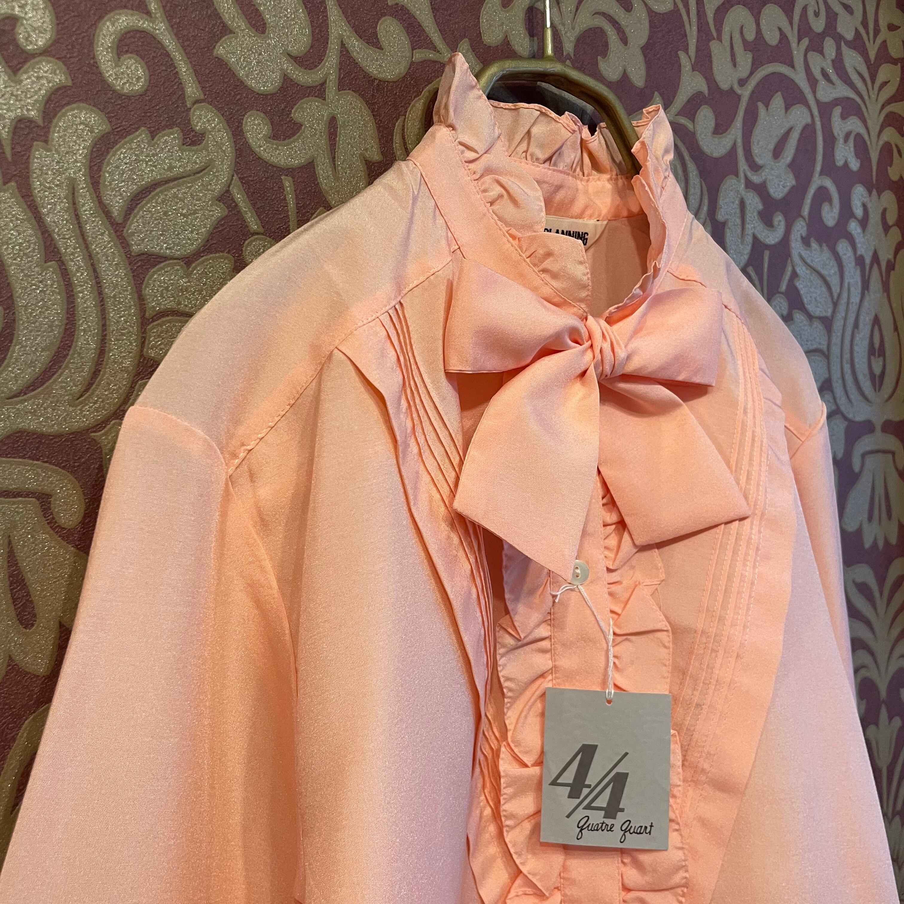 短く控えめなボウタイと、前立てのフリルとV字のピンタックが上品なデザインです。