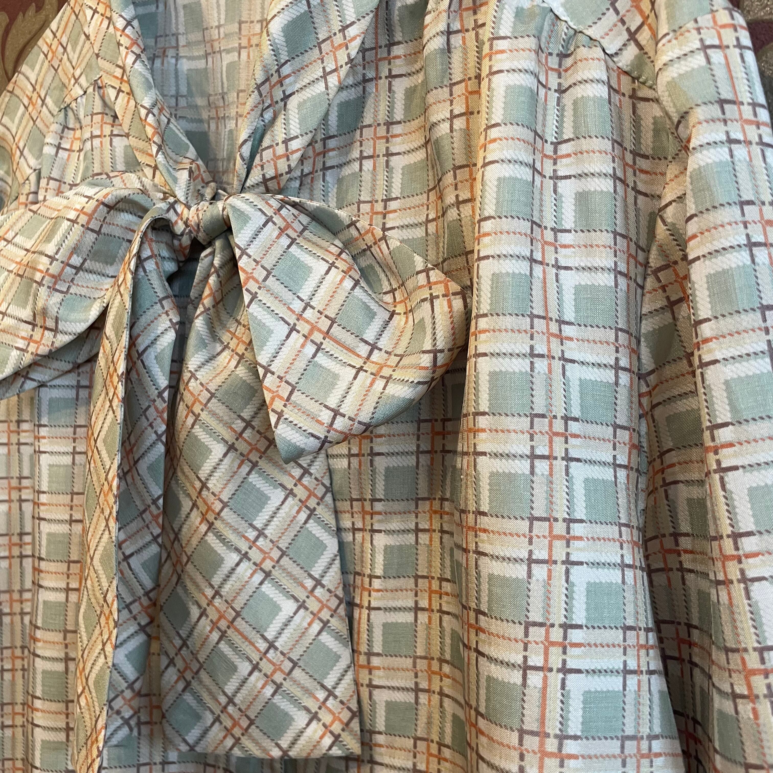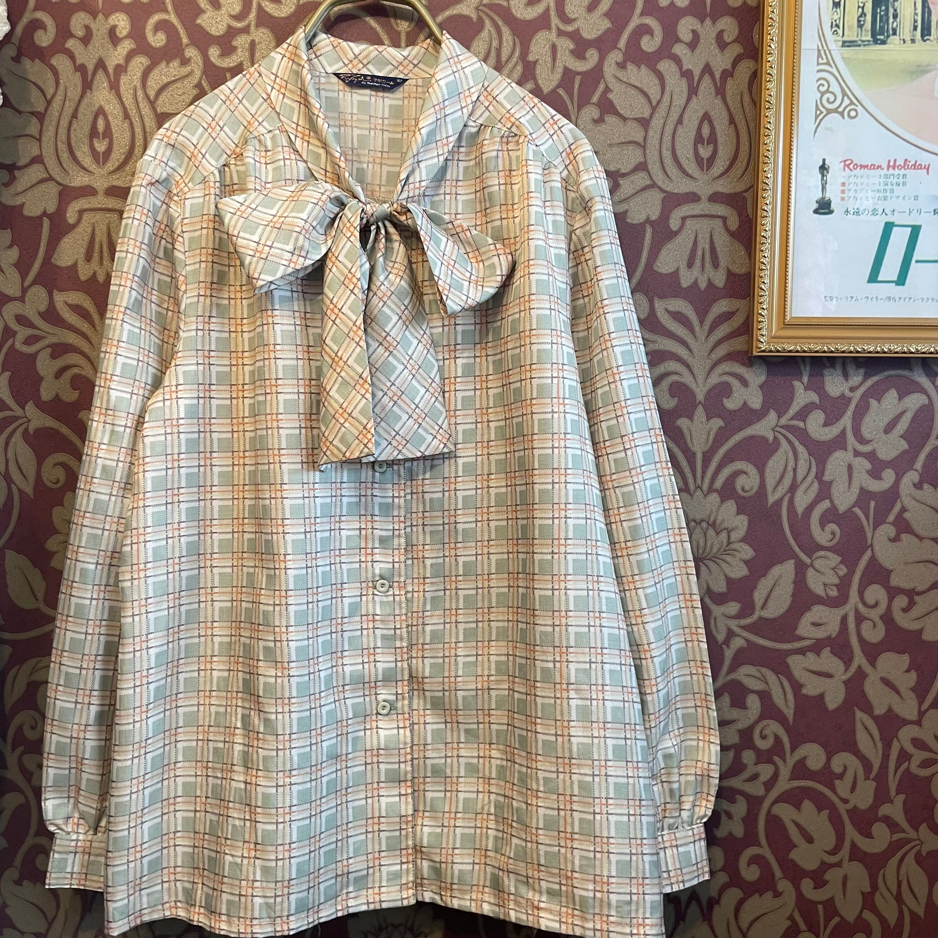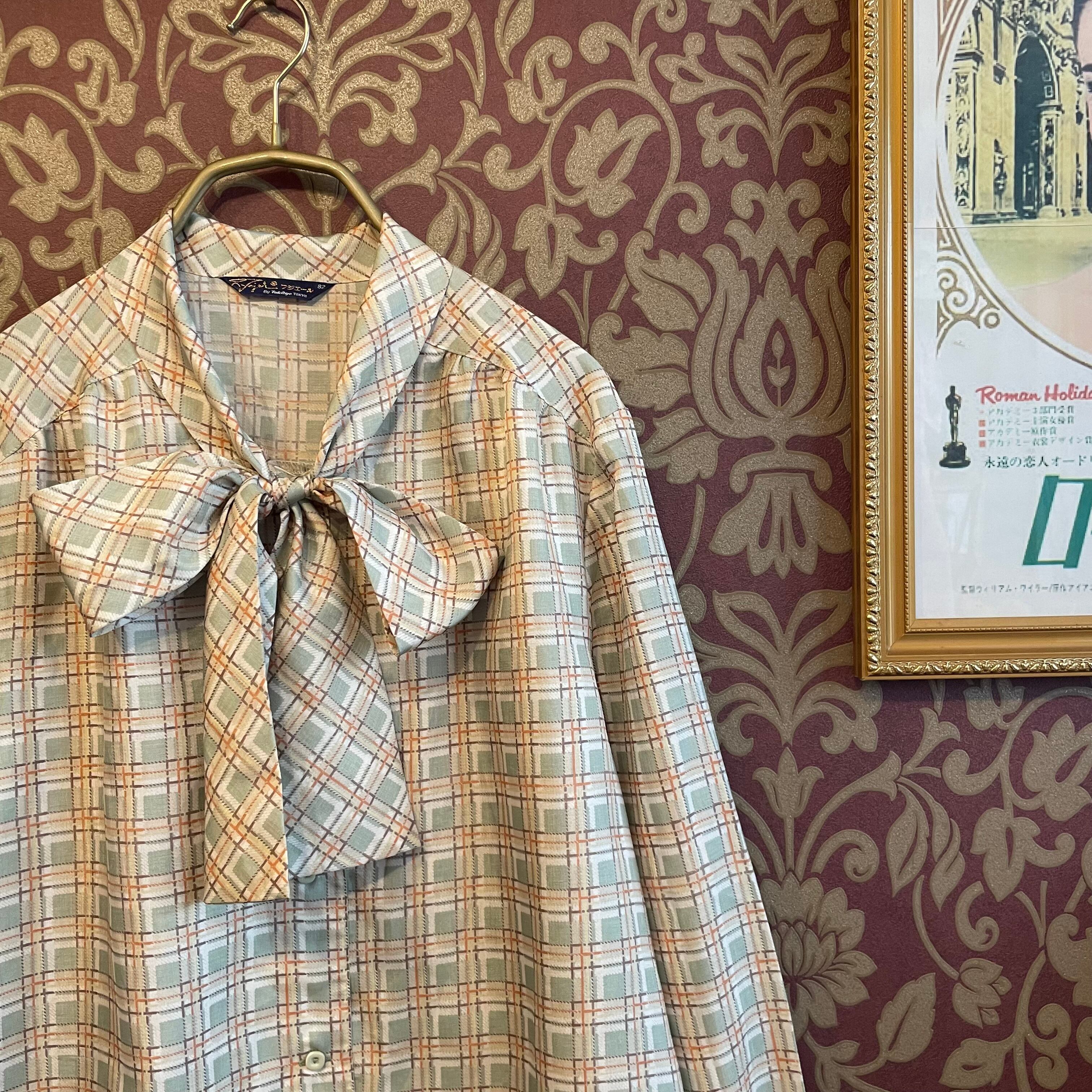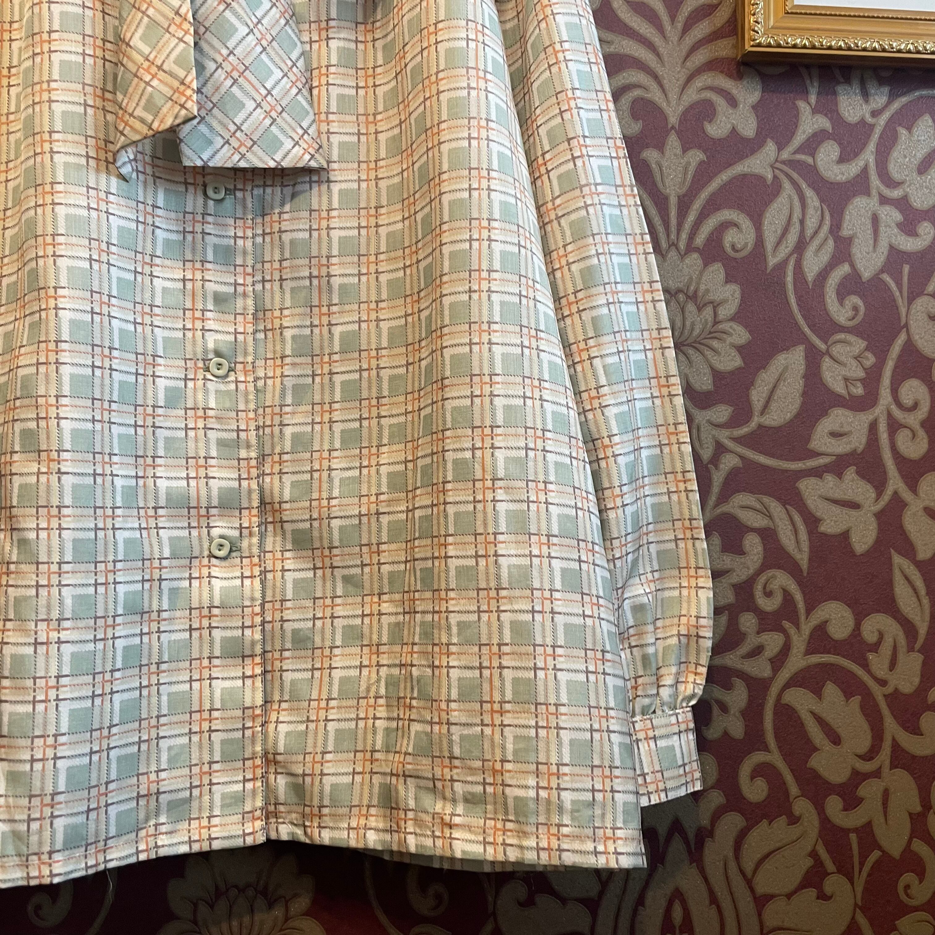 白をベースに翡翠、オレンジ、ベージュ、茶色のチェック柄のブラウスです。