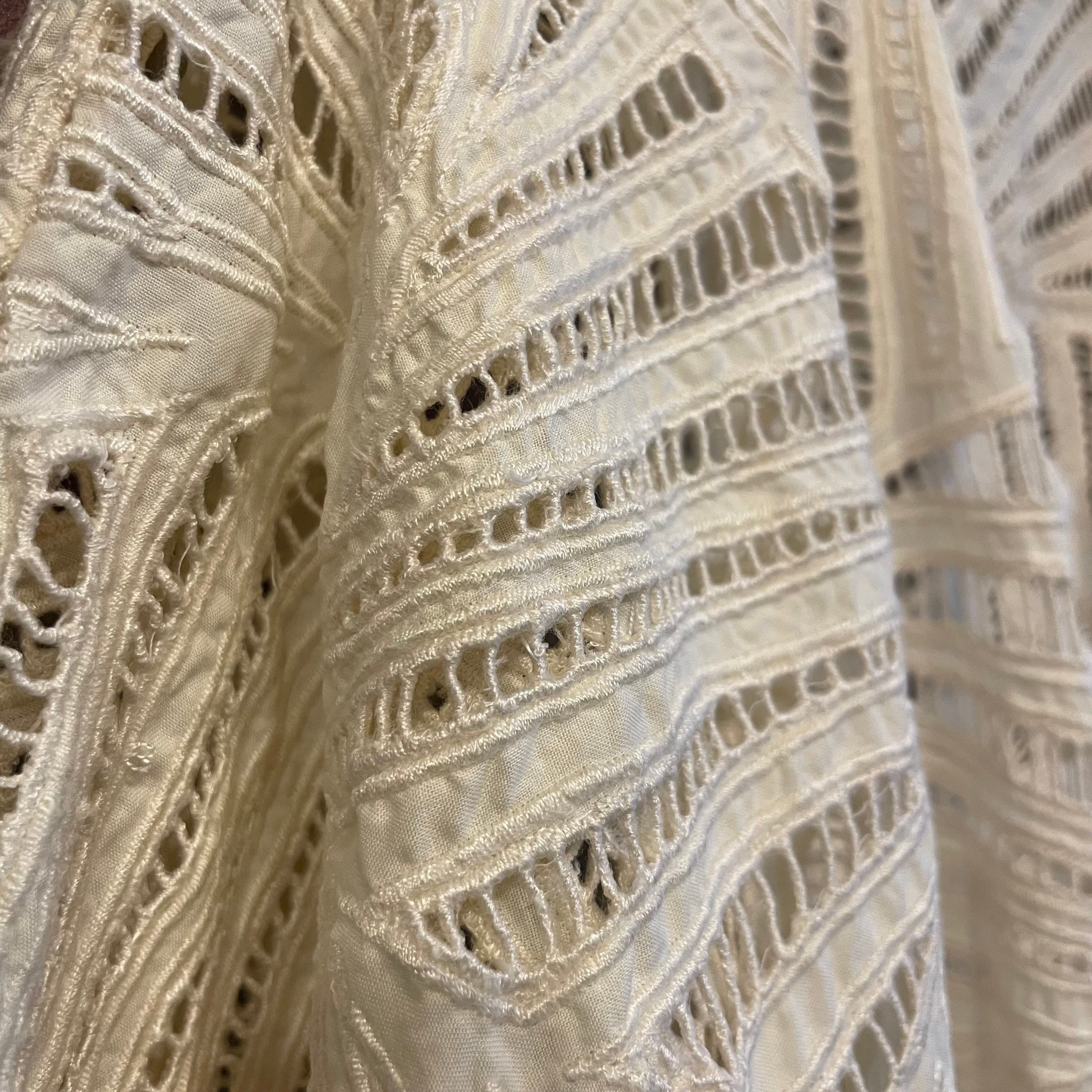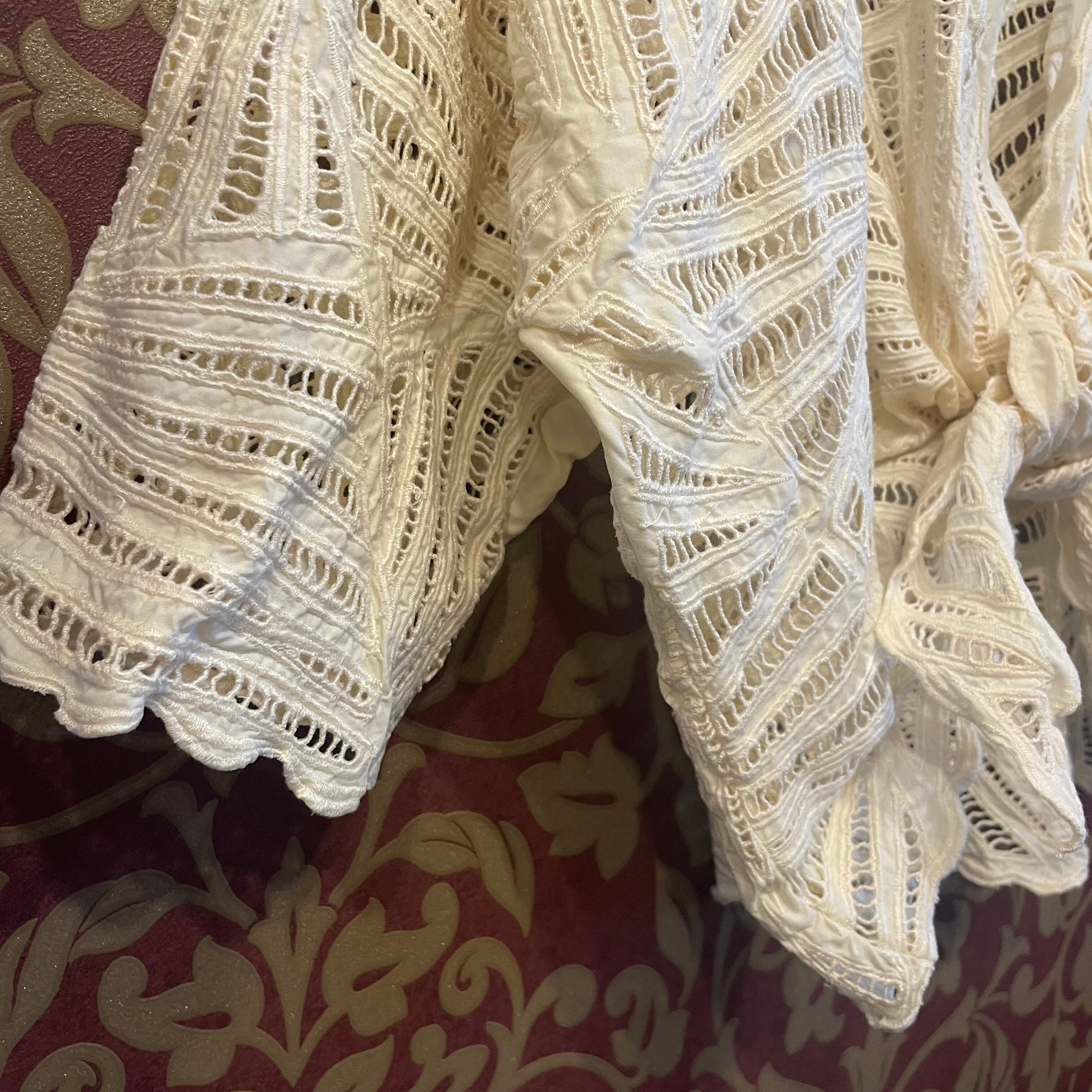 オフホワイトの刺繍のレースが美しいフロントタイトップスです。