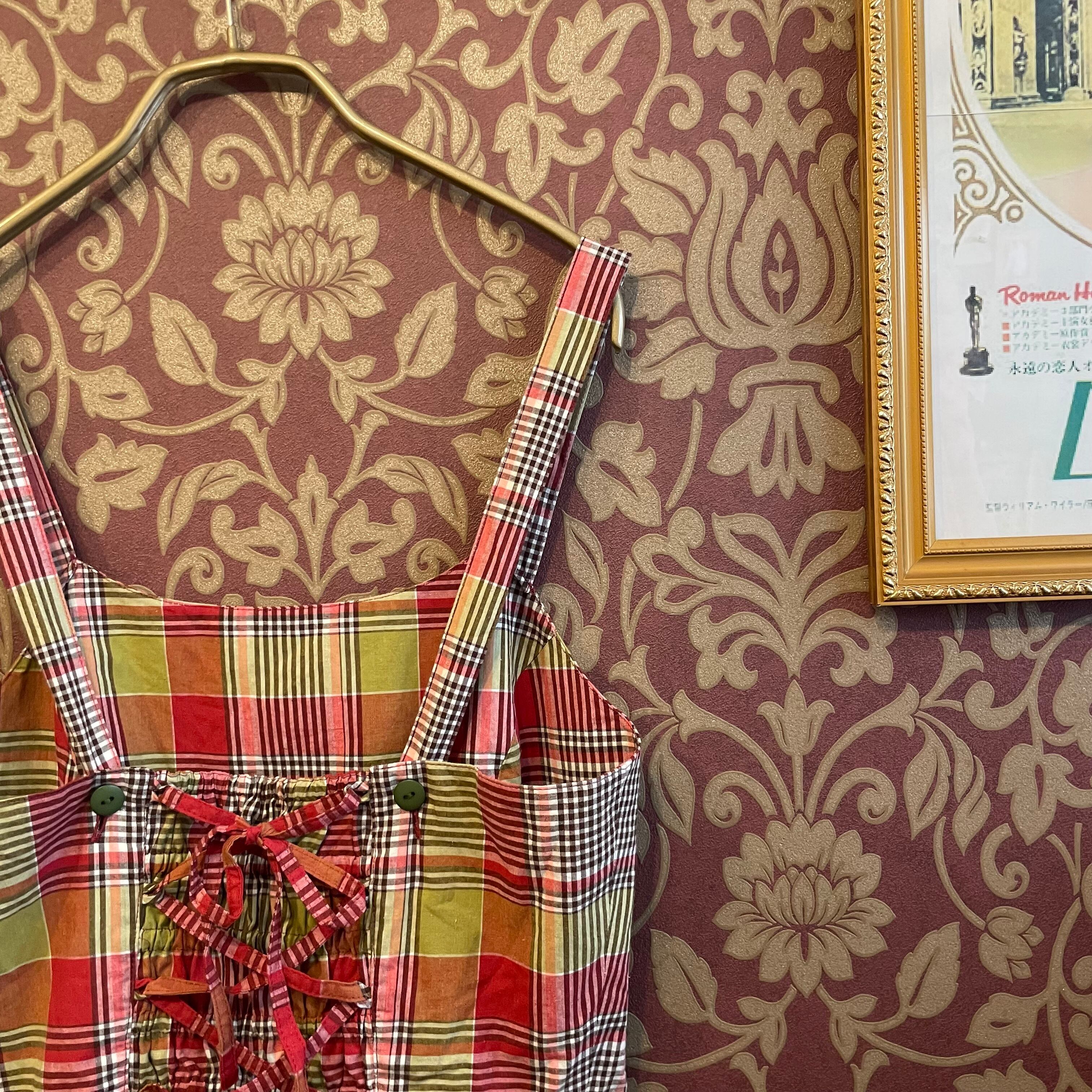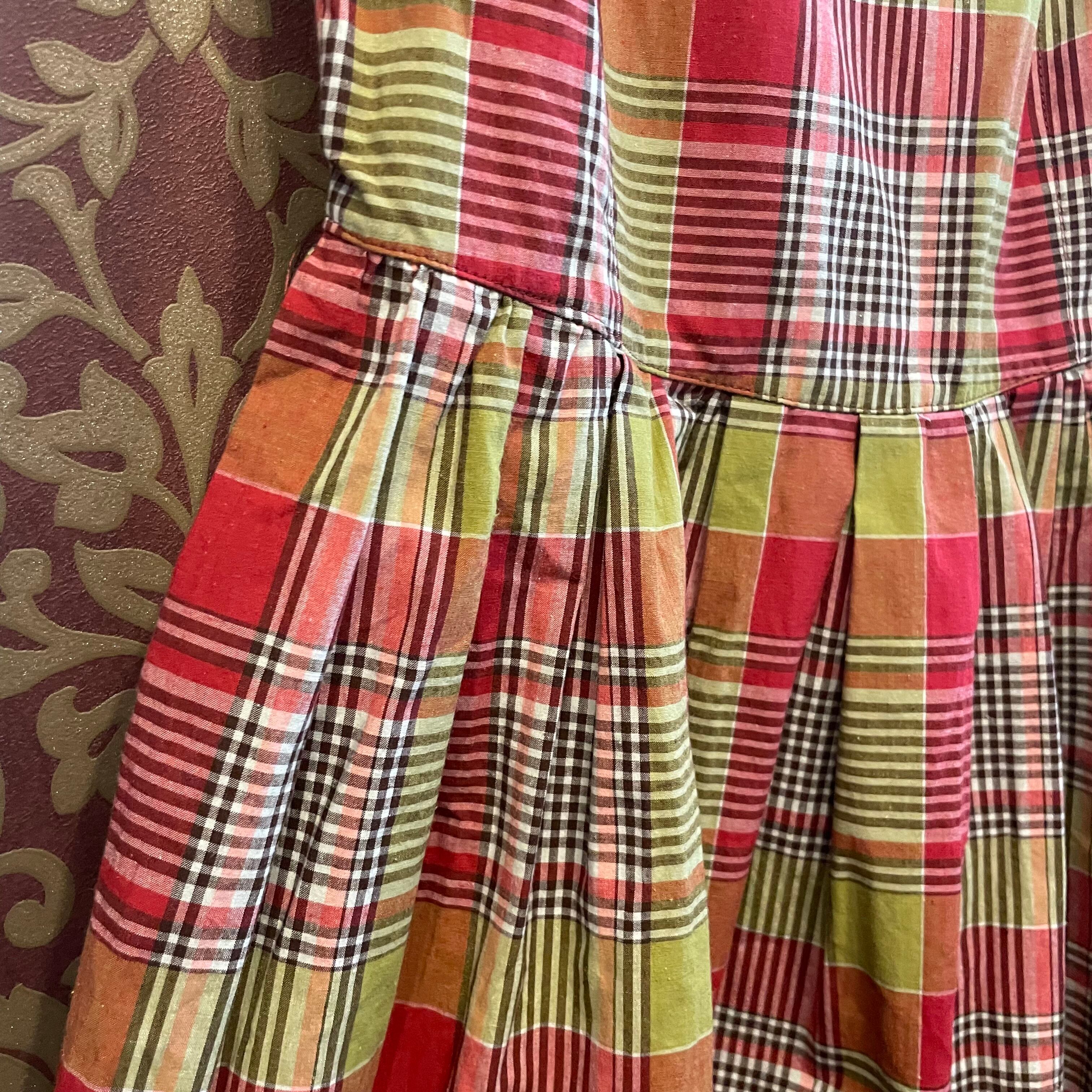 赤と黄緑のチェック柄ワンピースです。