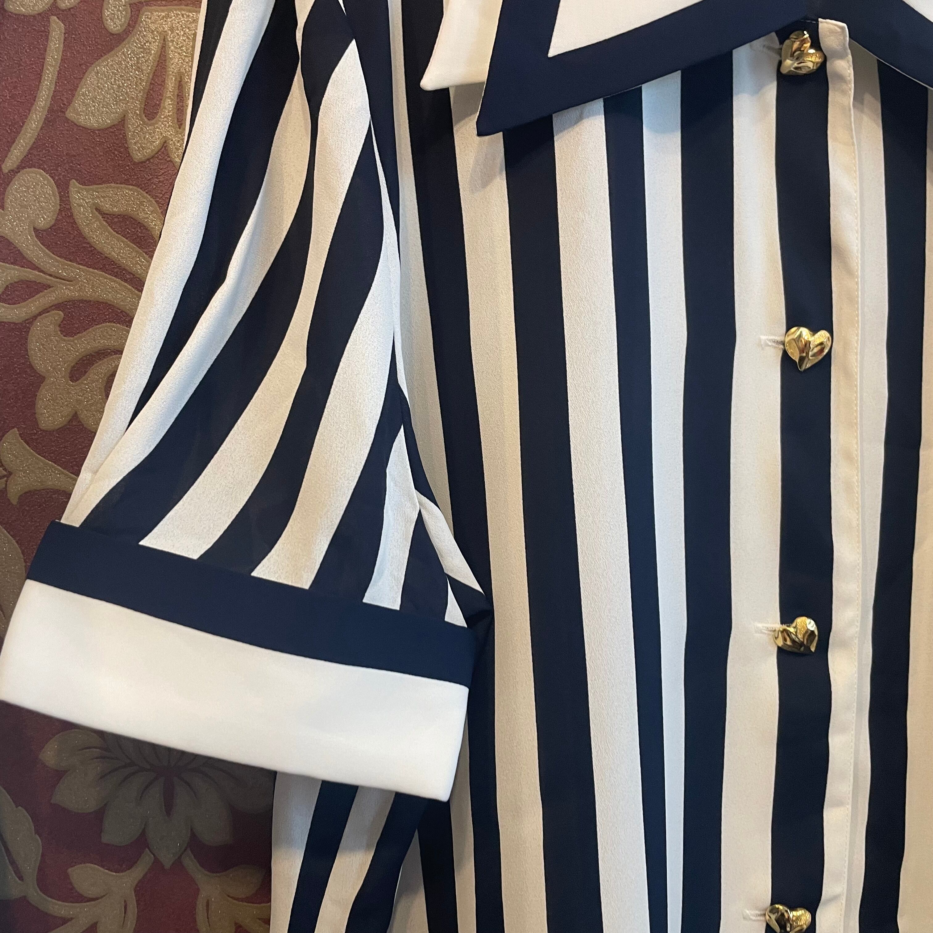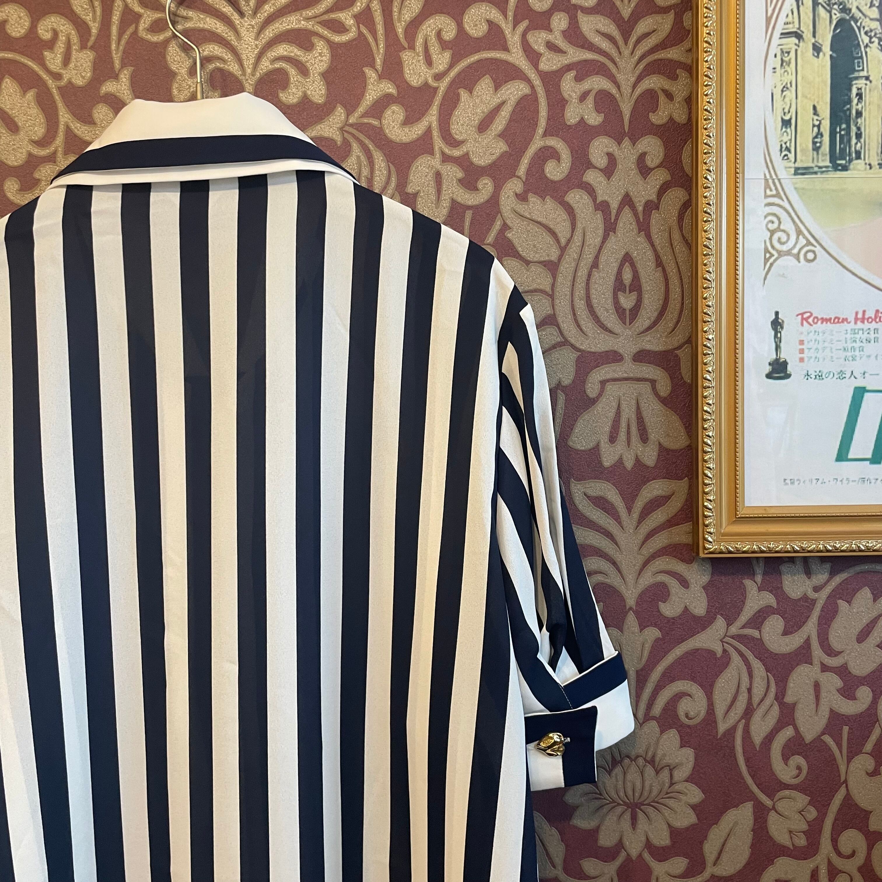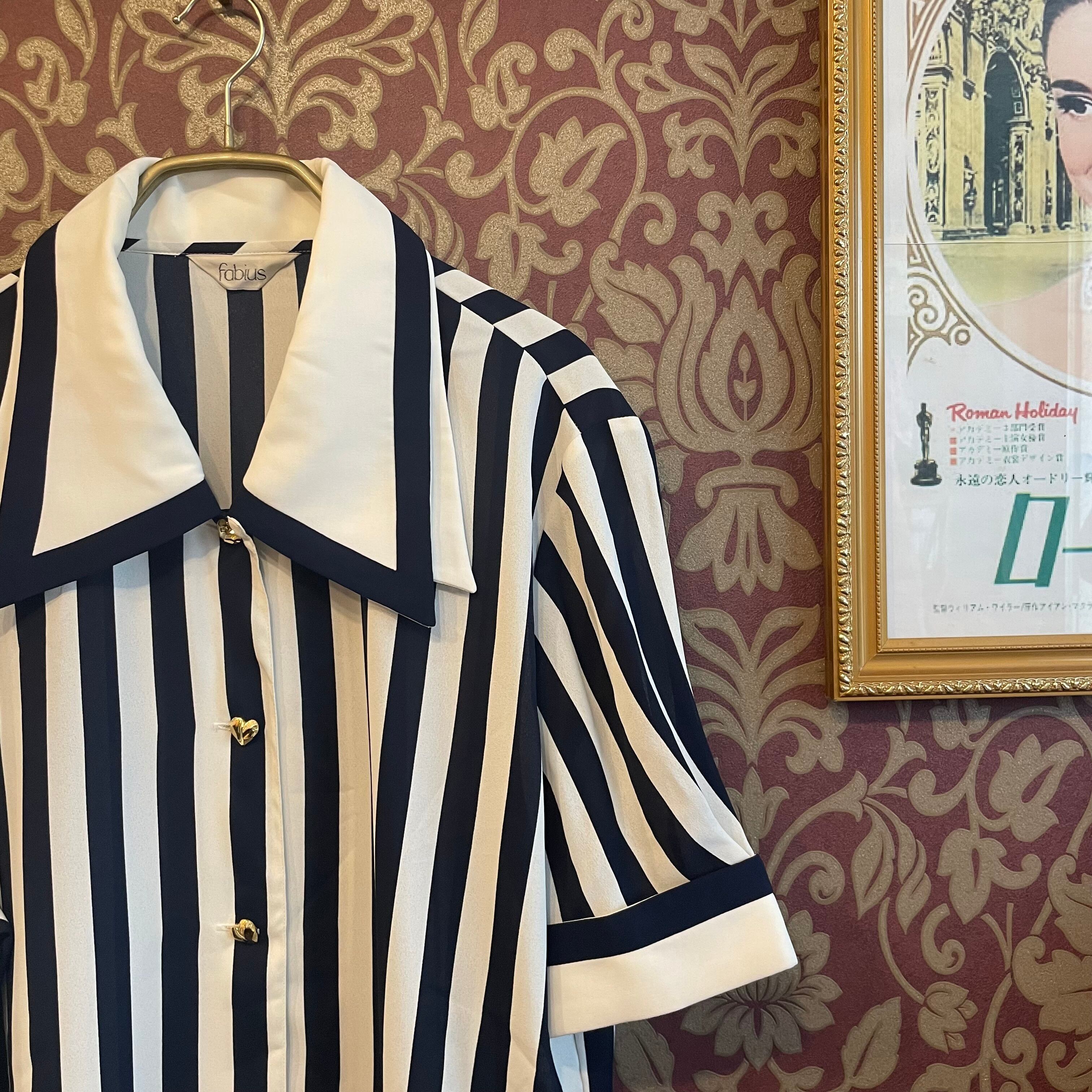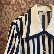 紺と白の太めのストライプが印象的な半袖ブラウスです。