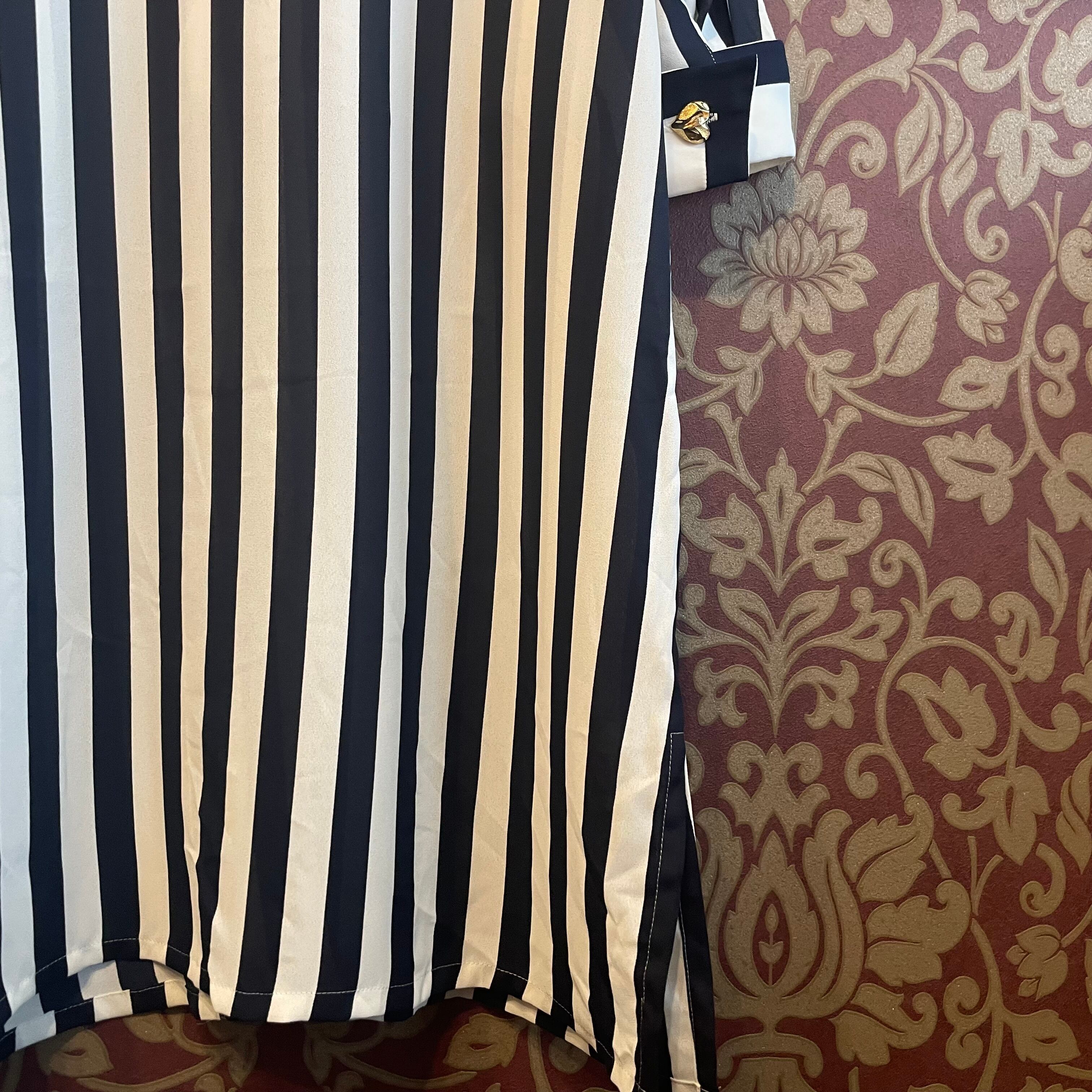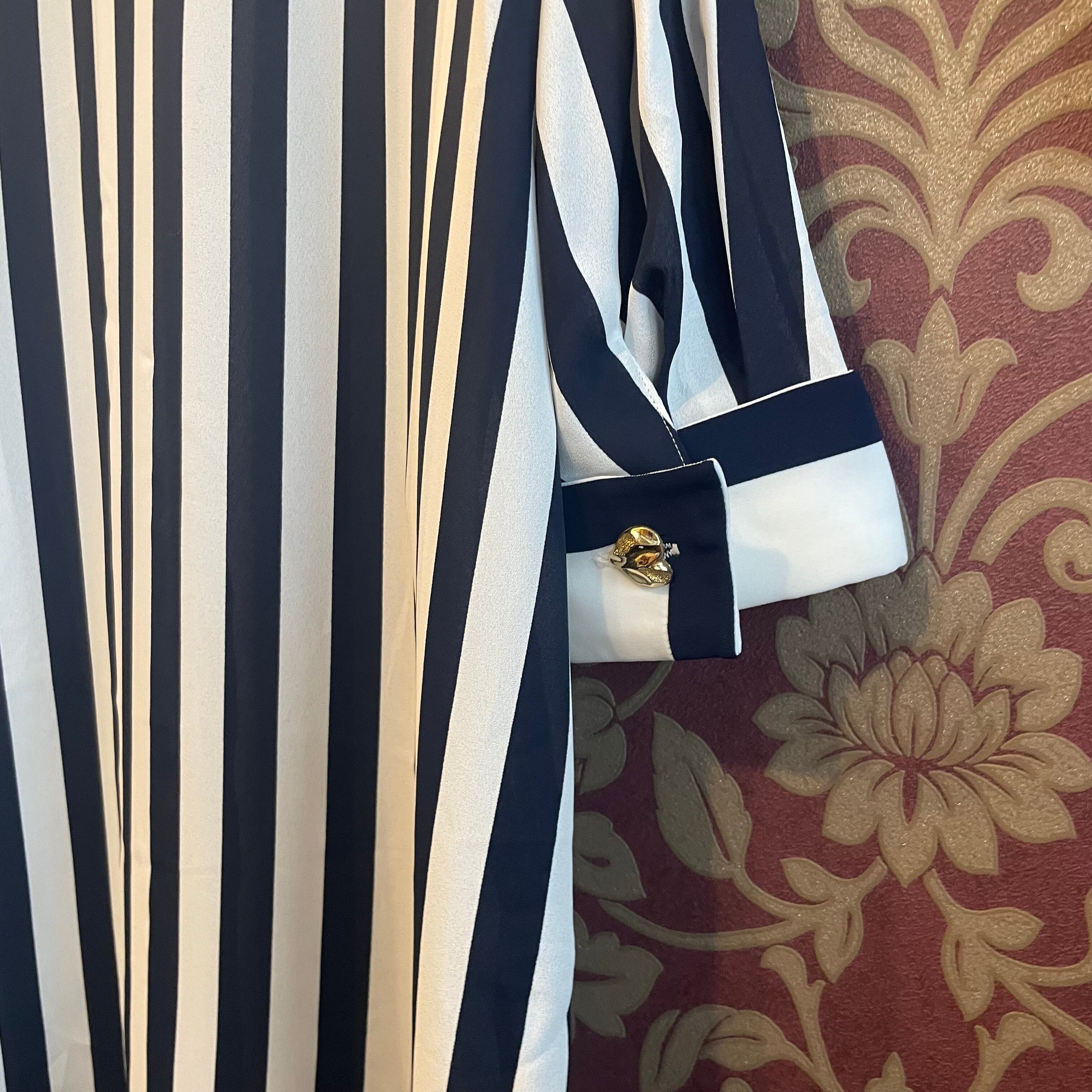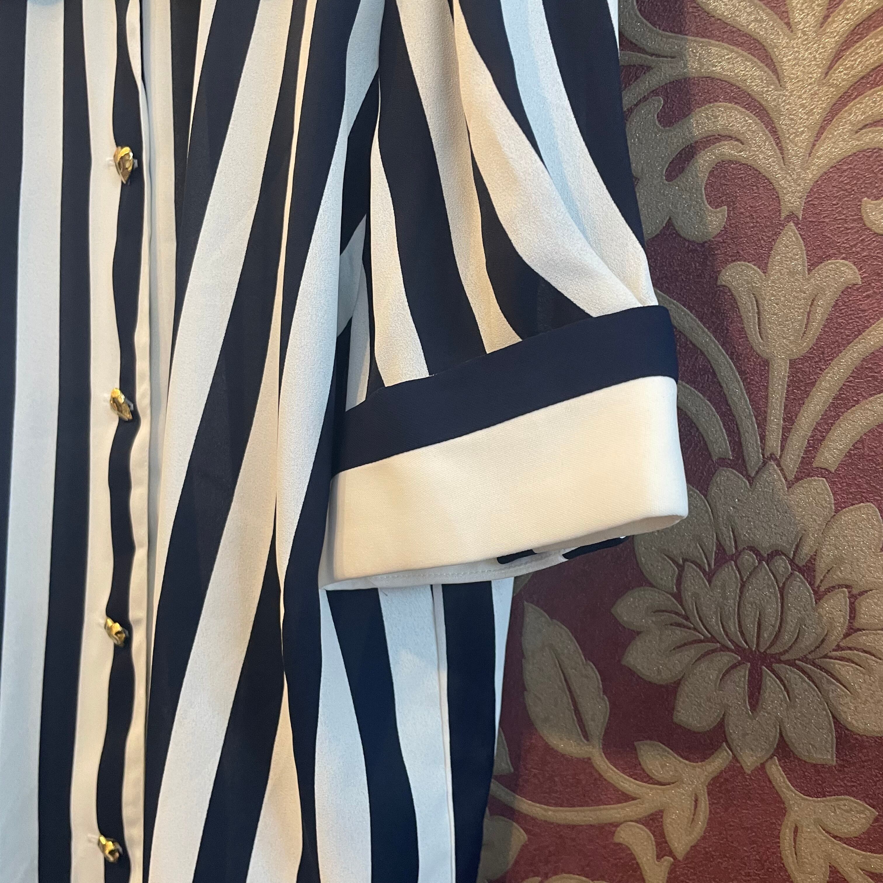 紺と白の太めのストライプが印象的な半袖ブラウスです。