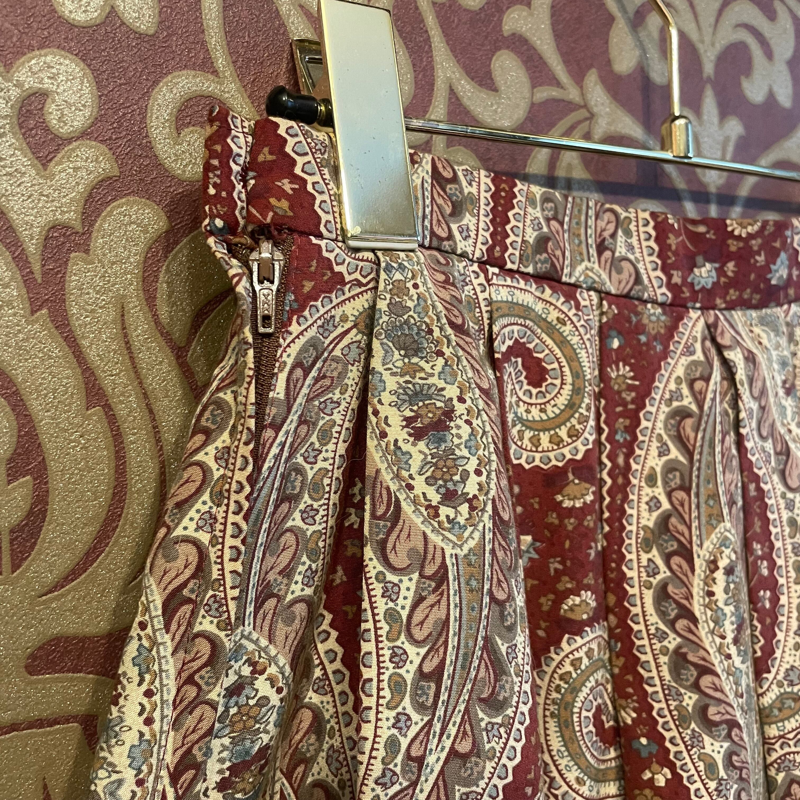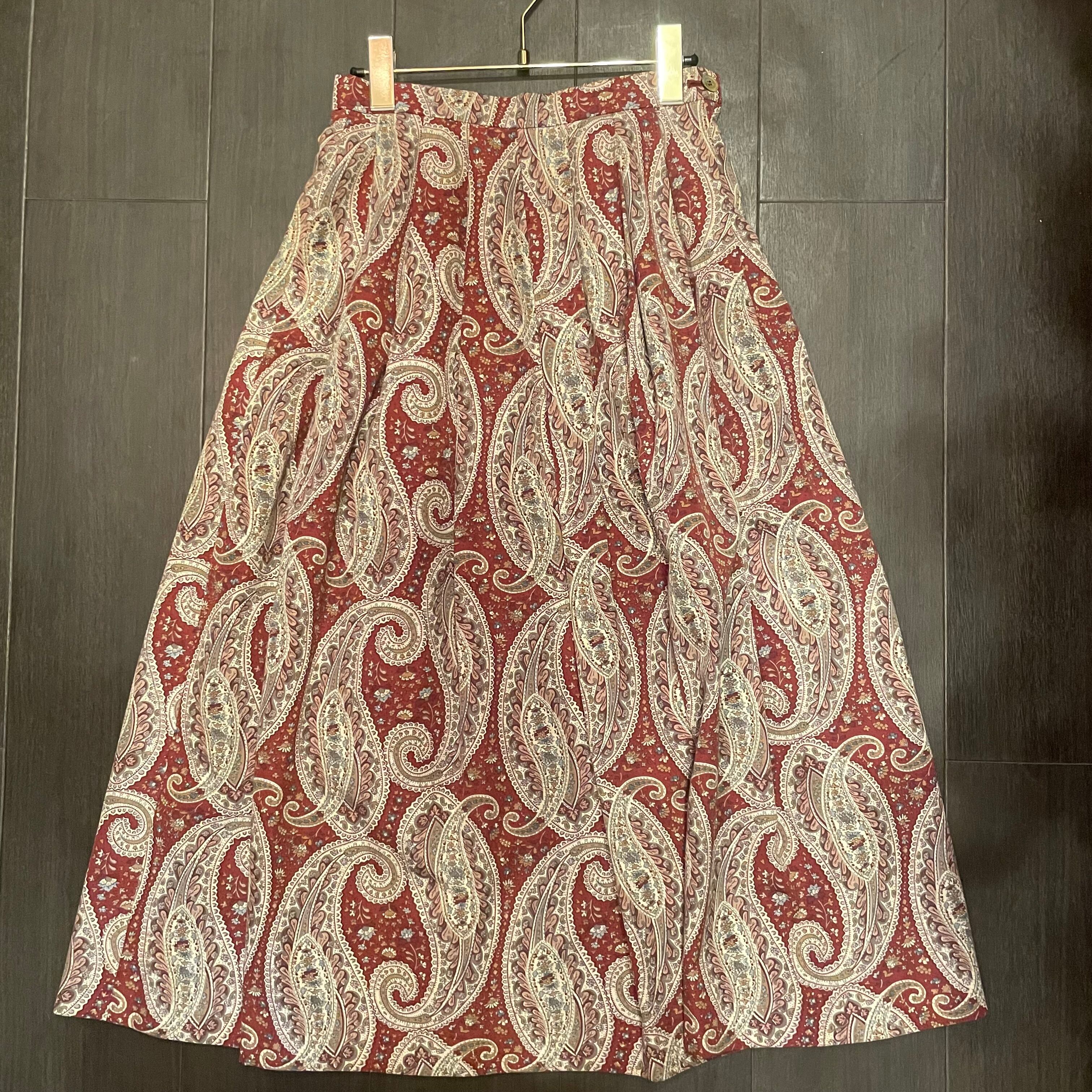 ベースは赤茶色のこっくりとしたカラーで、大きめのペイズリー柄が印象的なデザインです。