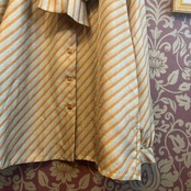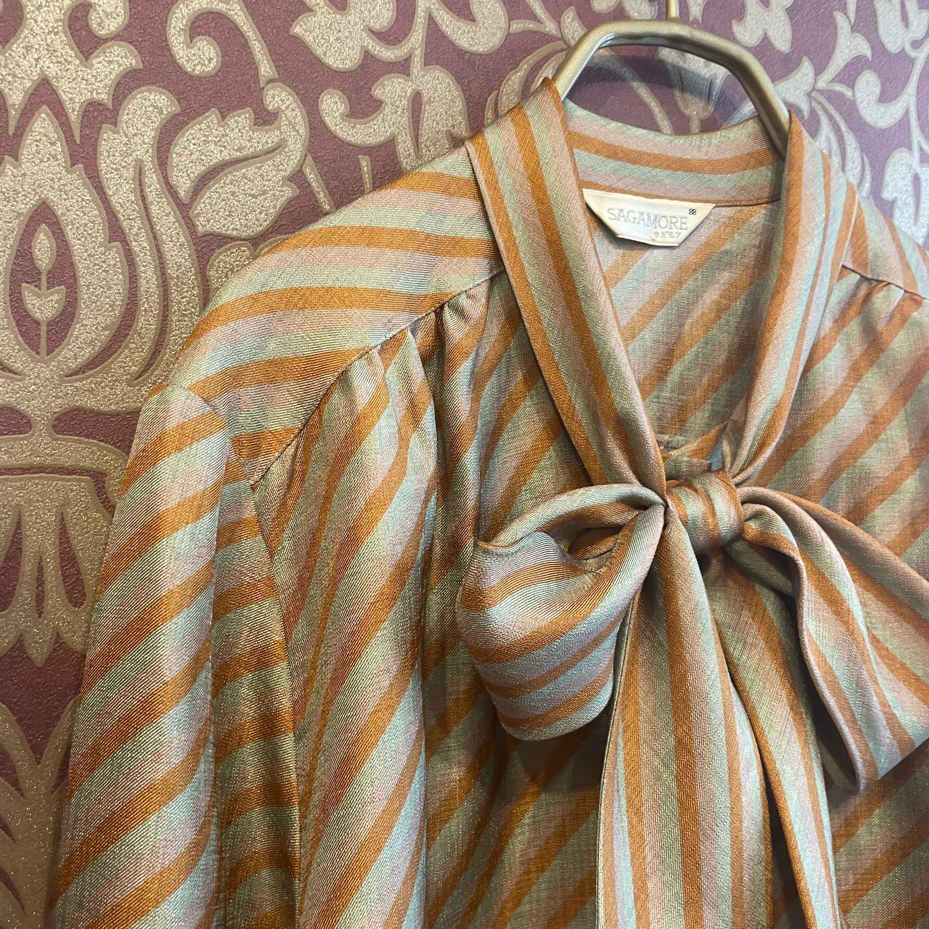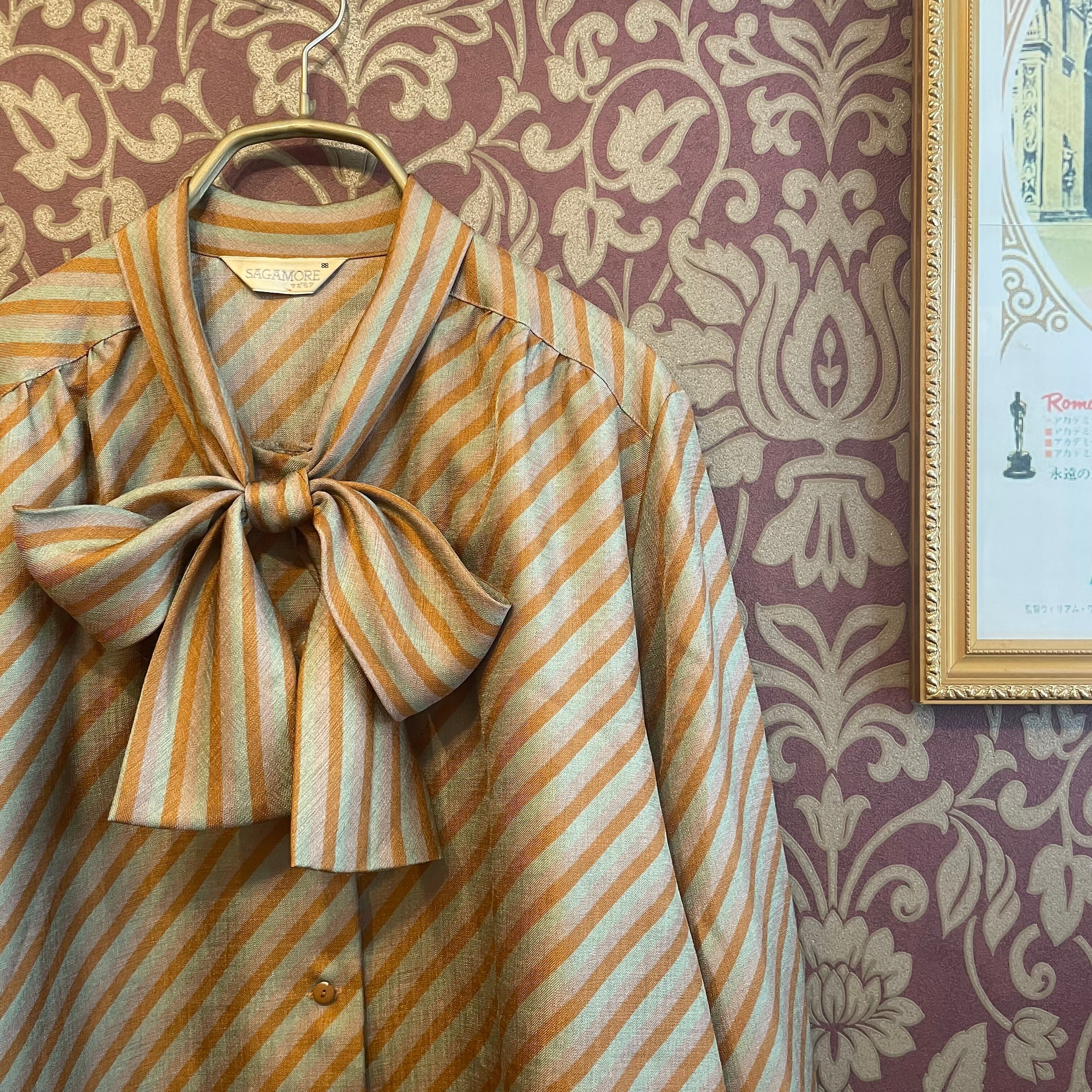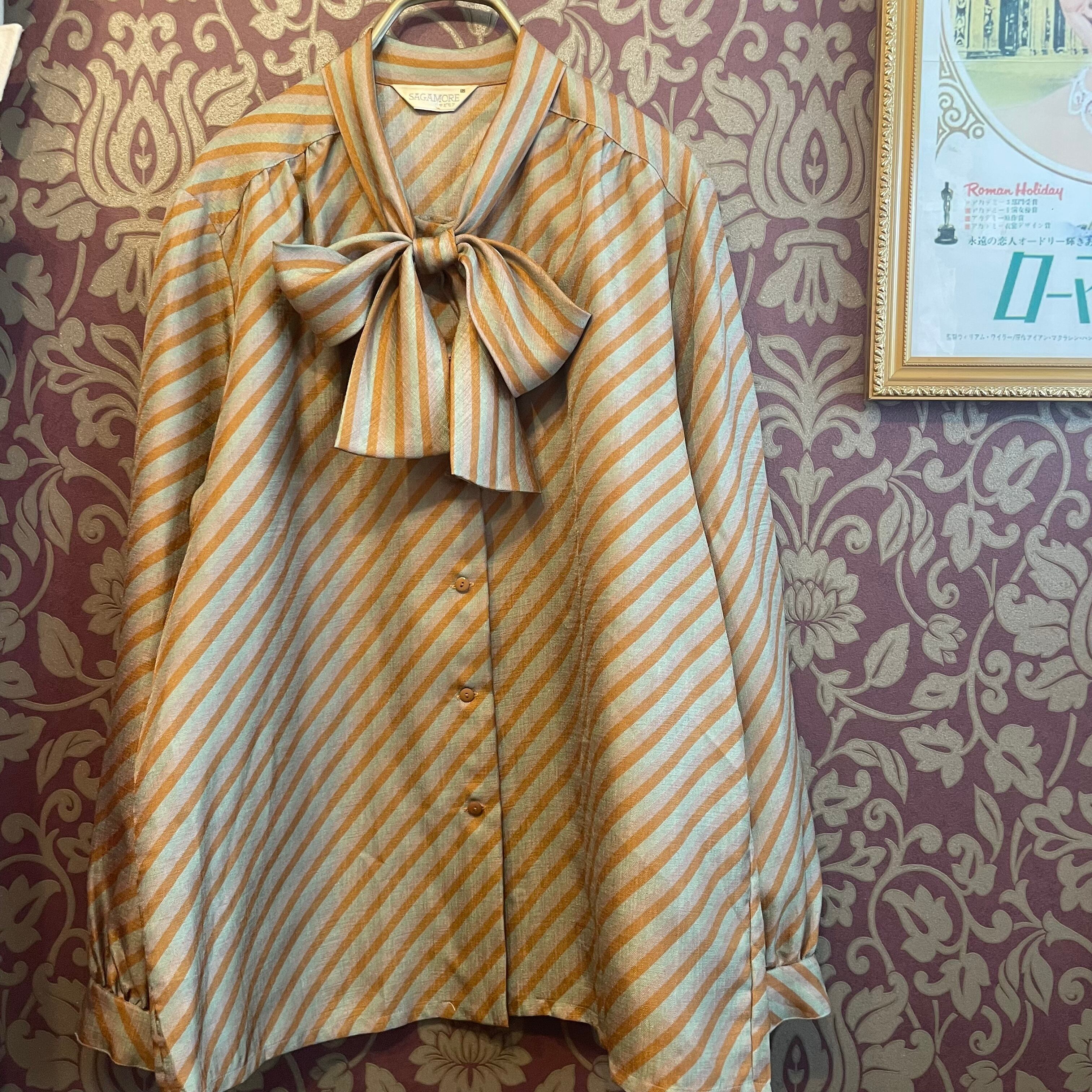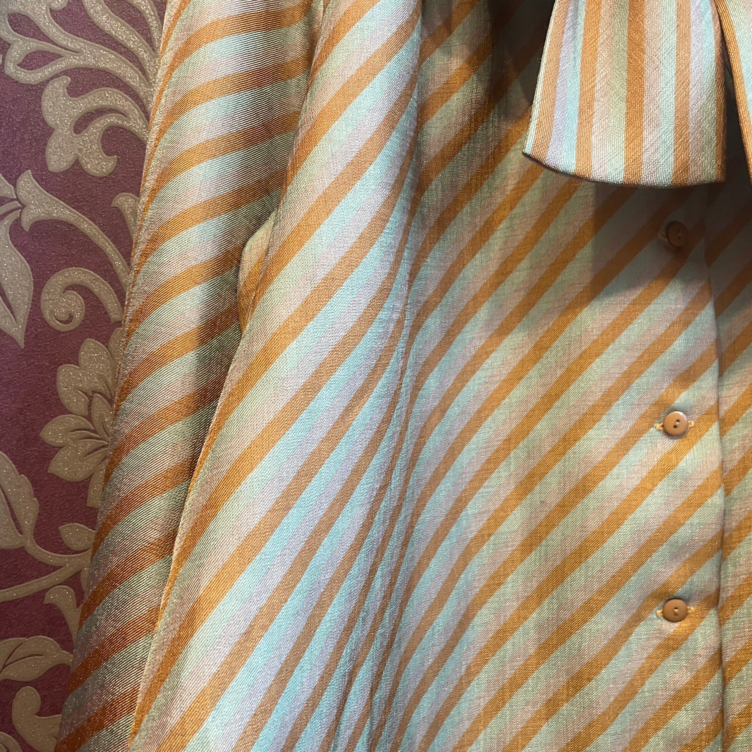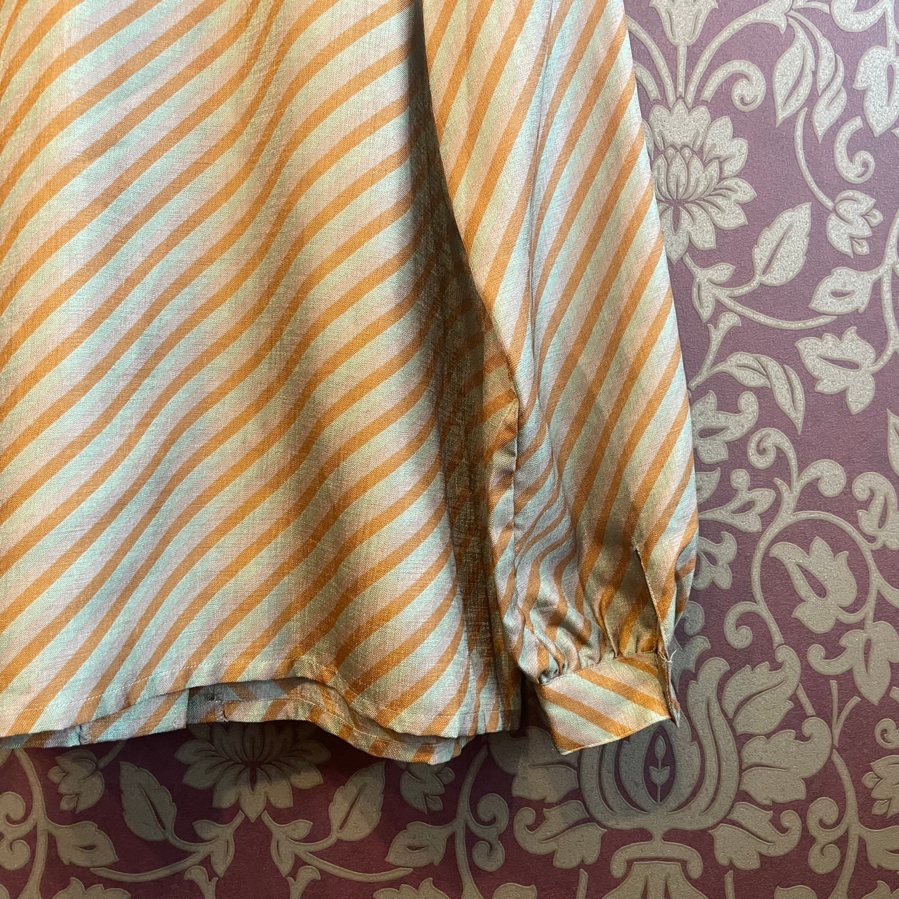 オレンジ、ミント、ピンクなどの深くくすんだカラーのストライプ柄ブラウスです。