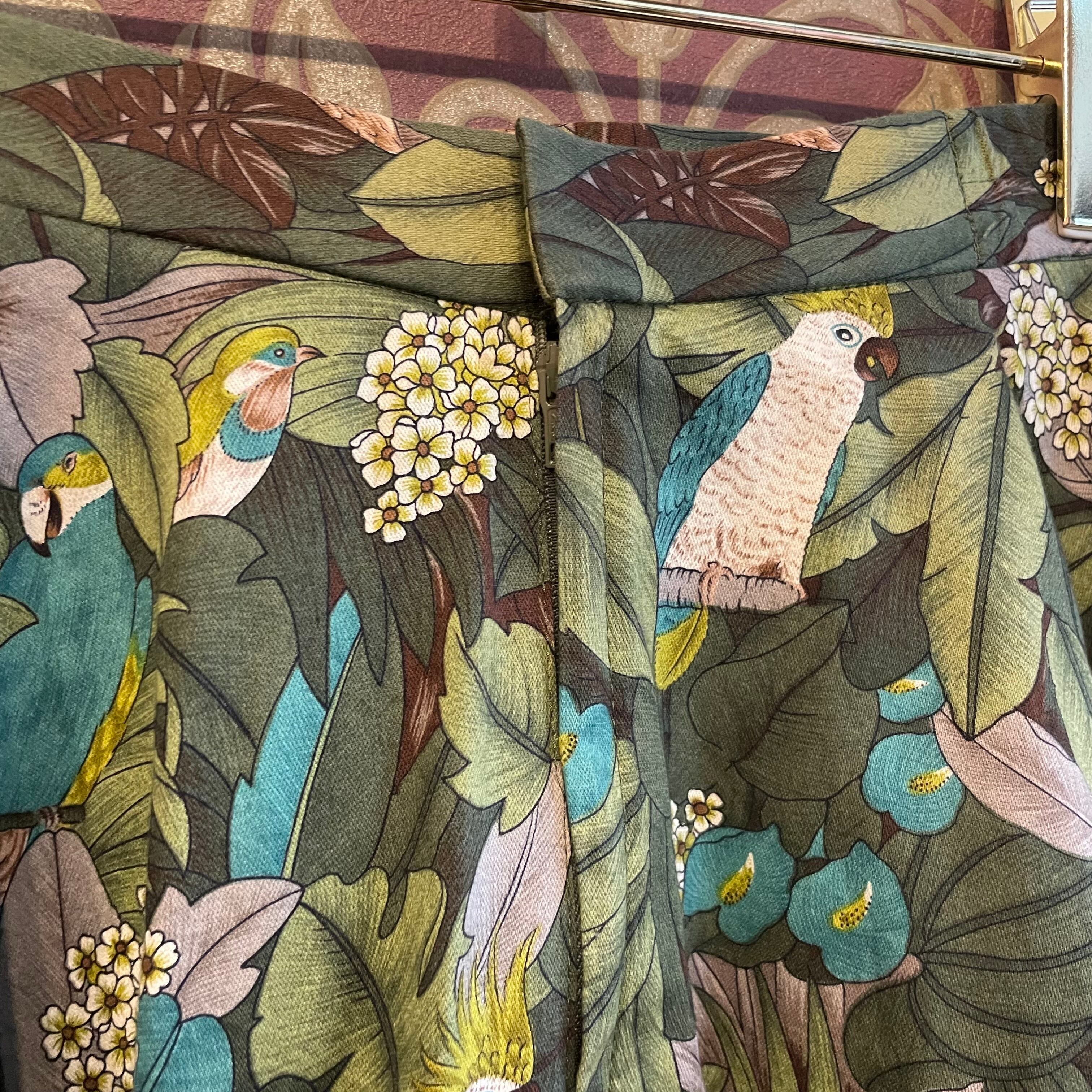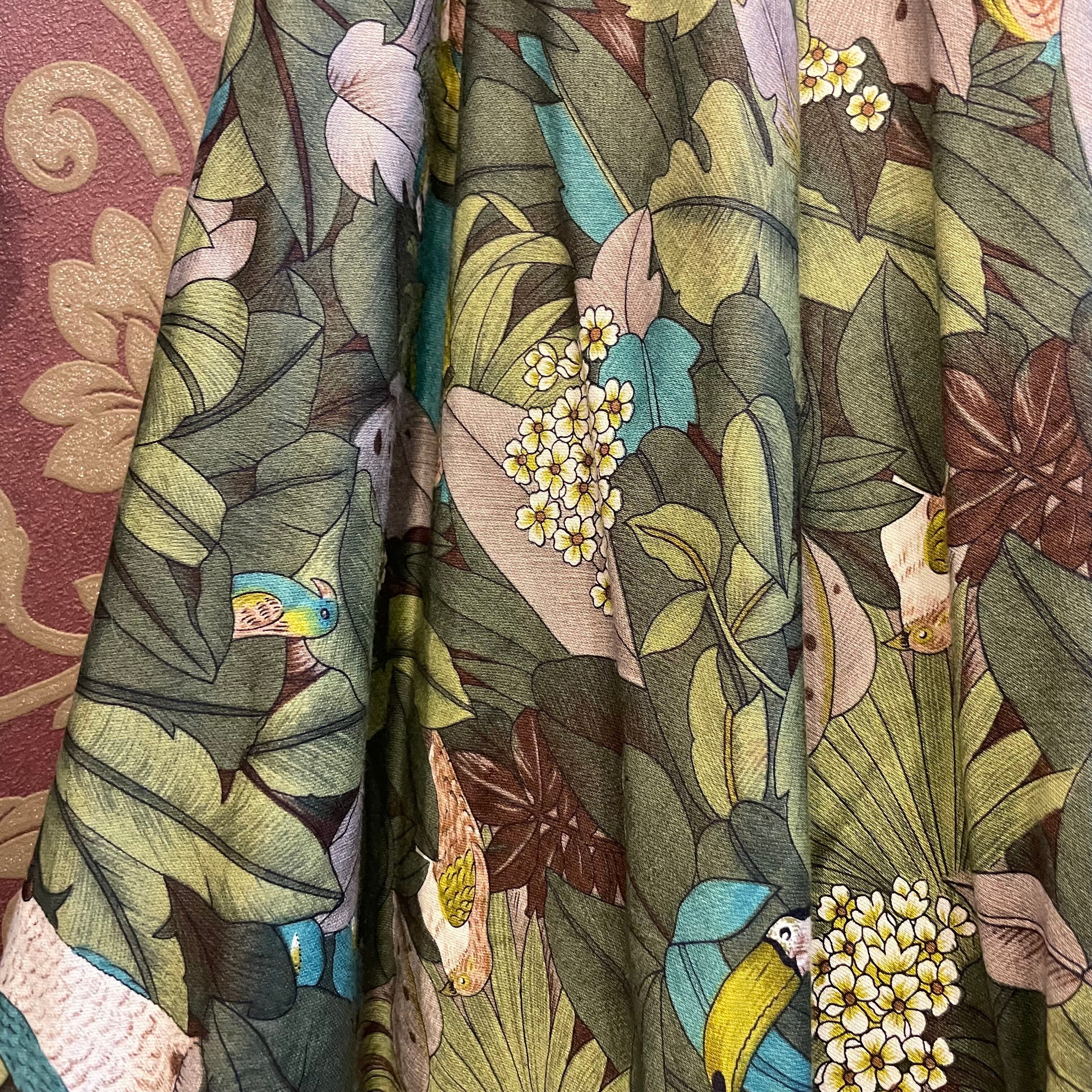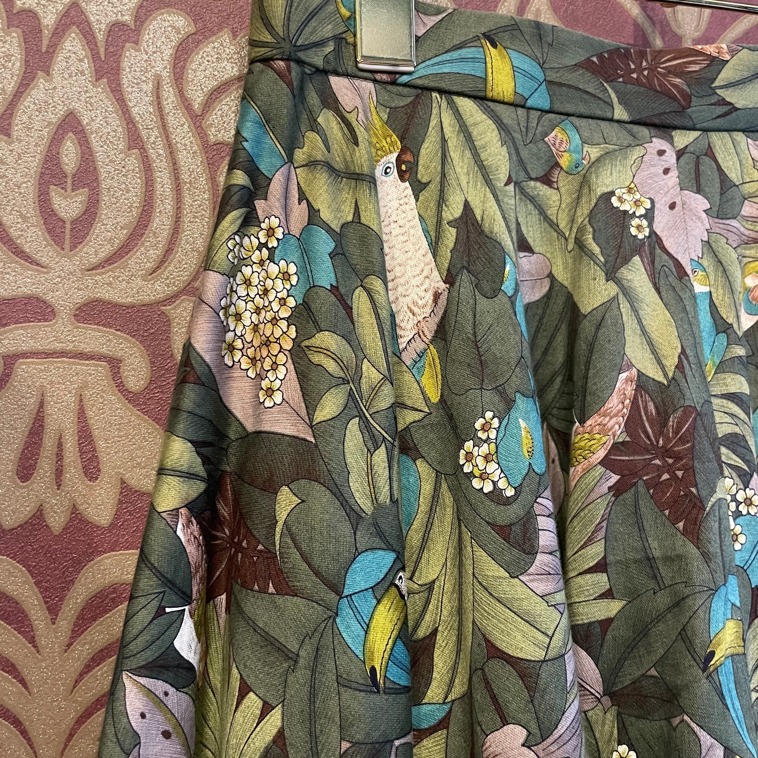 ジャングルの中にオウムやウグイスなどの様々な鳥柄スカートです。