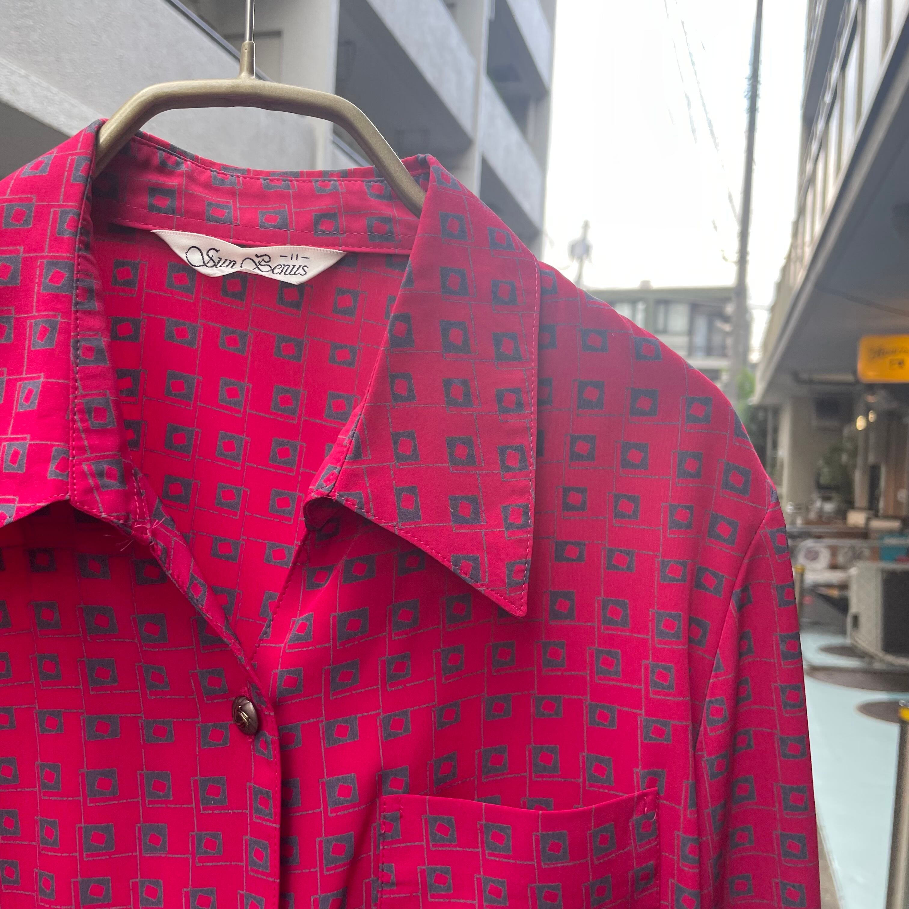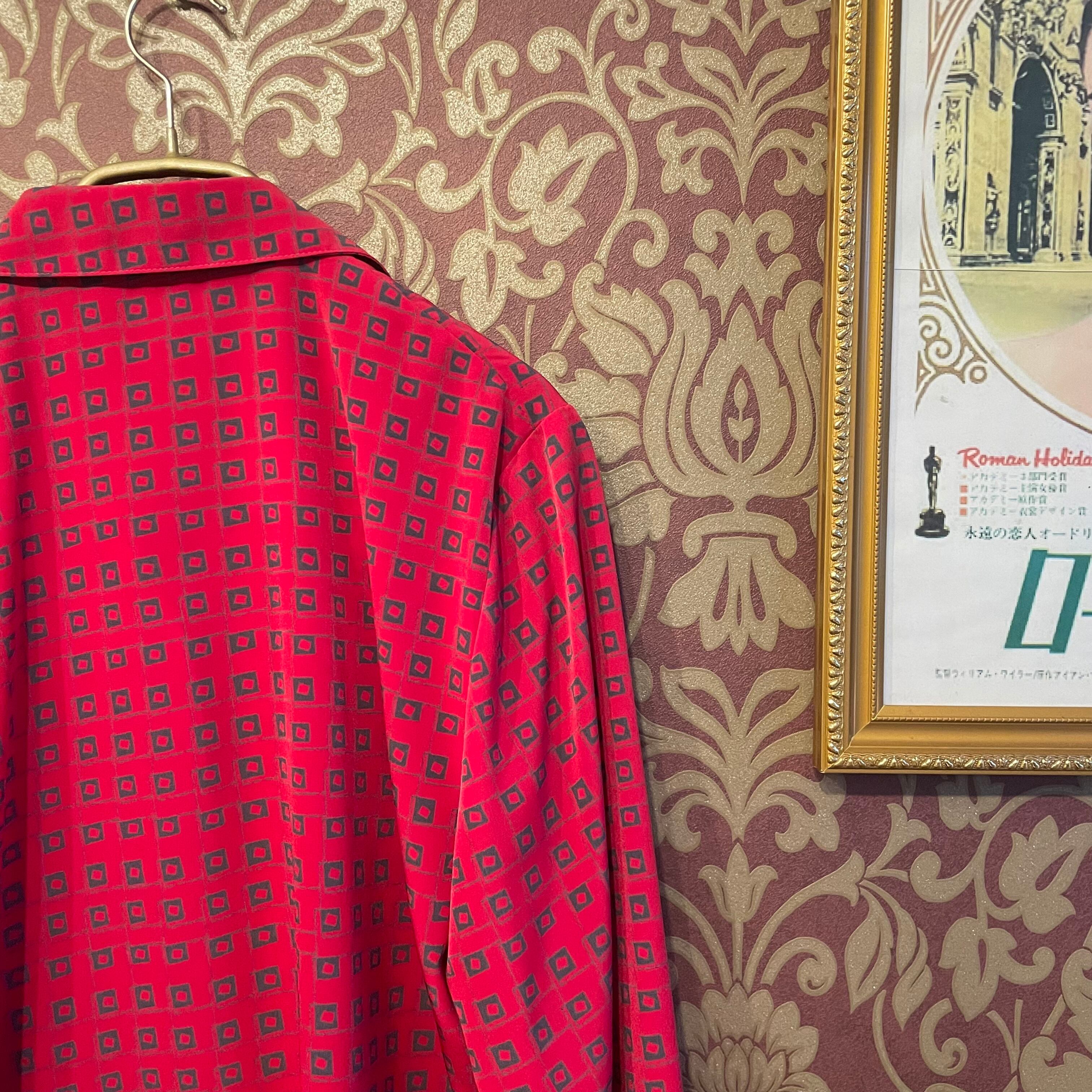 ワインレッドをベースに紺のスクエア柄のレトロなブラウスです。