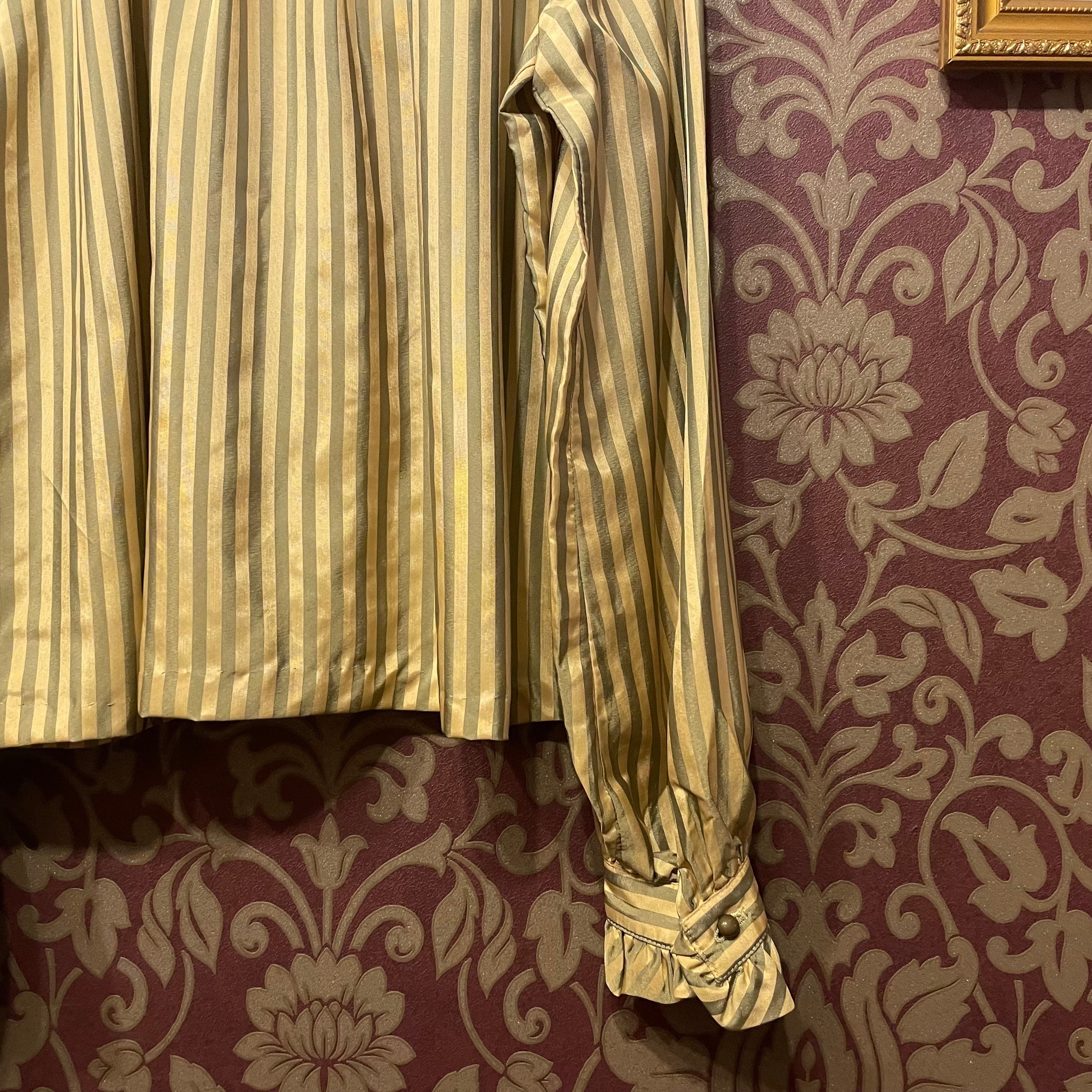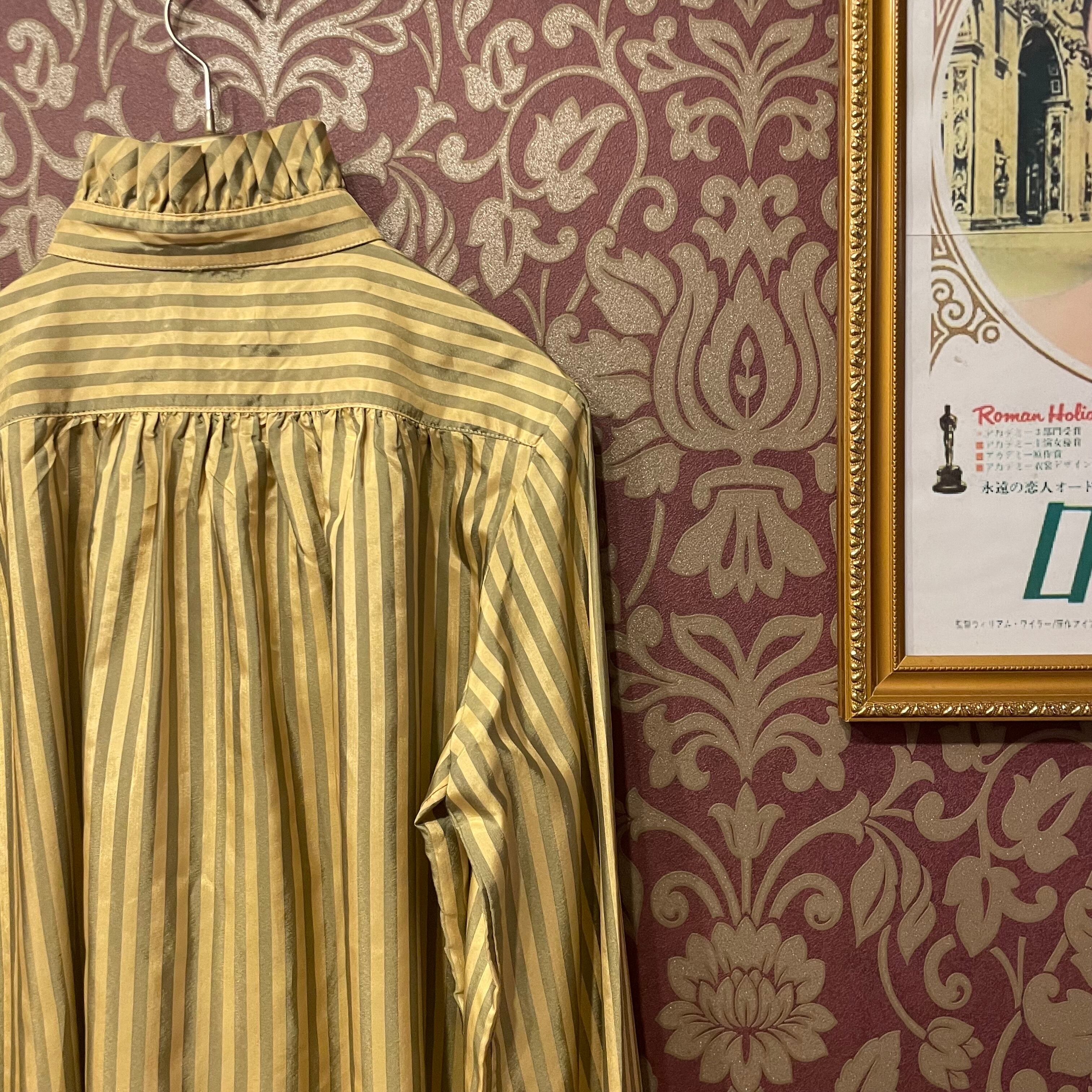 高貴なフリル付きスタンドカラーと、フロントのフリル、袖口のフリルなど崇高な中にもカラーリングで遊び心があり、ピエロのような独特さを感じる一着です。