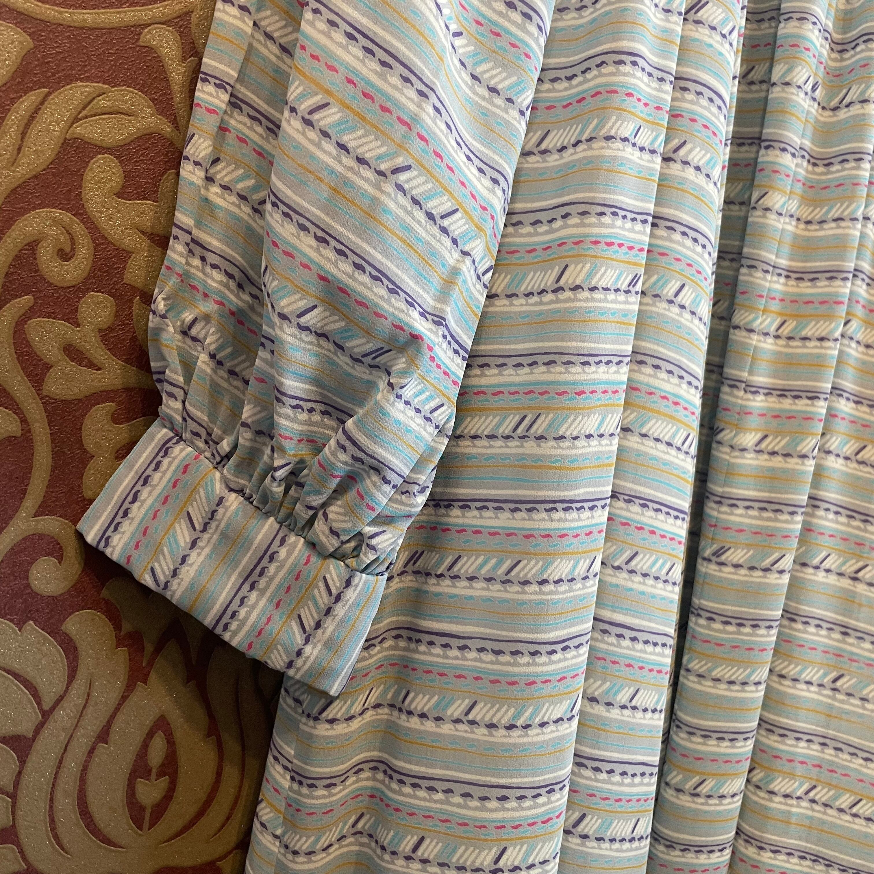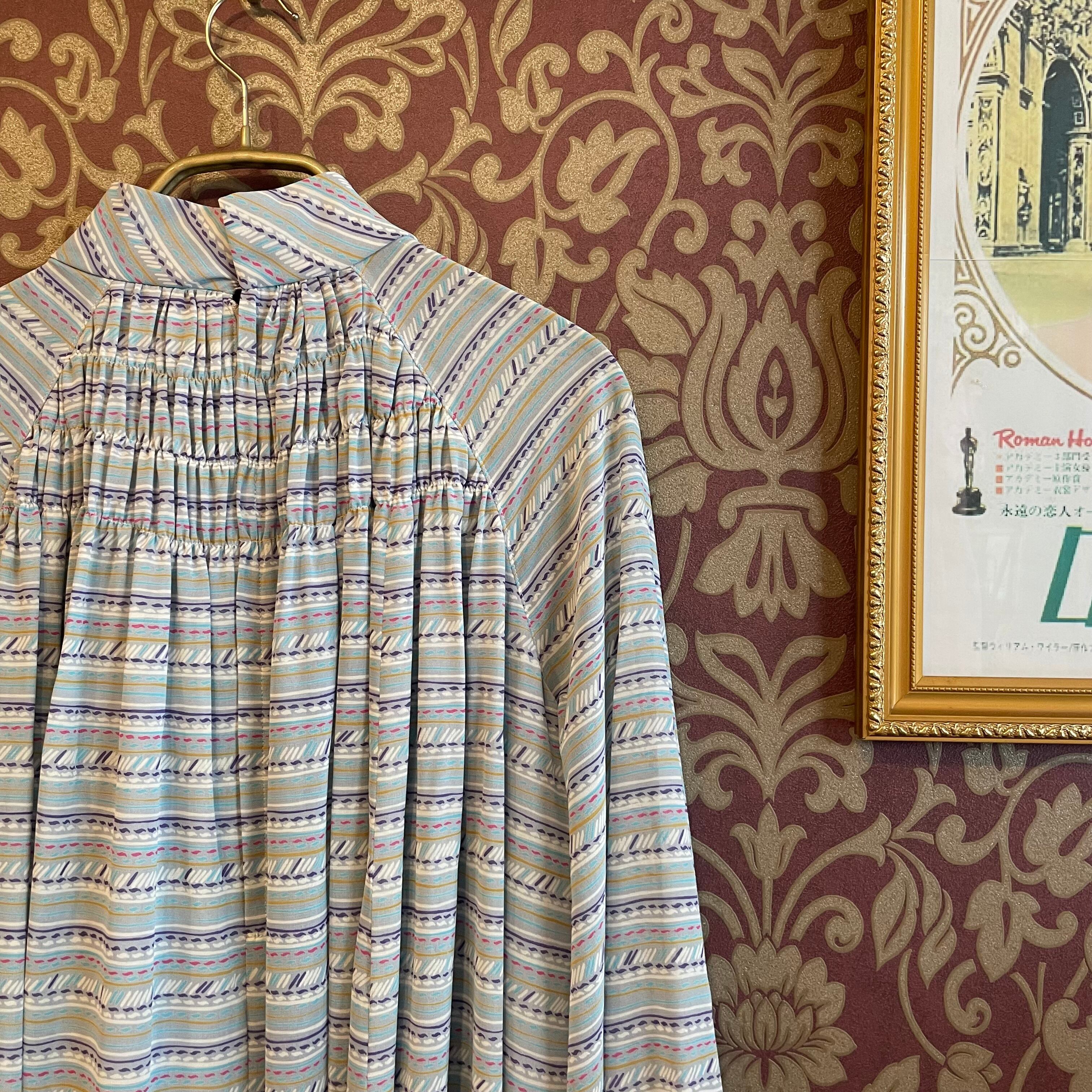 水色をベースに、ピンク、白、紫、水色、黄色のマルチボーダー柄ワンピースです。