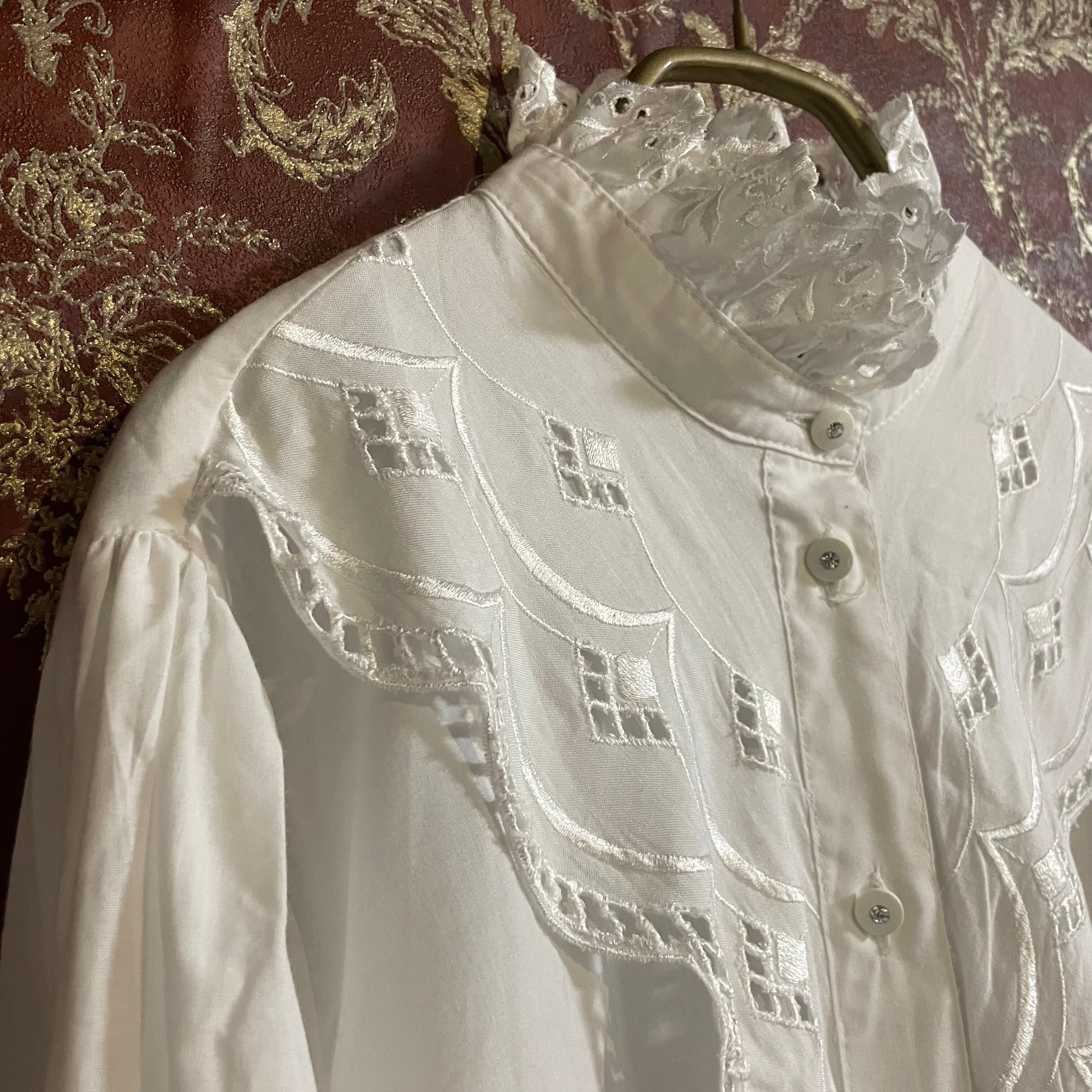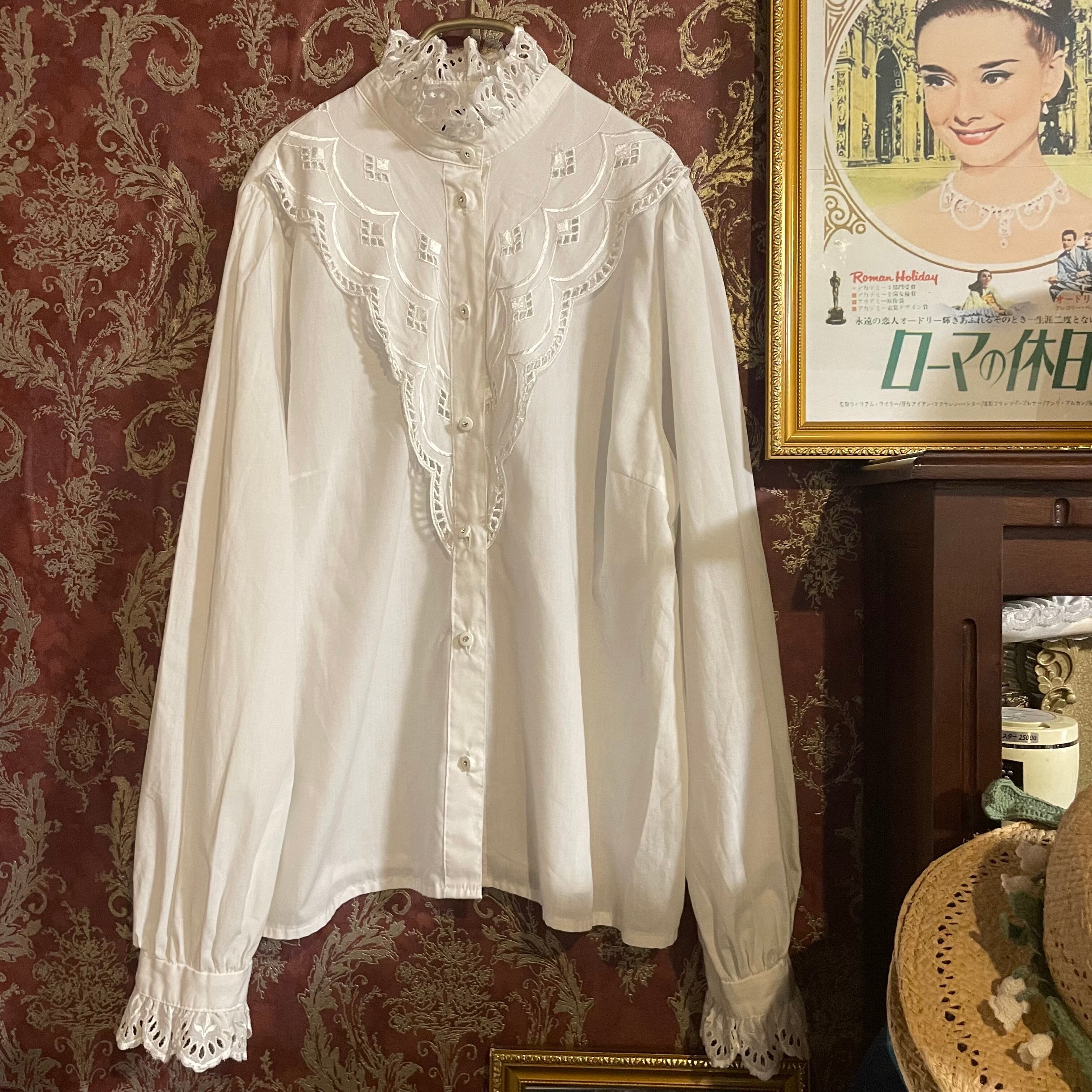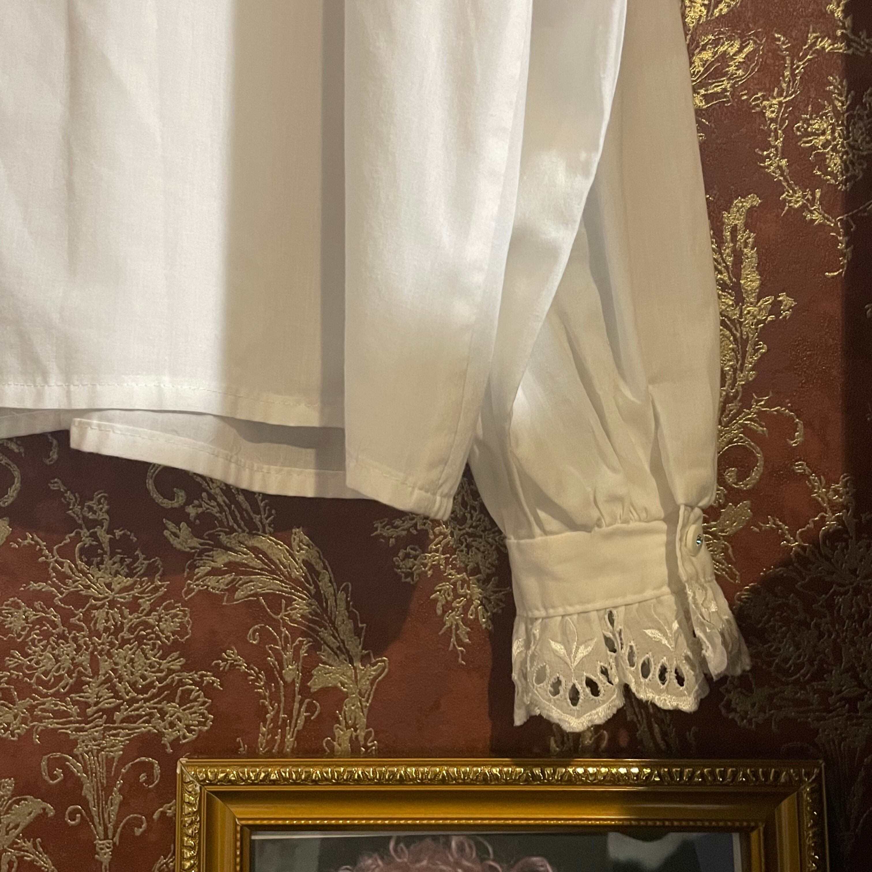 襟とフロント、袖口に大ぶりのレースが沢山使われた贅沢なデザインです。