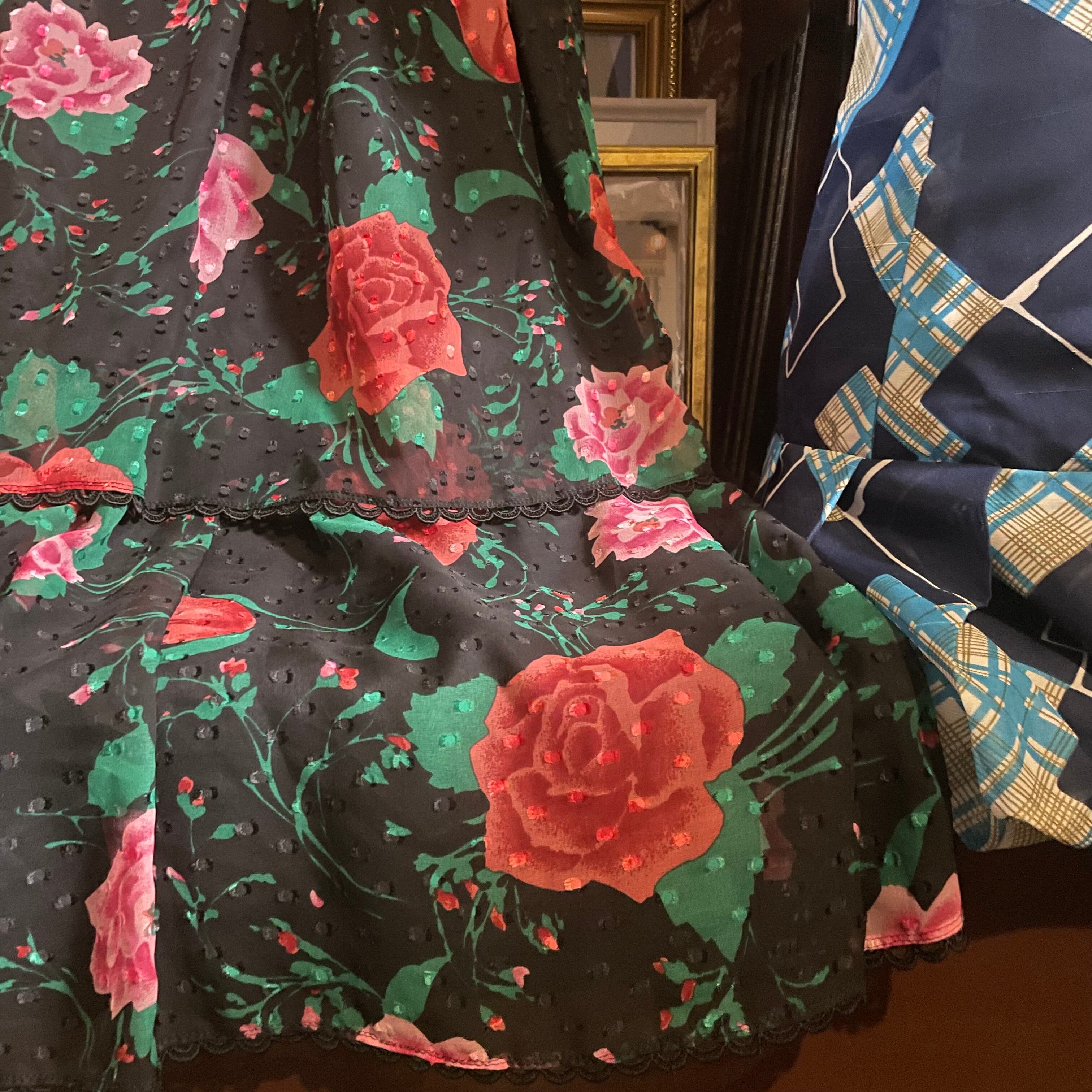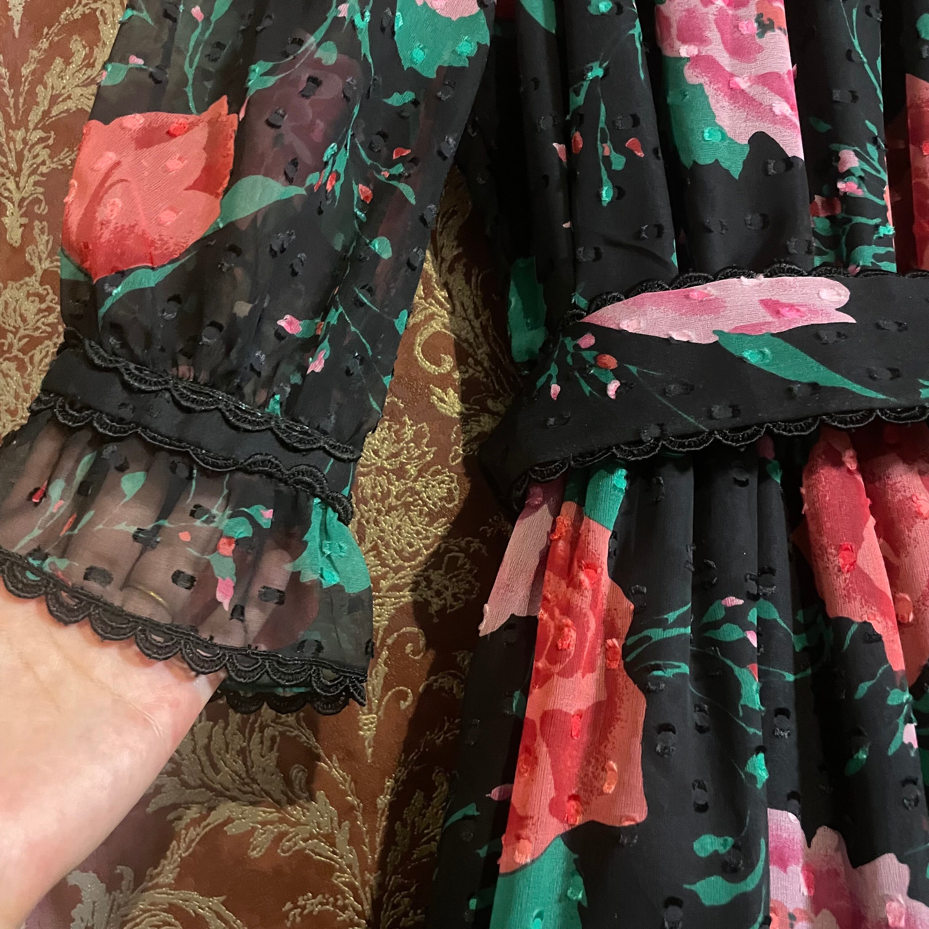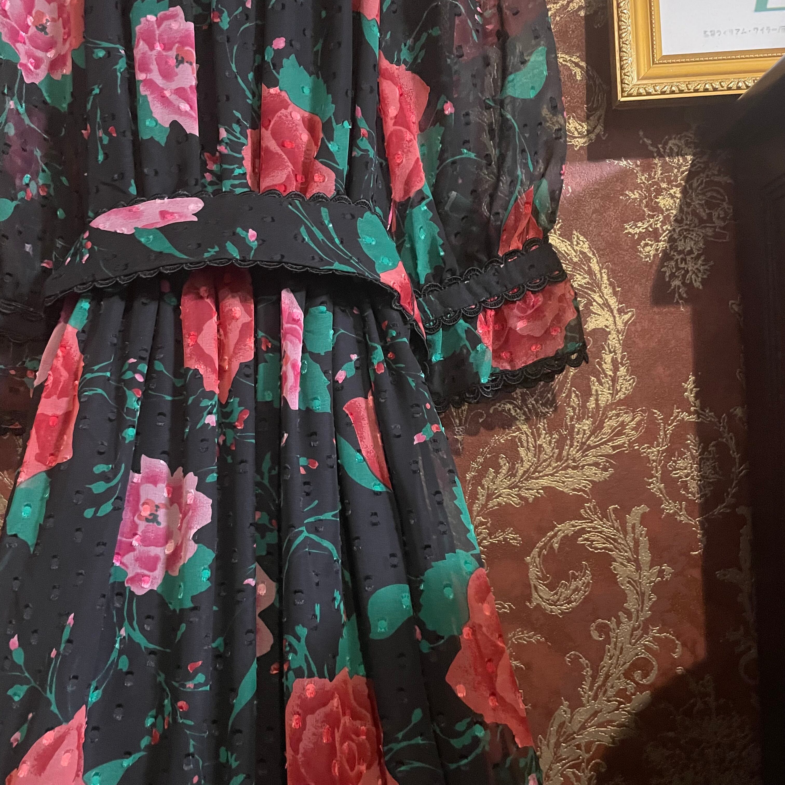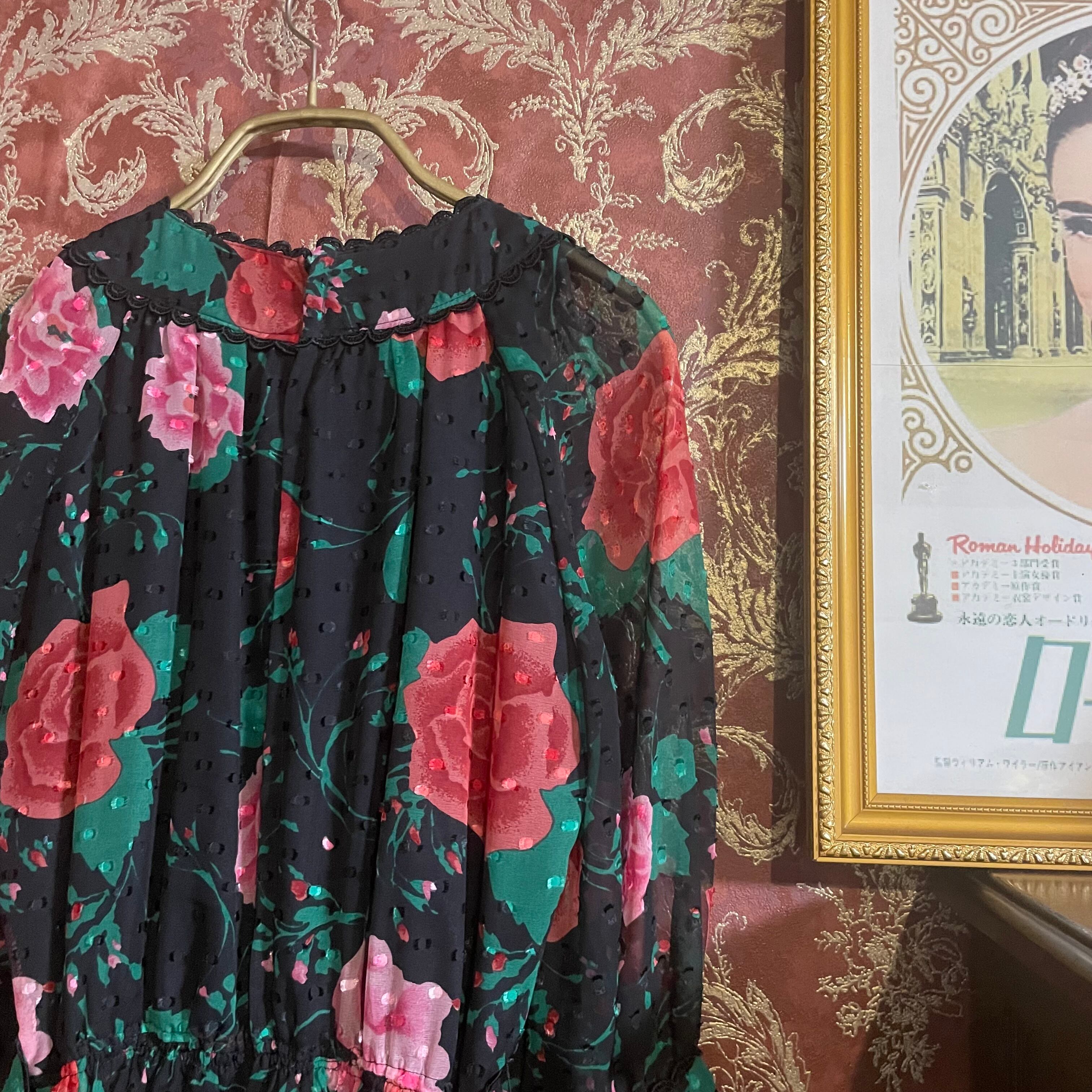 黒をベースに鮮やかなバラ柄のワンピースです。