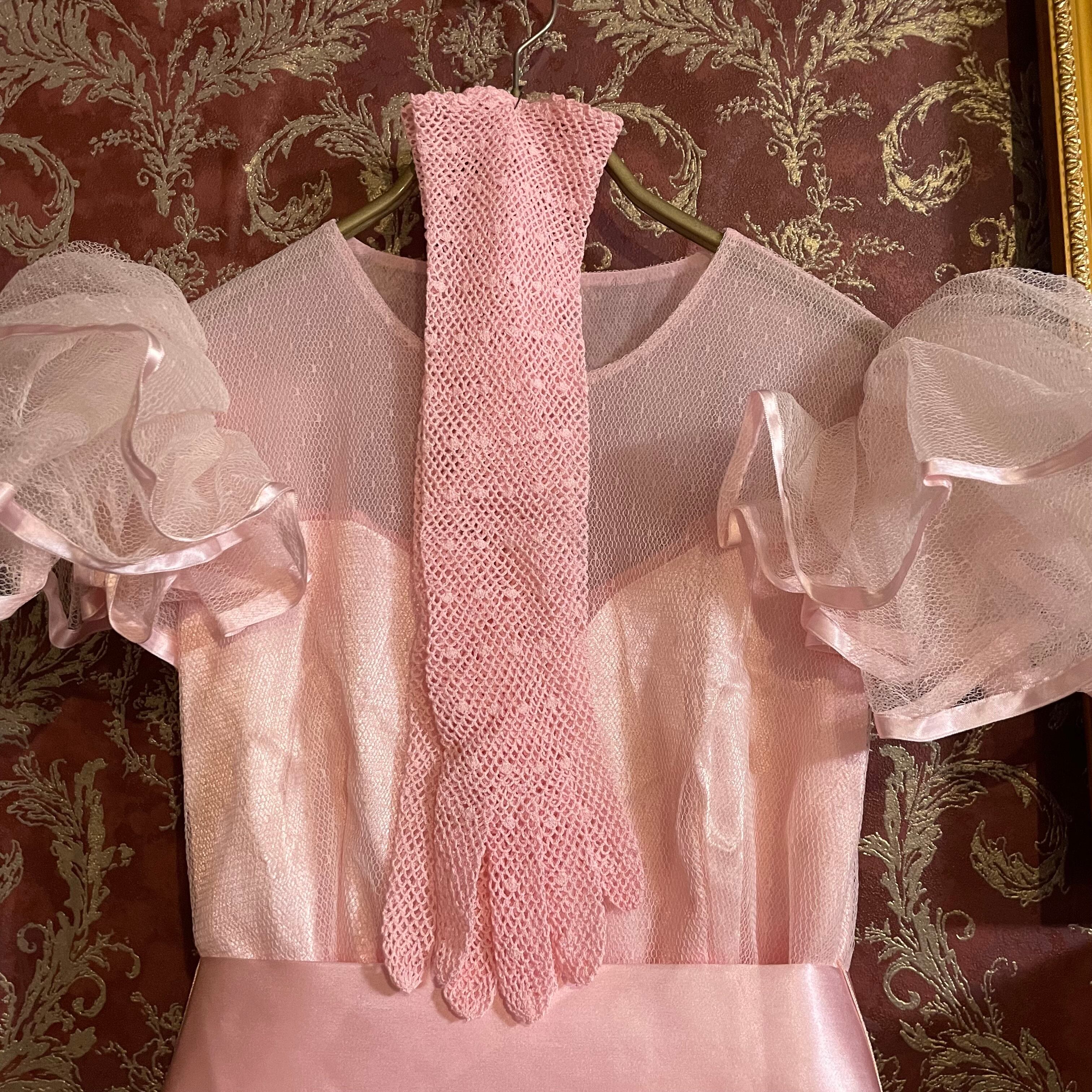 可愛らしいベビーピンク色のドレスとかぎ針編みのグローブのセットです。