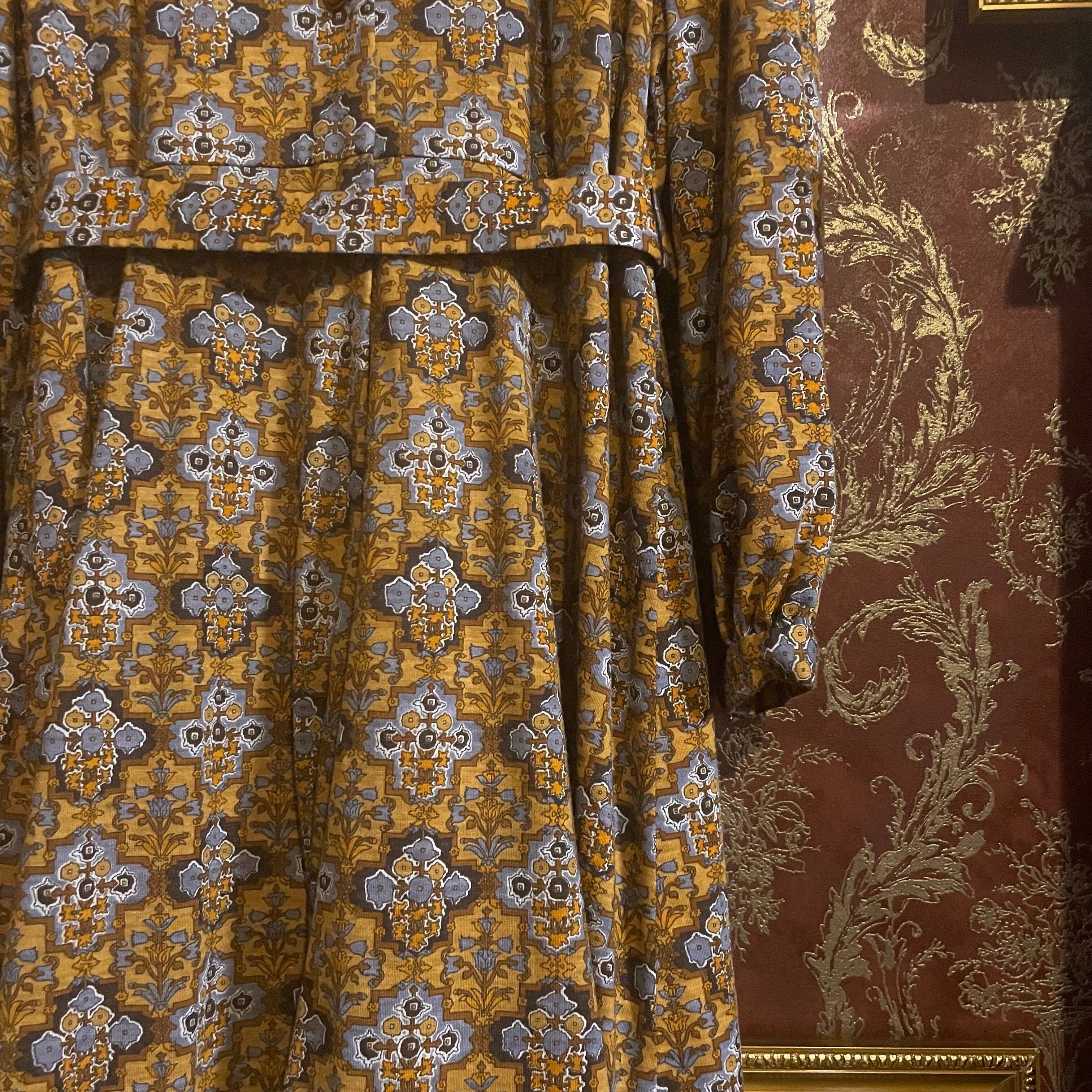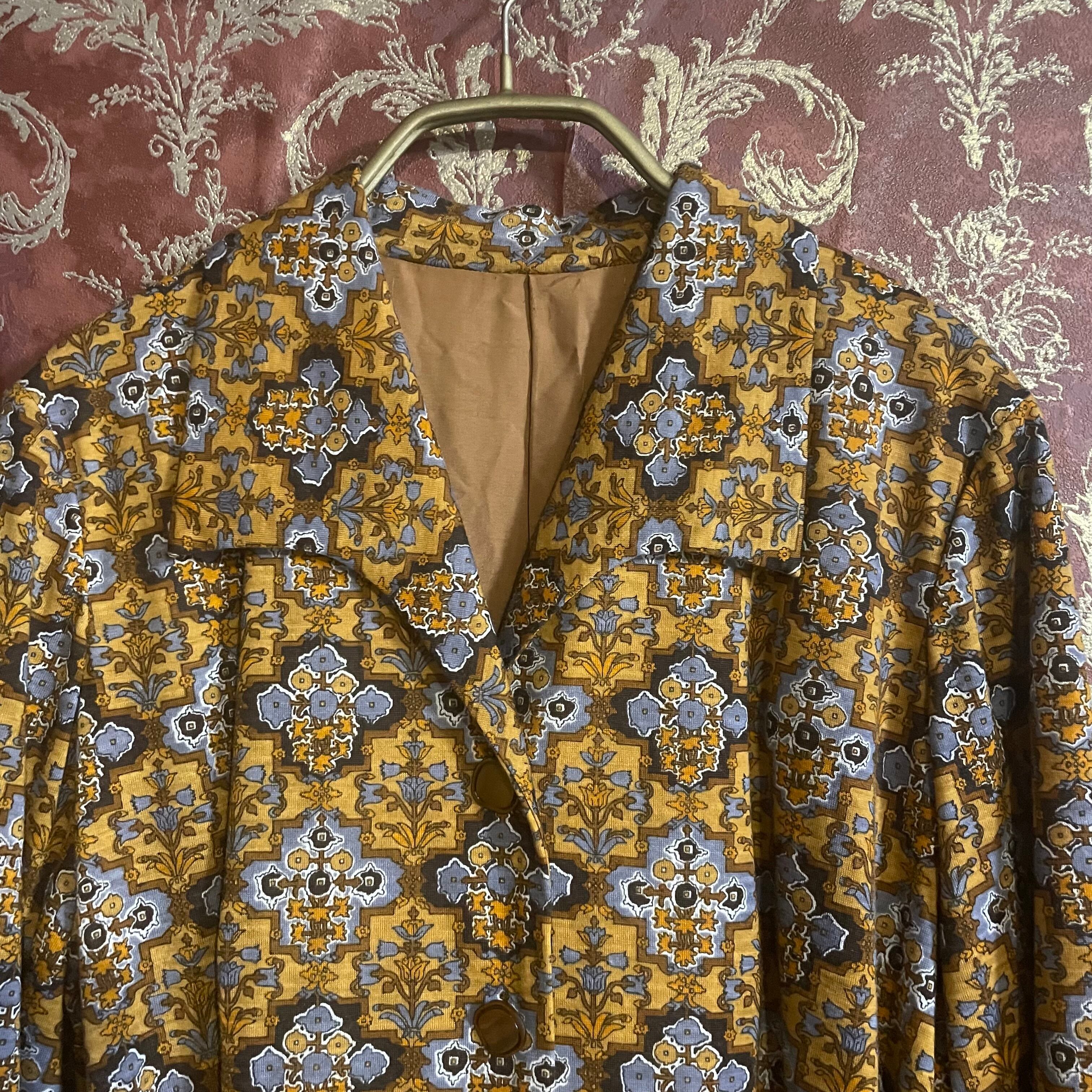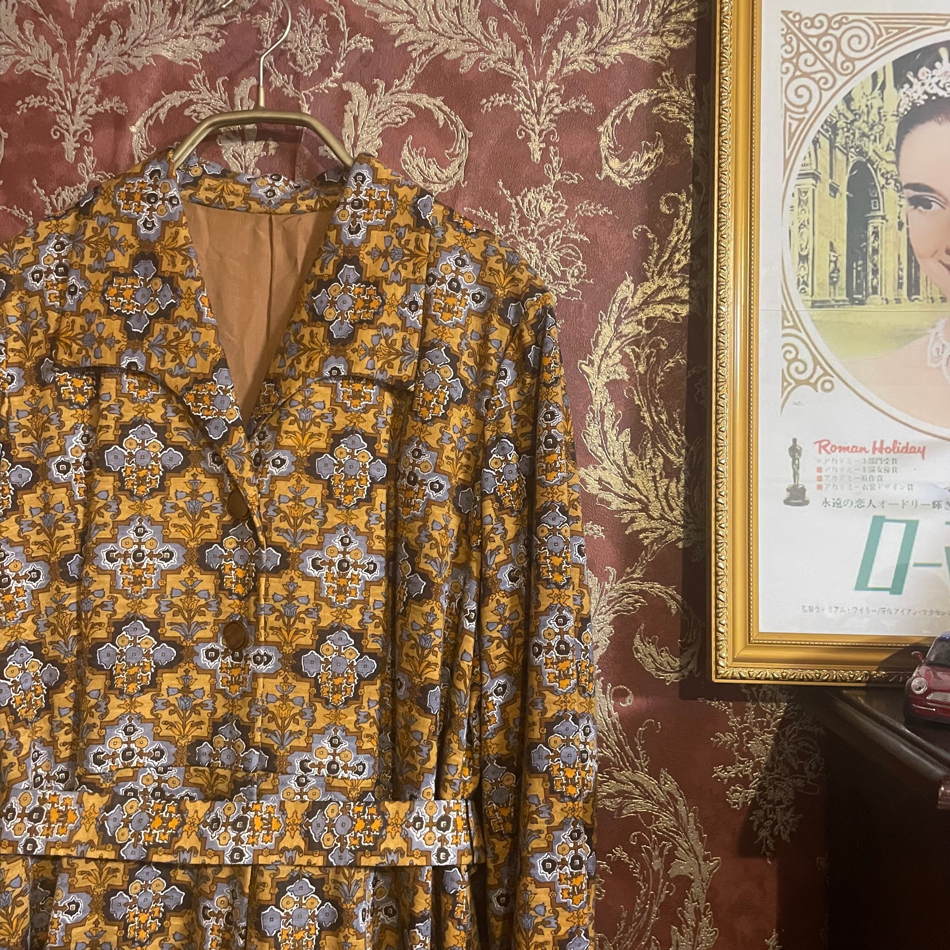 オレンジに近い黄土色をベースに紫と茶色のレトロな柄のワンピースです。