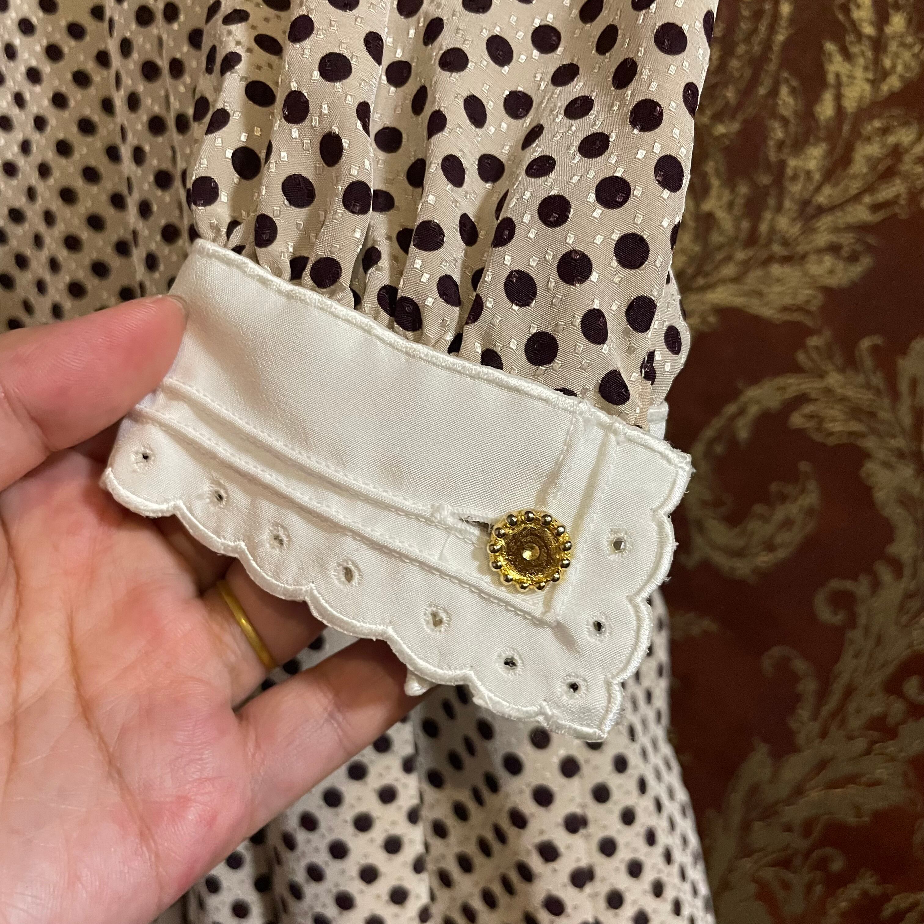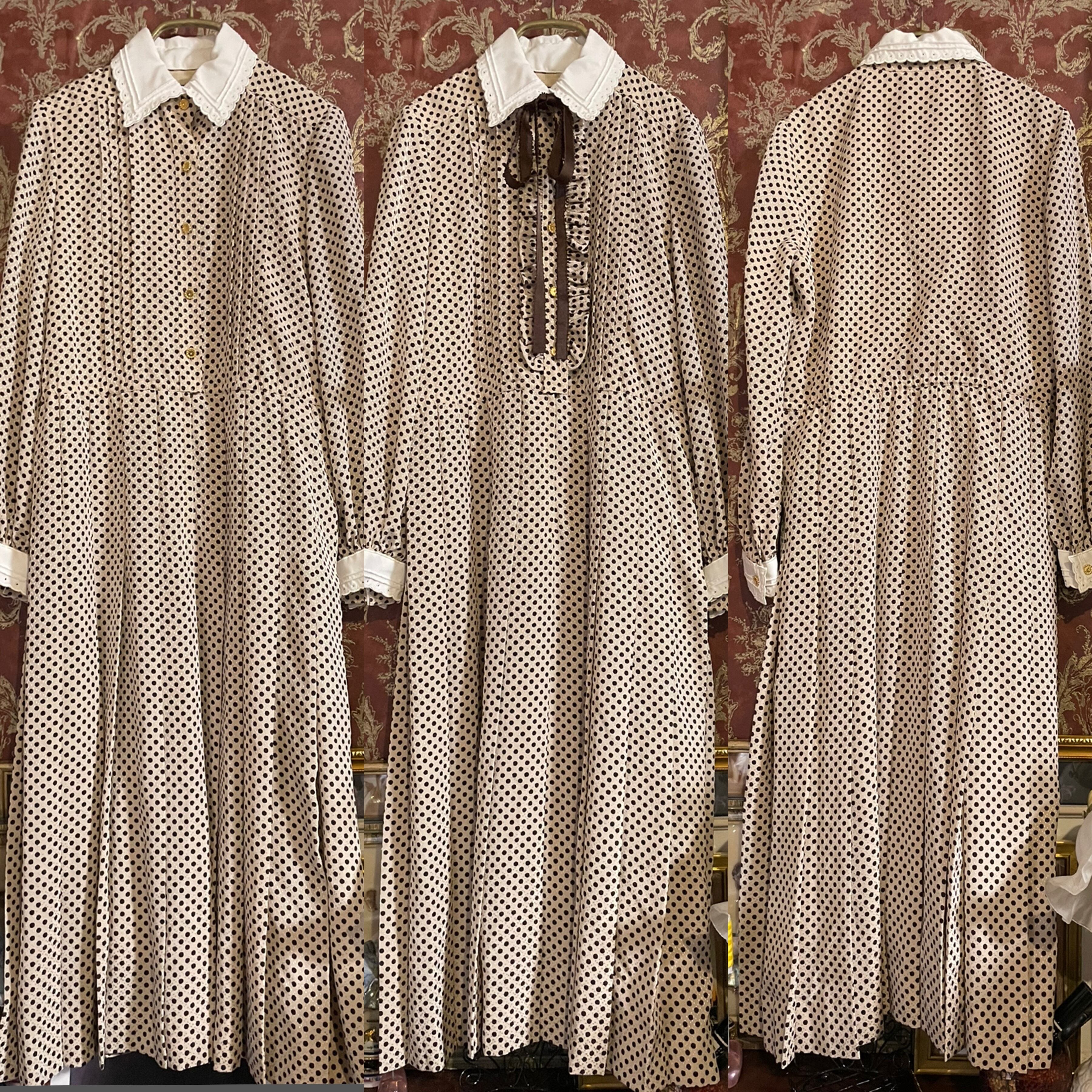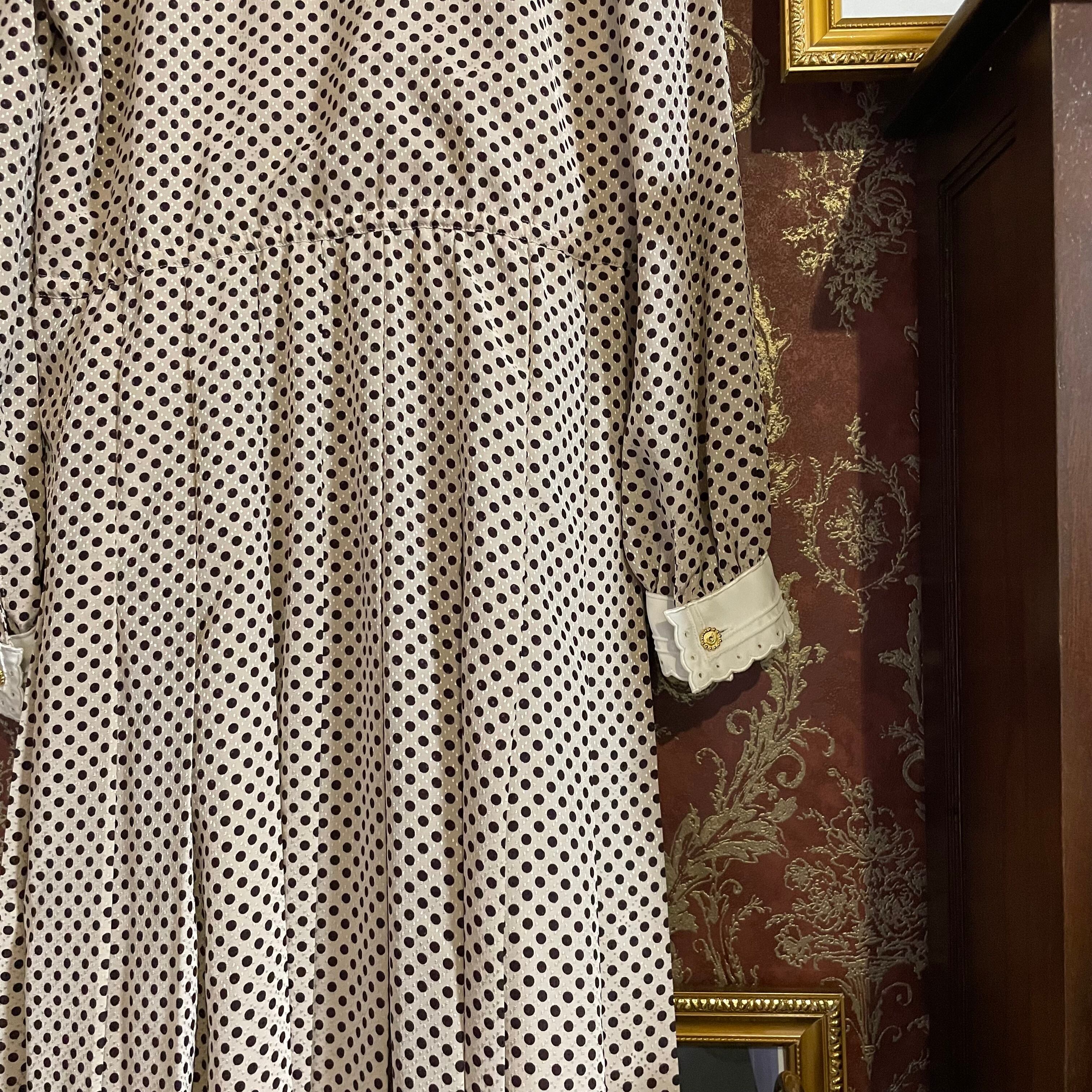 ベージュをベースに、茶色のドット柄のレトロガーリーなワンピースです。