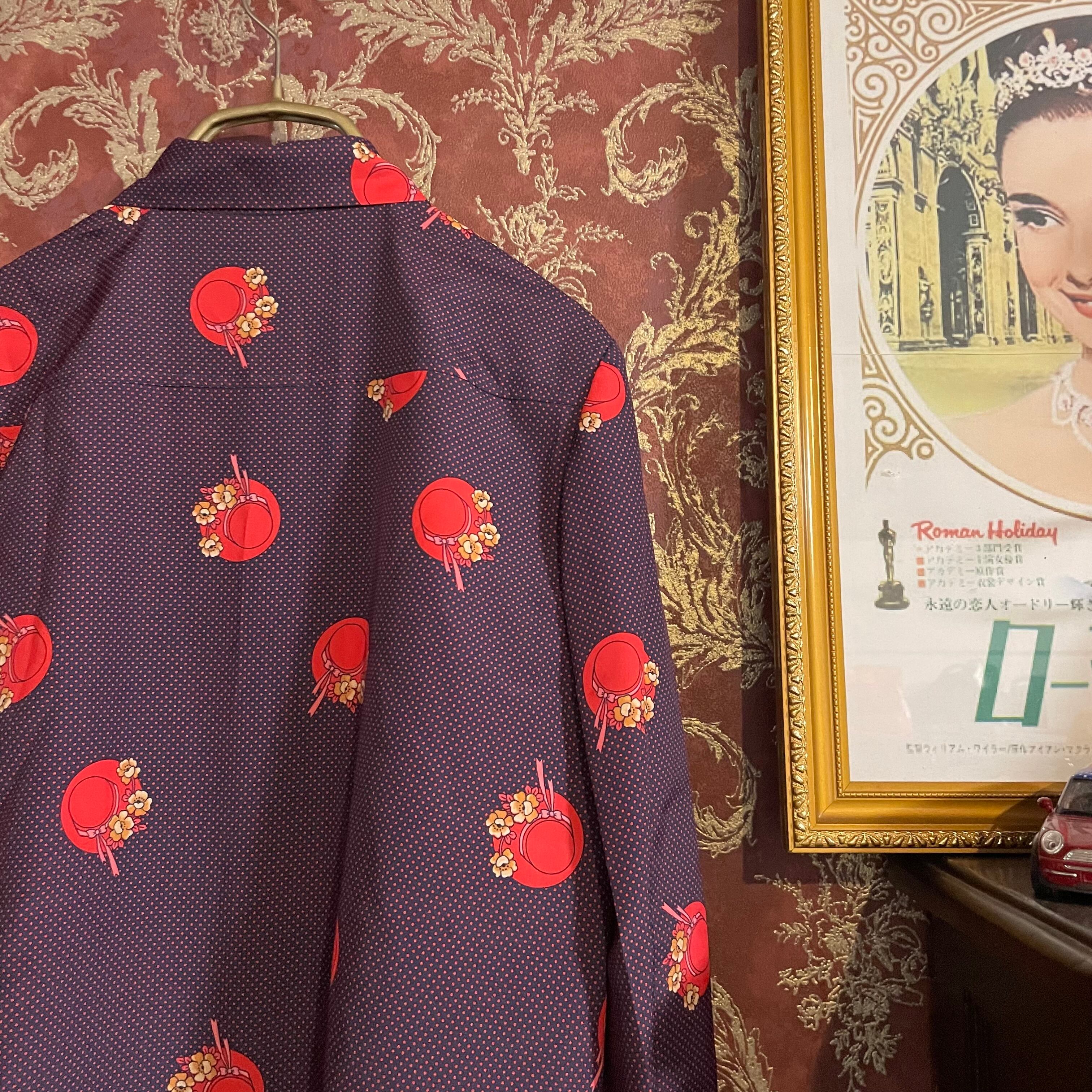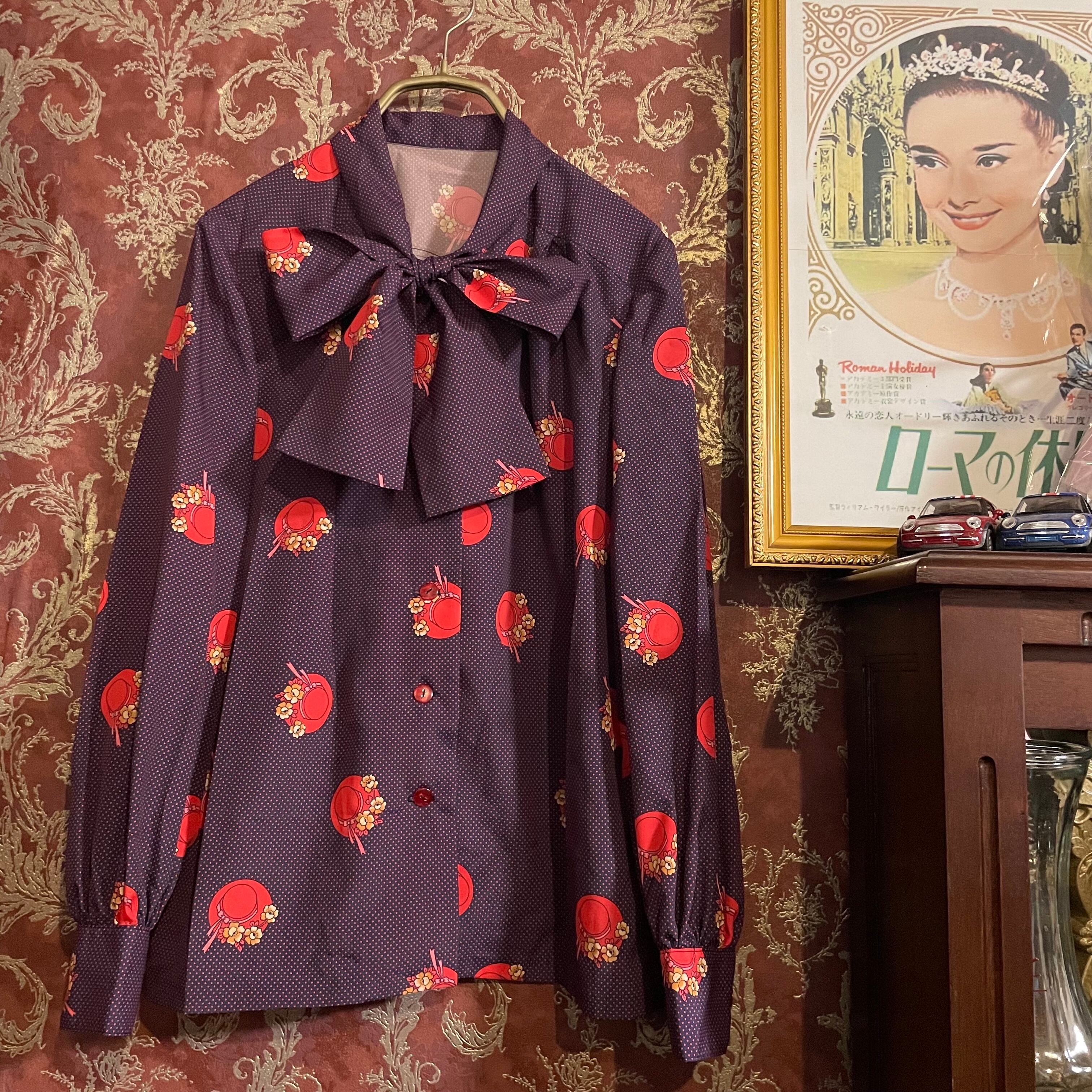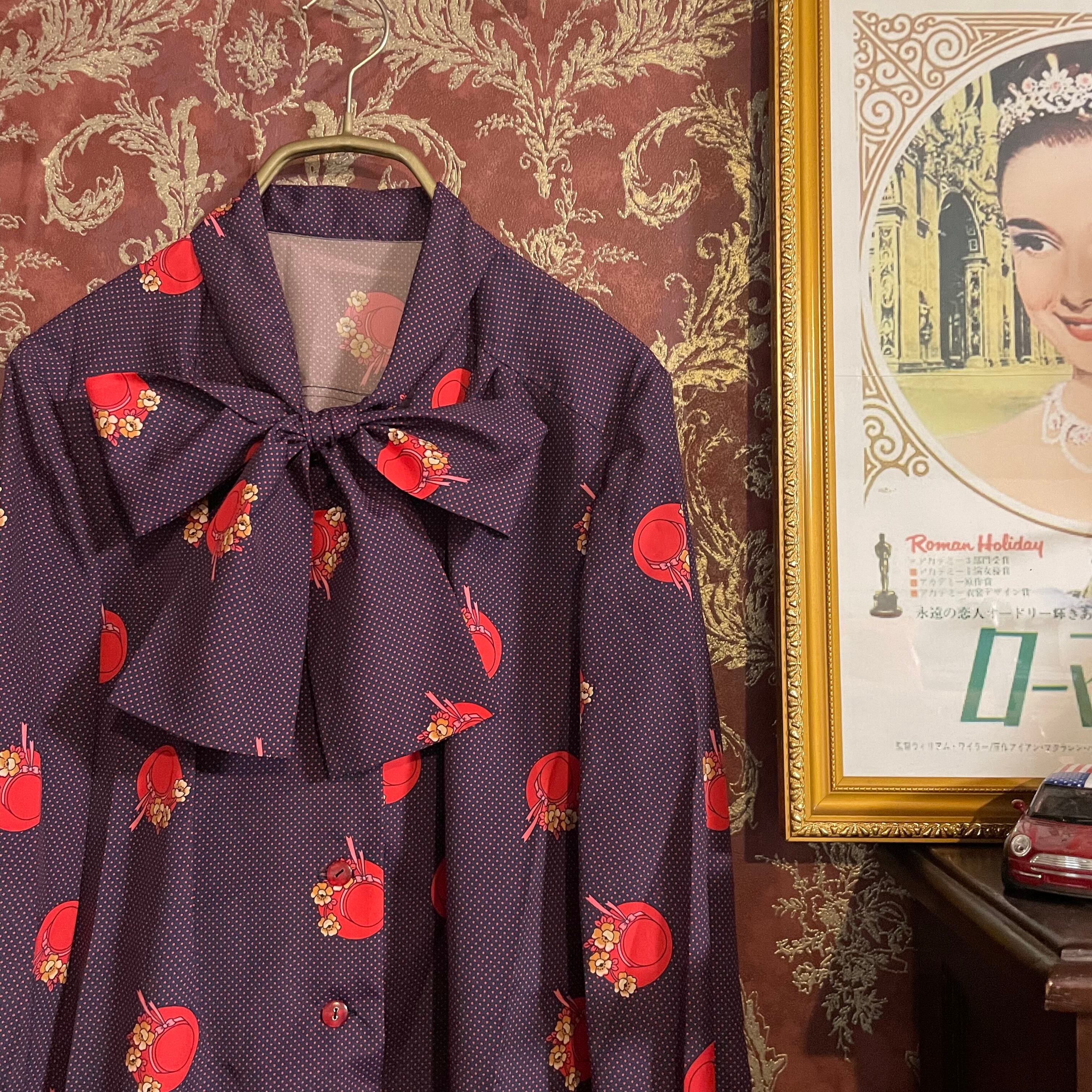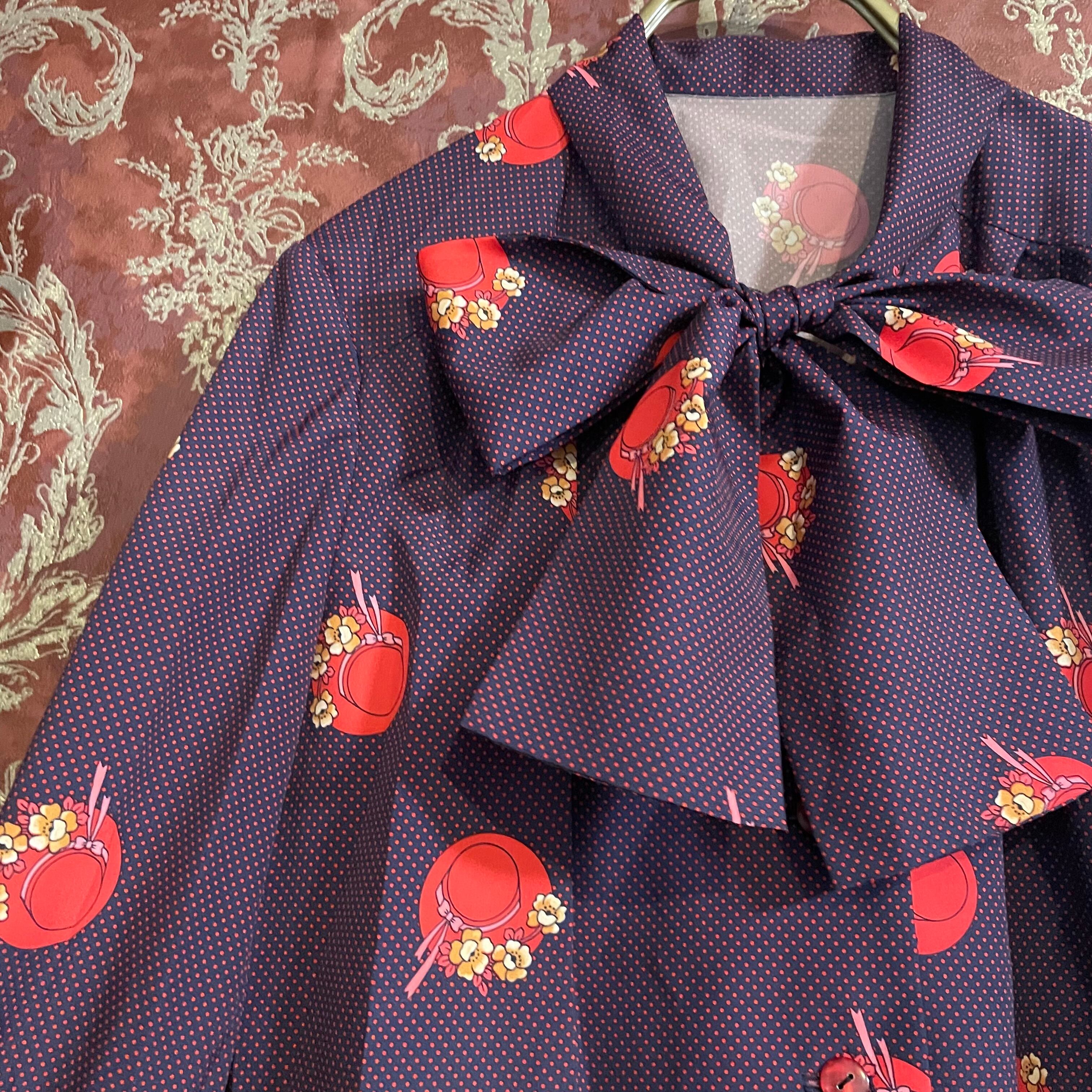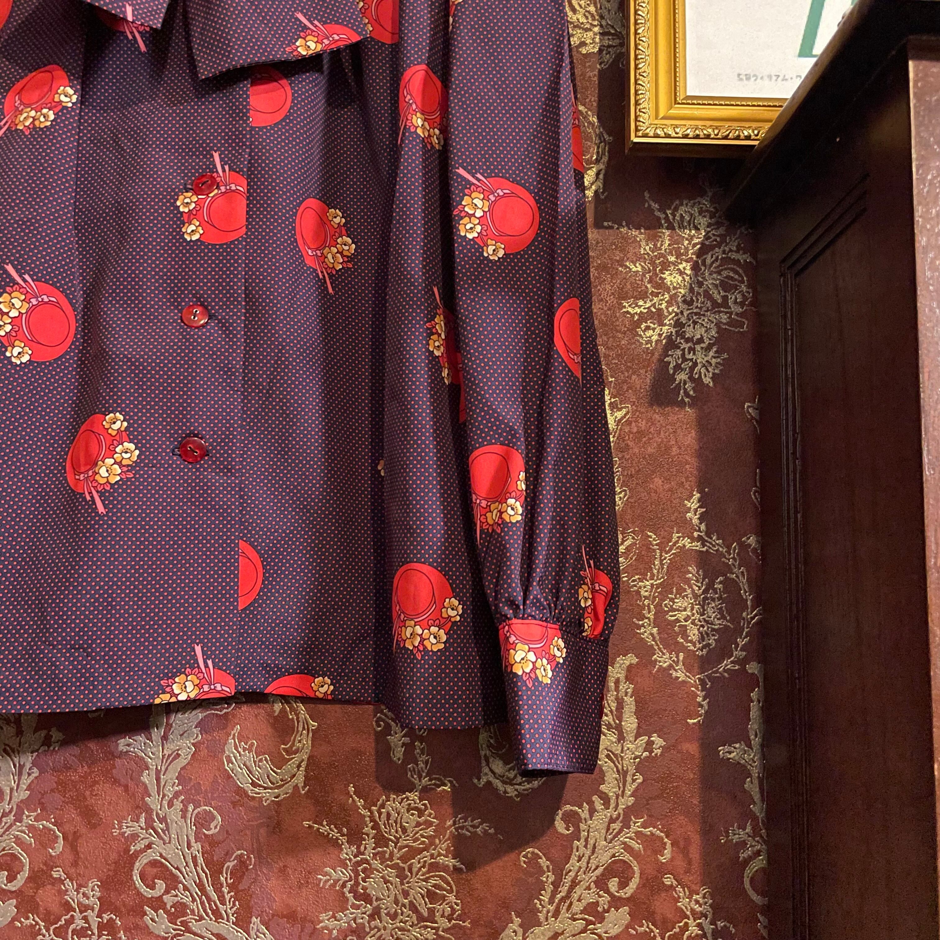 紺をベースに赤のピンドット柄とクラシカルな帽子柄のブラウスです。